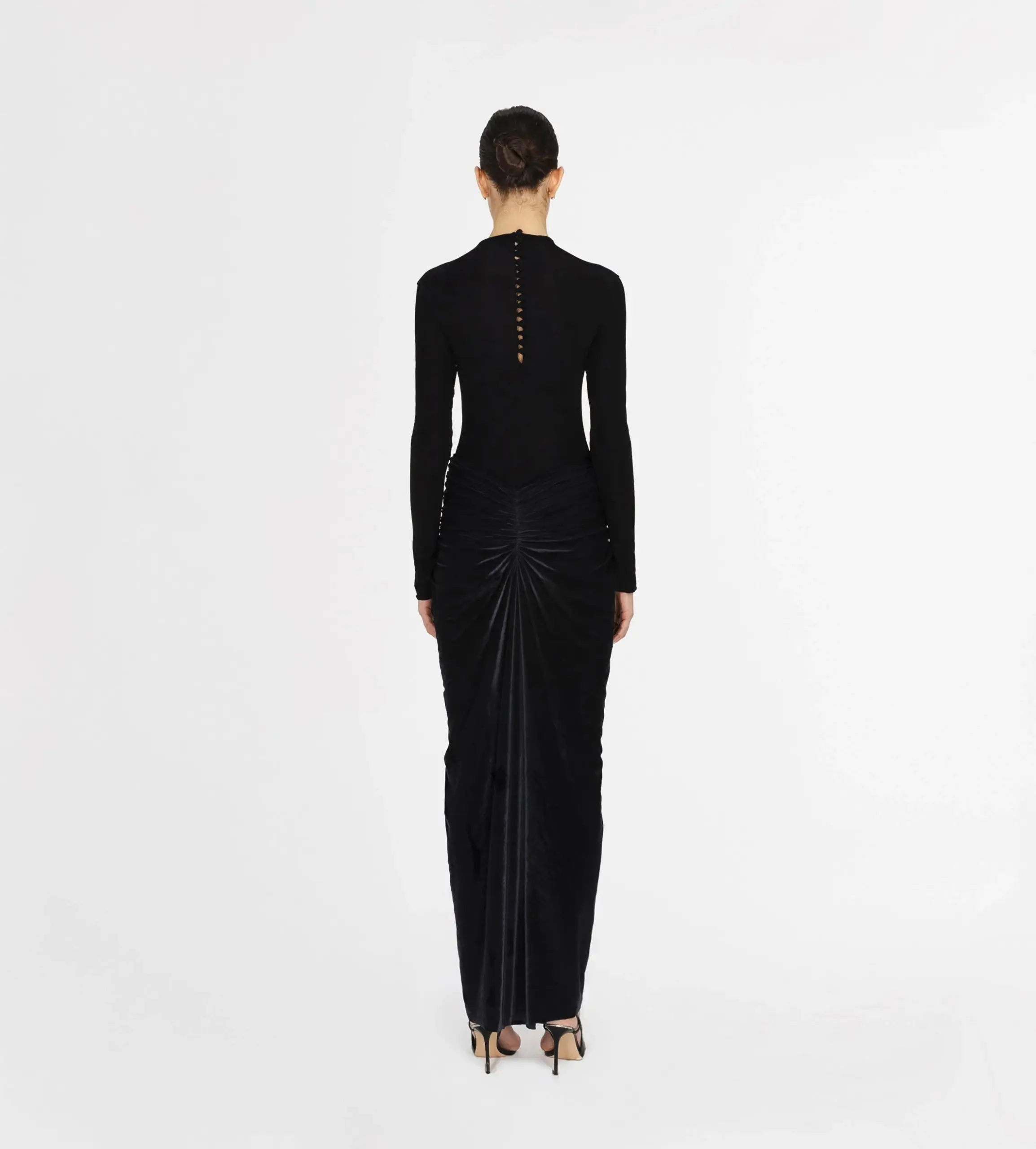 Ovo je haljina koja ne traži nakit ili kompliciran styling, već je sama čitav look. Crna boja naglašava njezinu profinjenost, dok skulpturalna silueta osigurava da vas nitko ne može ne primijetiti.
