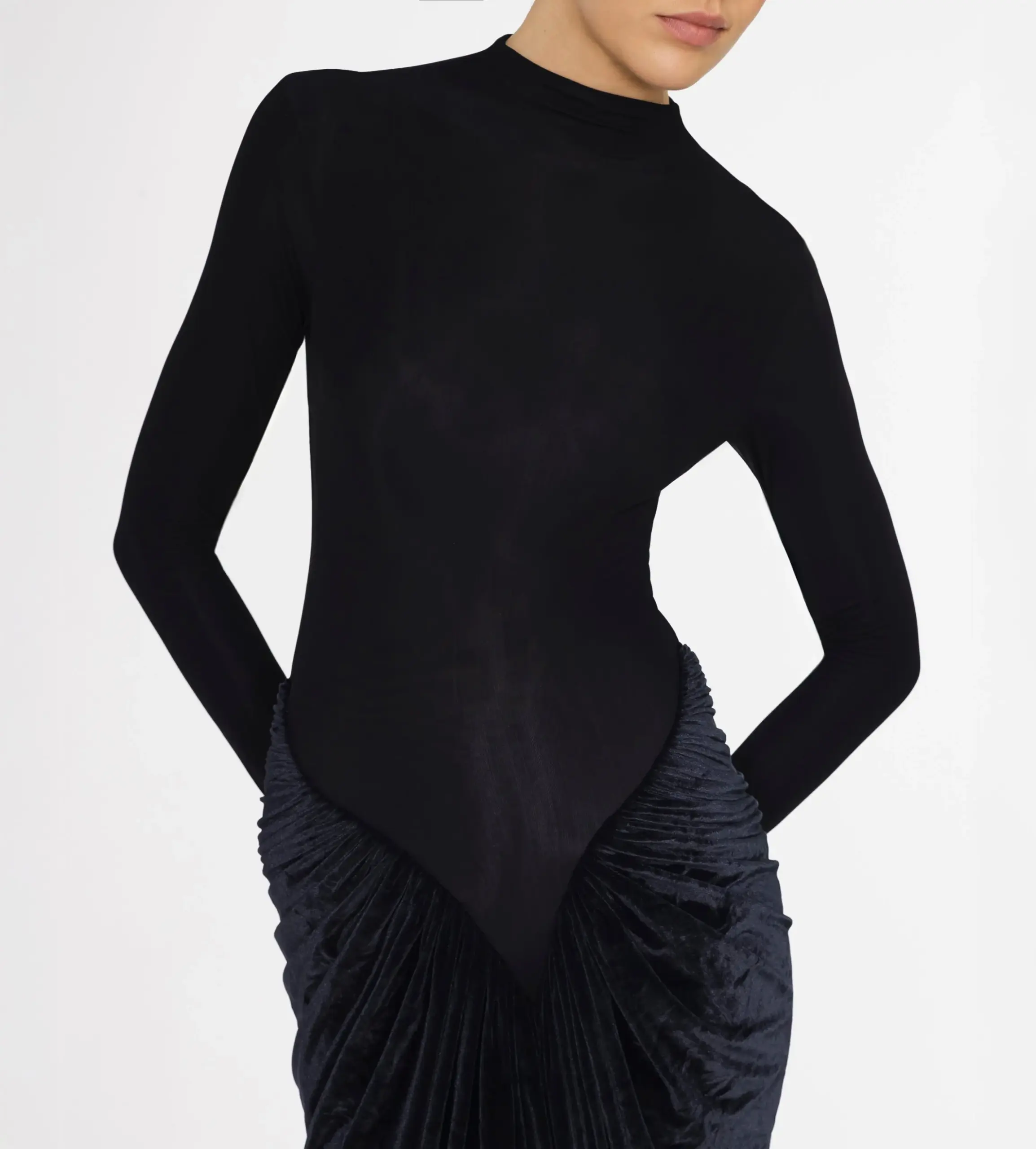 Na prvi pogled, haljina djeluje vrlo jednostavno: crni, glatki, potpuno pripijeni gornji dio, dugački rukavi i visoki ovratnik. No tek kad se zagledate u siluetu, otkriva se njezina snaga. Precizno oblikovan kroj prati liniju tijela i naglašava je na najsofisticiraniji način, bez viška detalja.