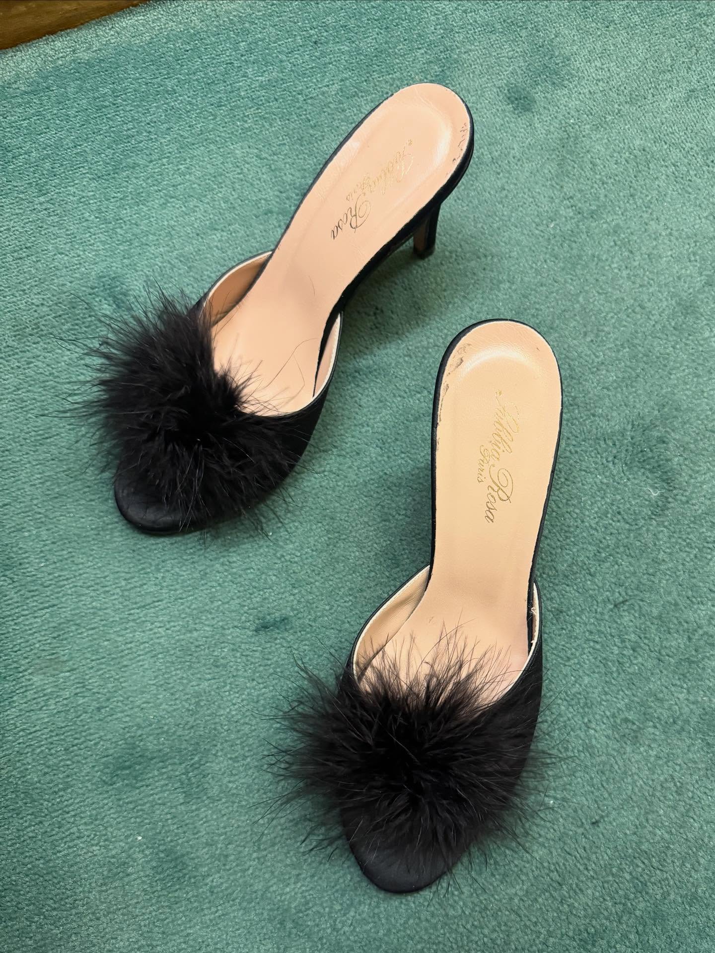 Posebnu pažnju privlače papuče s kitten heel potpeticom ukrašene perjem, izrađene od satena, koje izgledaju kao idealne statement cipele za neka svečana događanja.