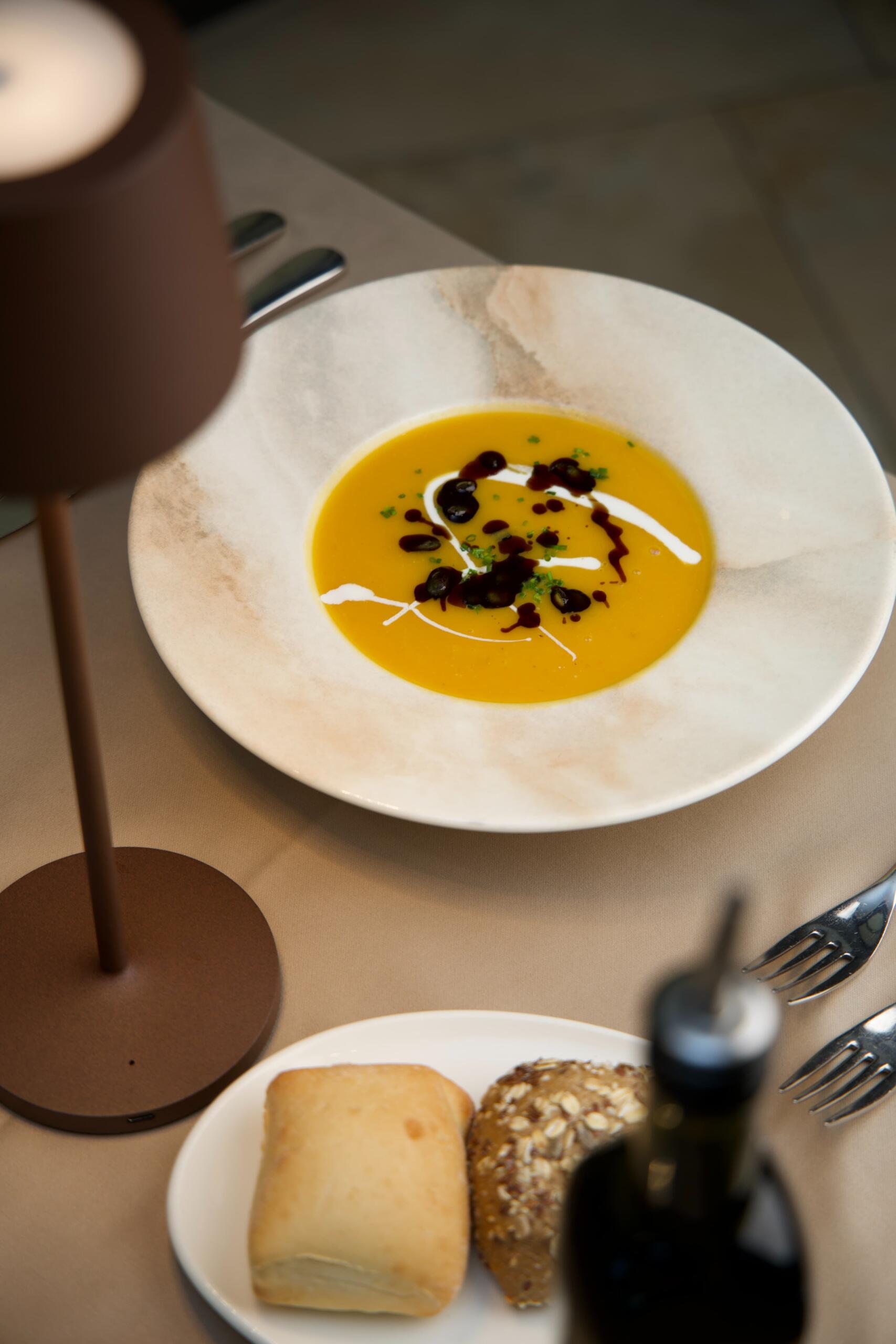 Središte novog koncepta čini kuhinja koja jasno komunicira mediteranski identitet. Posebna pažnja posvećena je balansu. Ponuda započinje hladnim i toplim predjelima koji pozivaju na zajednički stol – od selekcija domaćih pršuta, kobasica, sireva i mariniranih maslina, preko bruschetta, punjene focaccije i pikantnih kozica, do profinjenih carpaccia od kraljevskih škampa i angus govedine te klasičnog tatarskog bifteka. Jelovnik se nastavlja juhama i rižotima koji prate ritam godišnjih doba, domaćim tjesteninama i njokima u mediteranskim i talijanskim interpretacijama, dok mesni dio donosi širok raspon jela – od steakova i filet mignona do sporije pripremanih jela poput janjeće koljenice i goveđih obraza. Ljubitelji ribe pronaći će hobotnicu, tunu i filete bijele ribe, a ponudu zaokružuju salate, prilozi i deserti koji balansiraju bogate okuse. Cijeli jelovnik osmišljen je tako da gostima omogući slobodu izbora – bilo da se odluče za ležerni ručak, večeru u više slijedova ili dijeljenje jela u opuštenoj atmosferi restorana. Iskusno osoblje restorana pritom pomaže u sljubljivanju jela s vinima s bogate vinske karte.