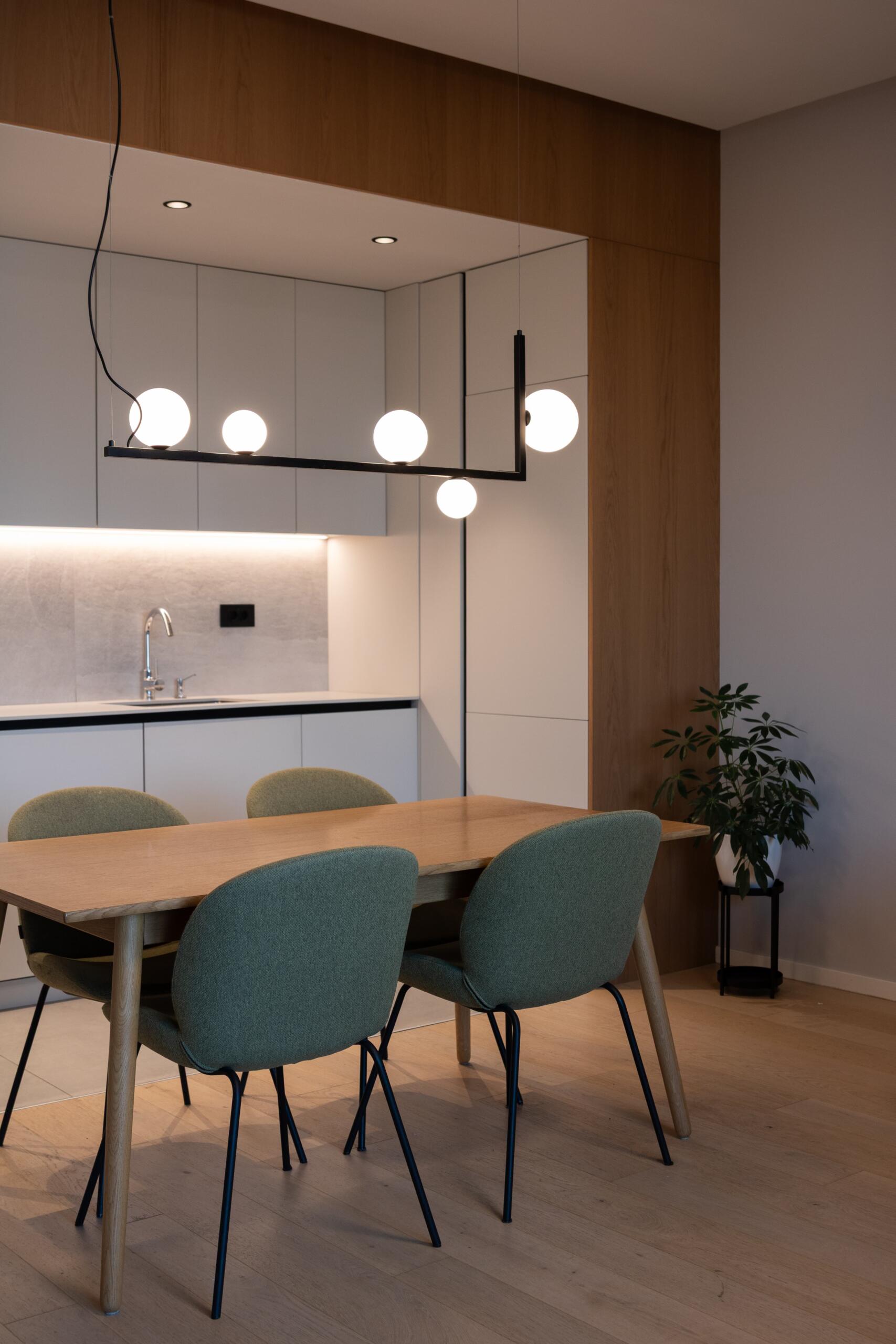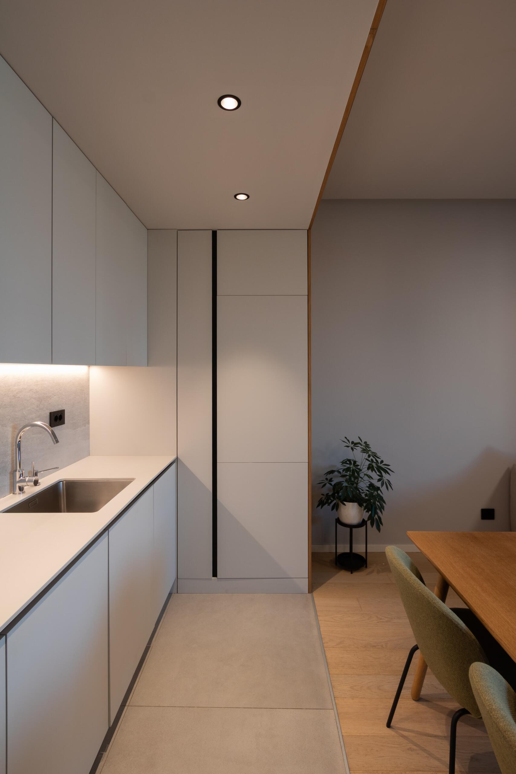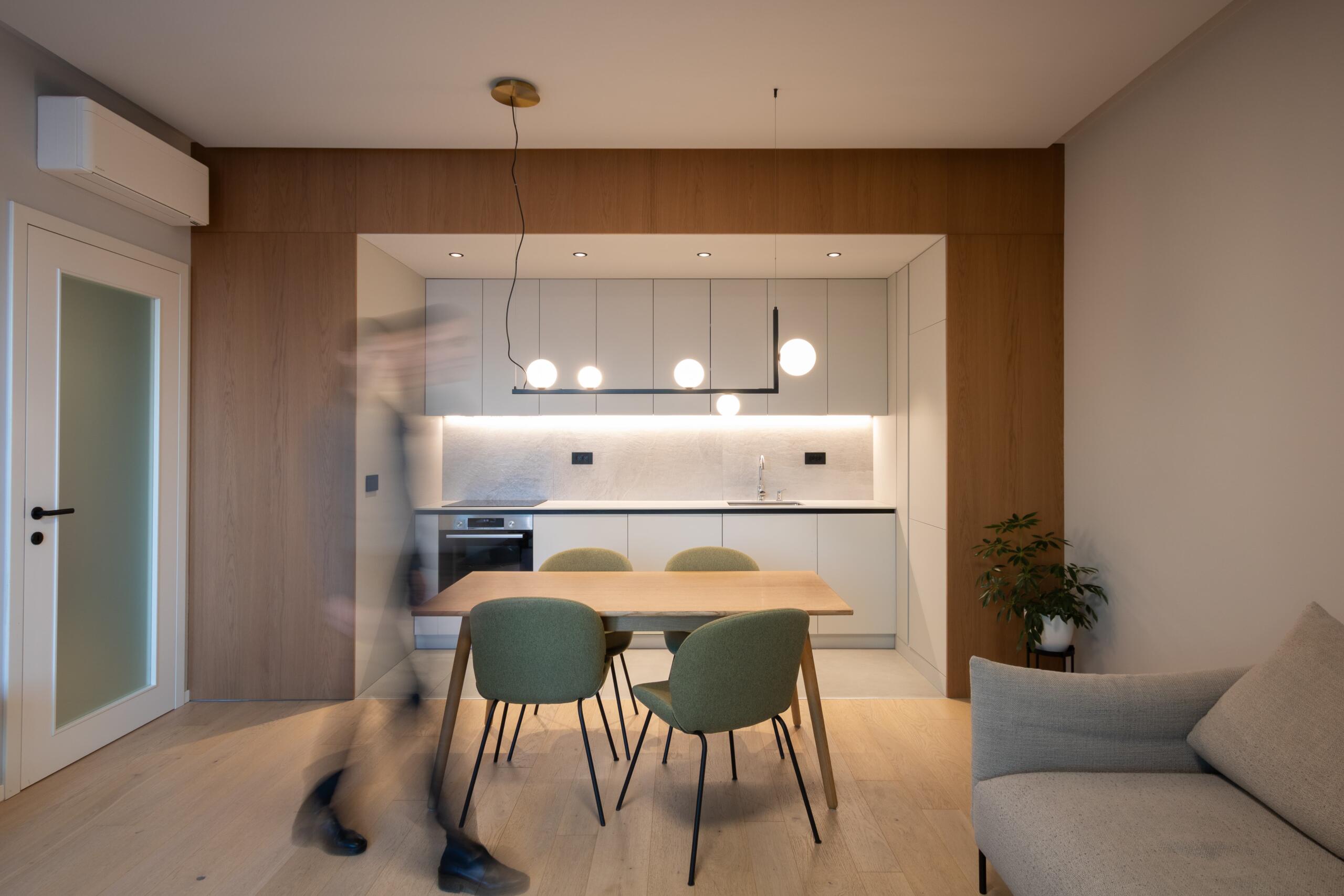 Projekt kuhinje bio je, također, pun izazova. Visoki elementi morali su sakriti ventilaciju, a spuštanje stropa u kuhinji omogućilo je postizanje estetskog efekta okvira. U boravku je, pak, smještena neobična, ali vrlo atraktivna niša s policama, koja je ujedno služila kao elegantan detalj za pohranu.