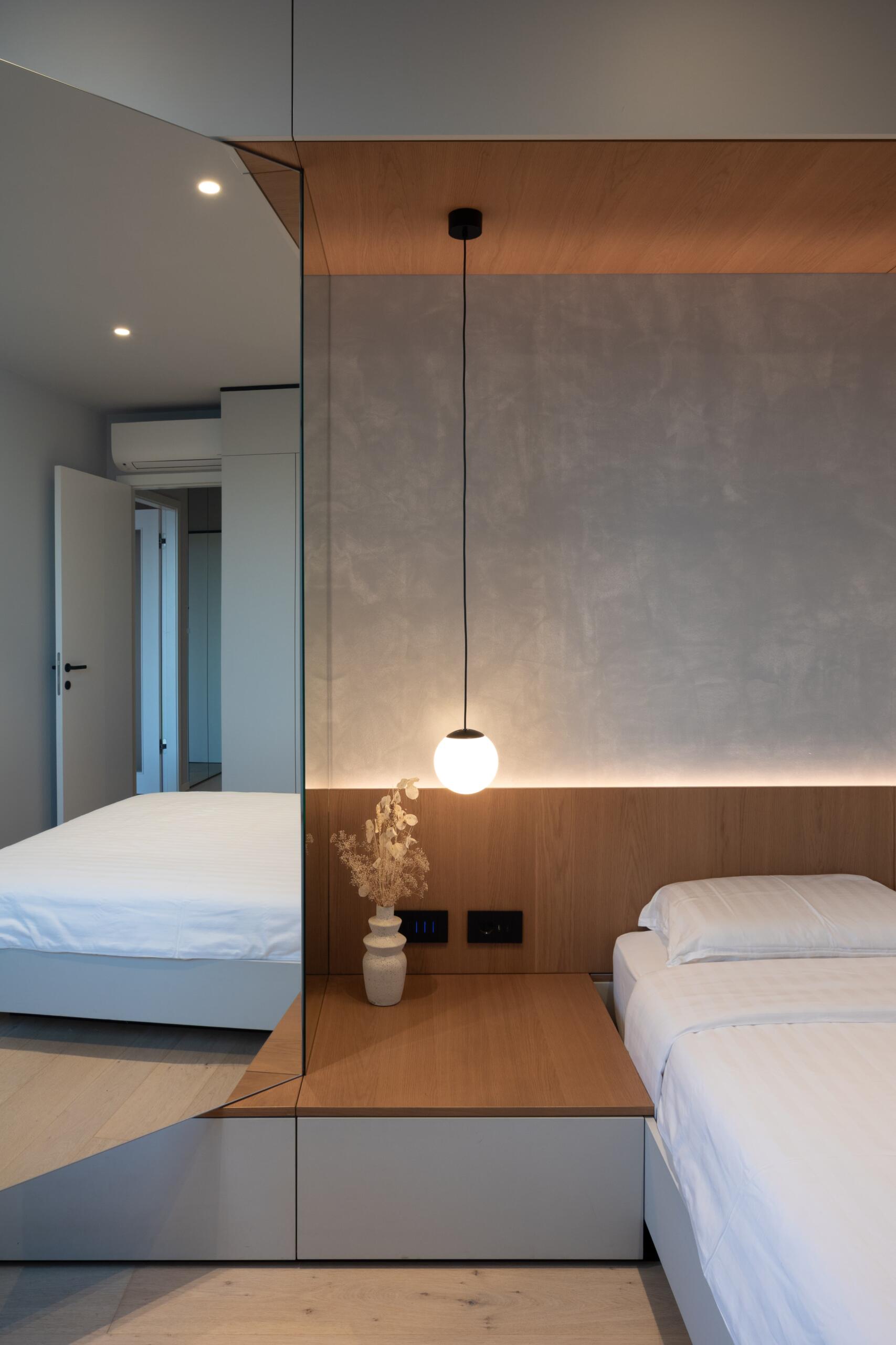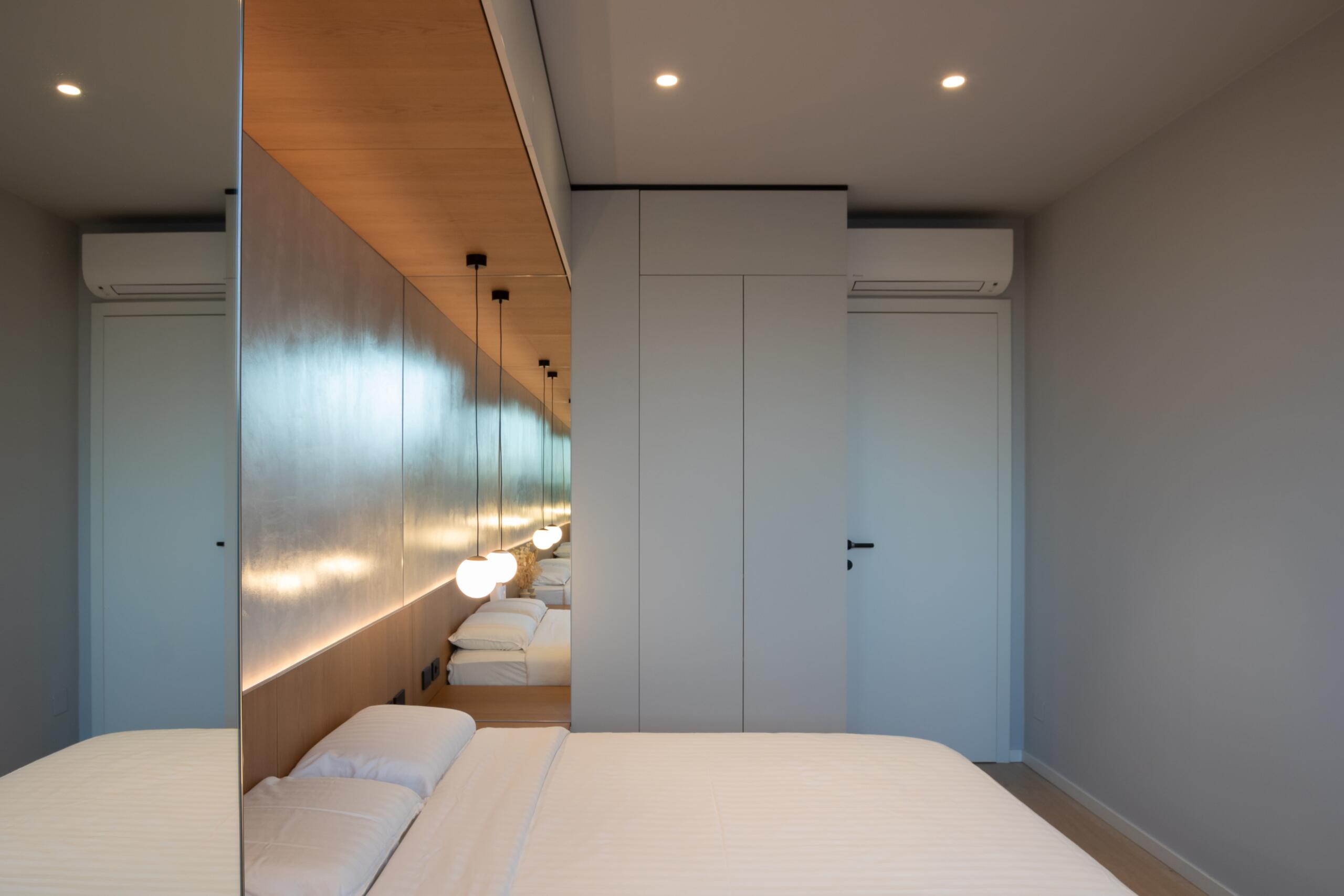 “Kako bismo izbjegli da krevet bude okružen ormarima, odlučili smo segment ormara obložiti zrcalima. To je stvorilo dojam veće prozračnosti i prostora”, pojašnjava arhitektica.