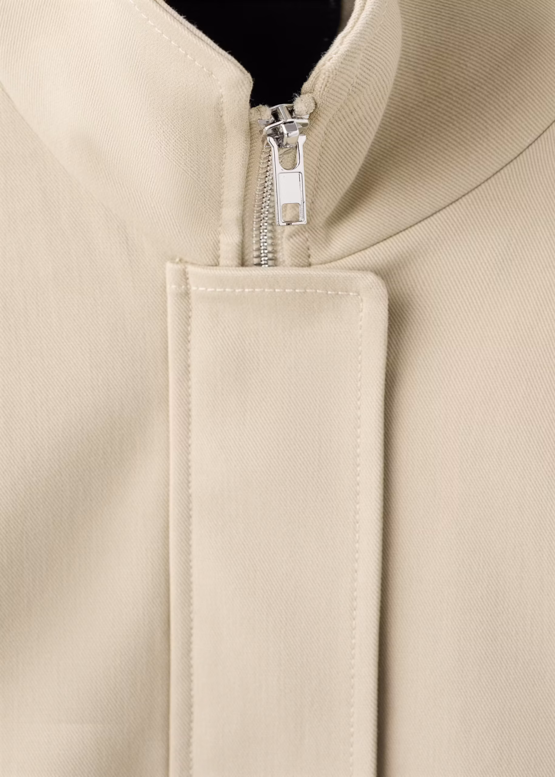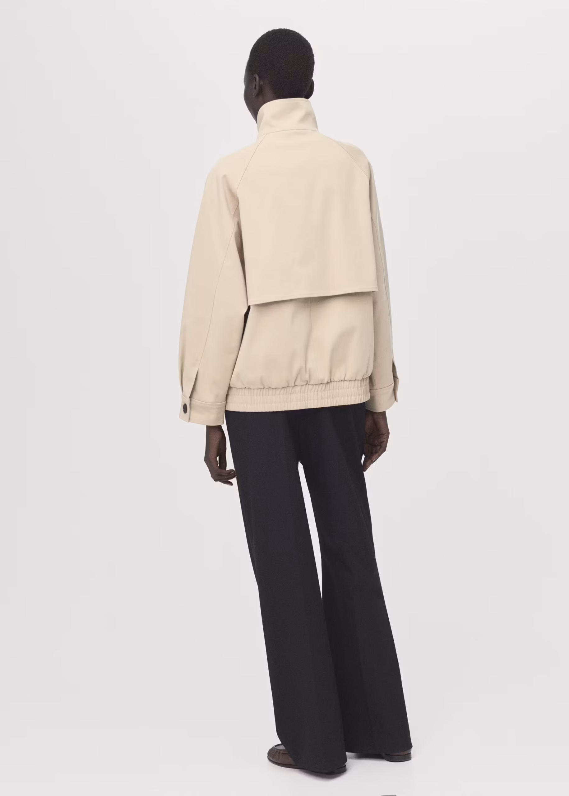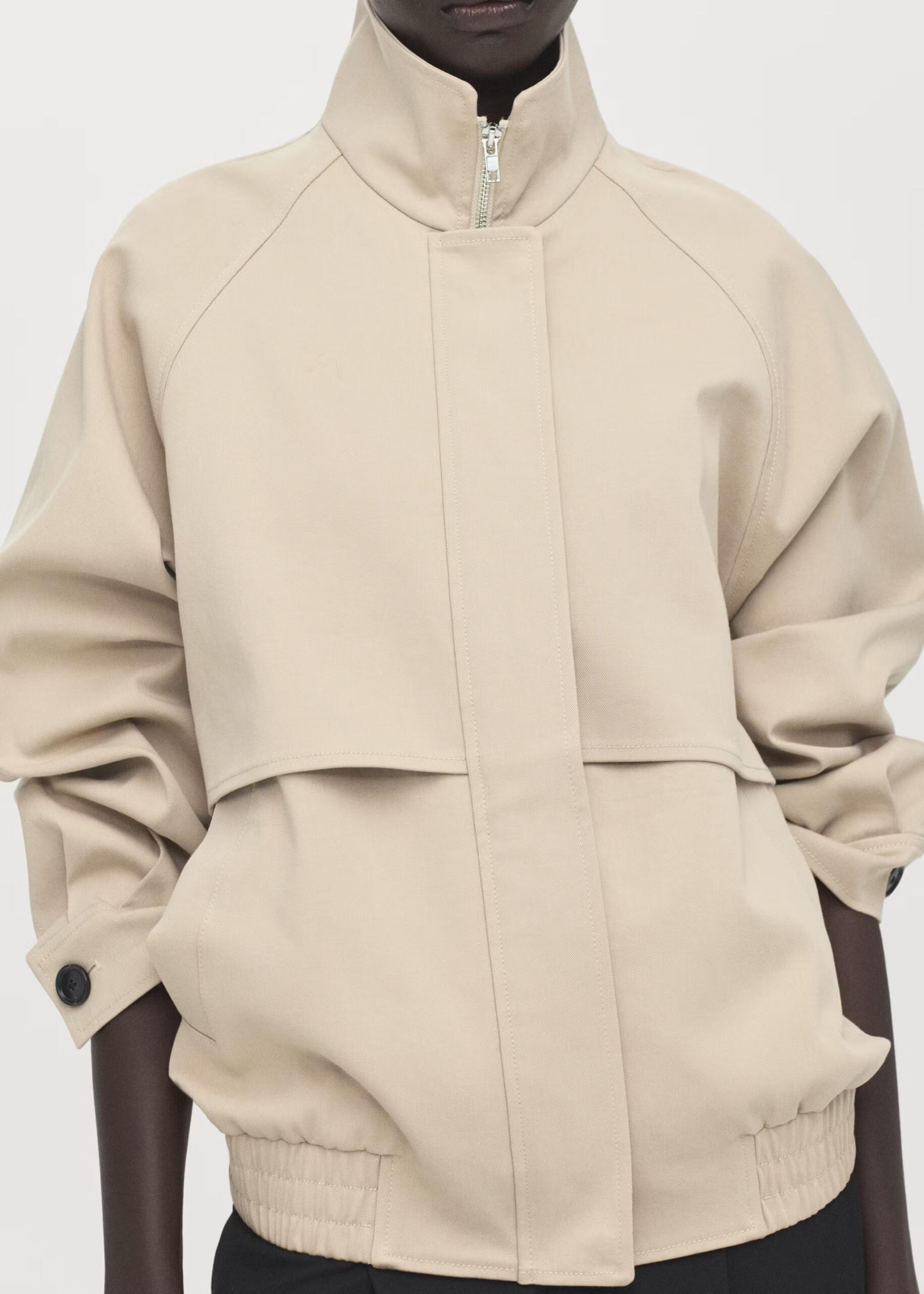 Riječ je o prekrasnoj bež jakni koja nam se na prvi pogled čini kao kombinacija bomber jakne i balonera jer sadrži detalje obje jakne. Jakna je napravljena od pamuka, a ima visoki ovratnik, oversized je kroja, a na rukavima se nalaze gumbi. Ima i elastični nabrani rub te stražnji preklop na jakni. Osim toga, jakna ima dva bočna džepa na prednjoj strani i skriveno kopčanje na patent.