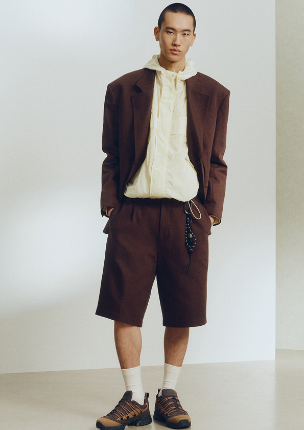 Kolekcija se čita kao pažljivo uređena putna selekcija: košulje s prednjim džepovima, majice i pleteni prsluci čine osnovu, slojevito kombiniranu s opuštenim blejzerima i laganim jaknama. Cargo hlače, bermude ispod koljena i plisirane hlače koje se blago sužavaju oko gležnja oblikuju izduženu, ležernu siluetu sezone. Krojevi su širokih proporcija, s košuljama nenametljivo izvučenima ispod jakni i pletiva, što donosi vješto postignutu lakoću kroz opuštene proporcije i promišljeno slojevanje.