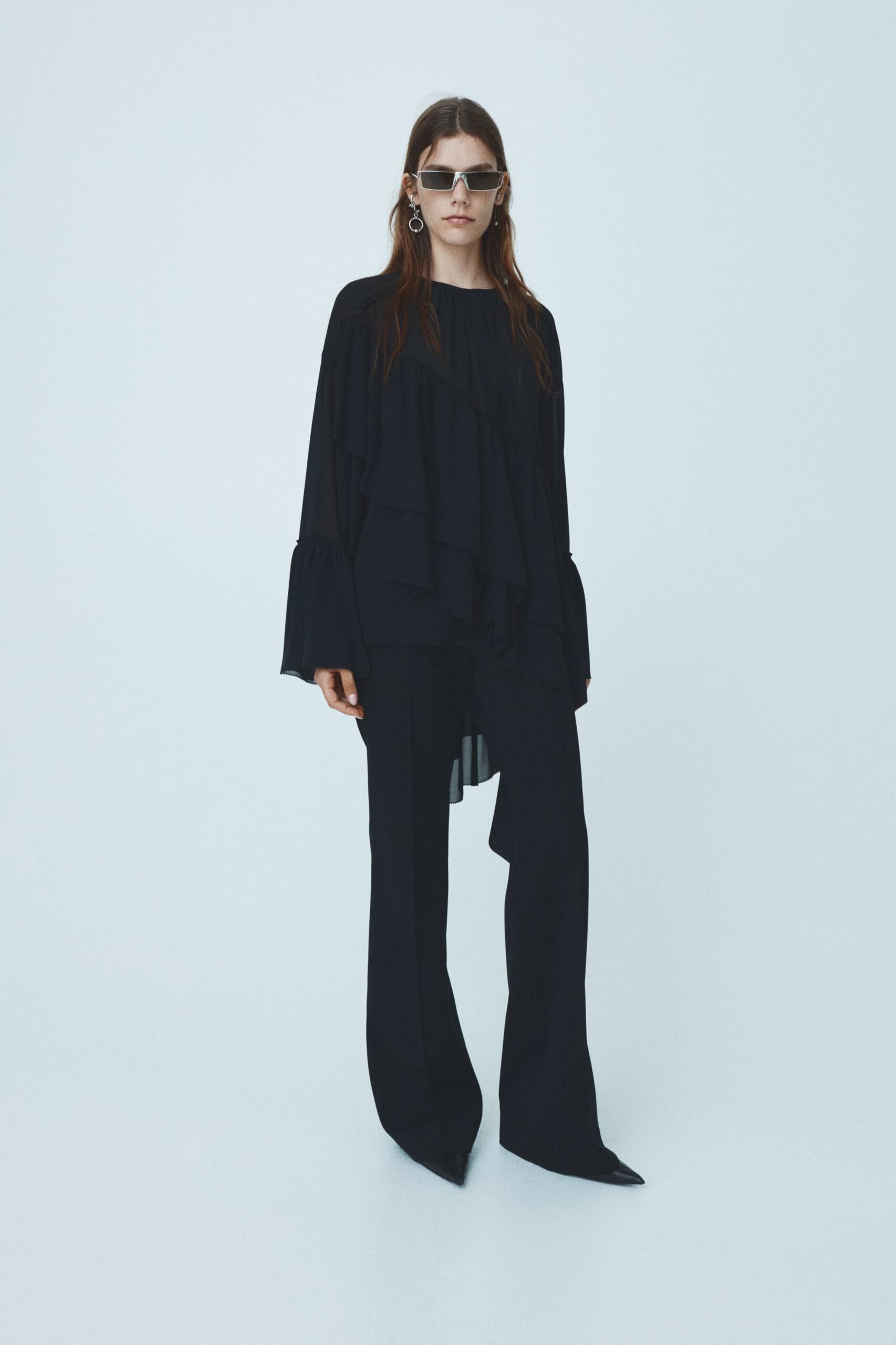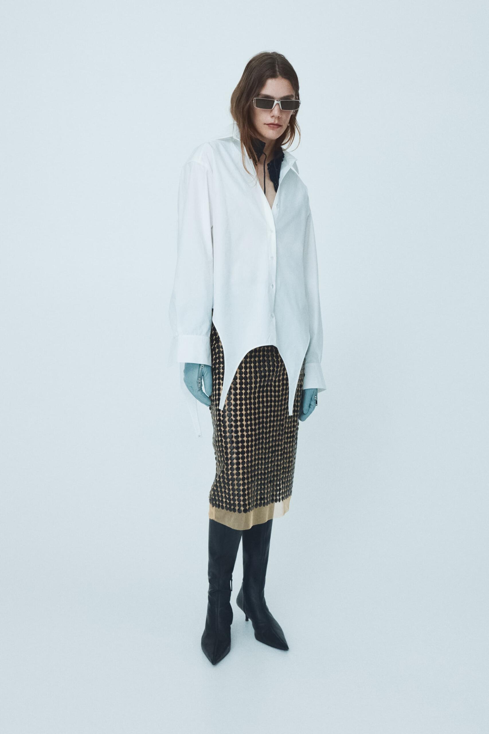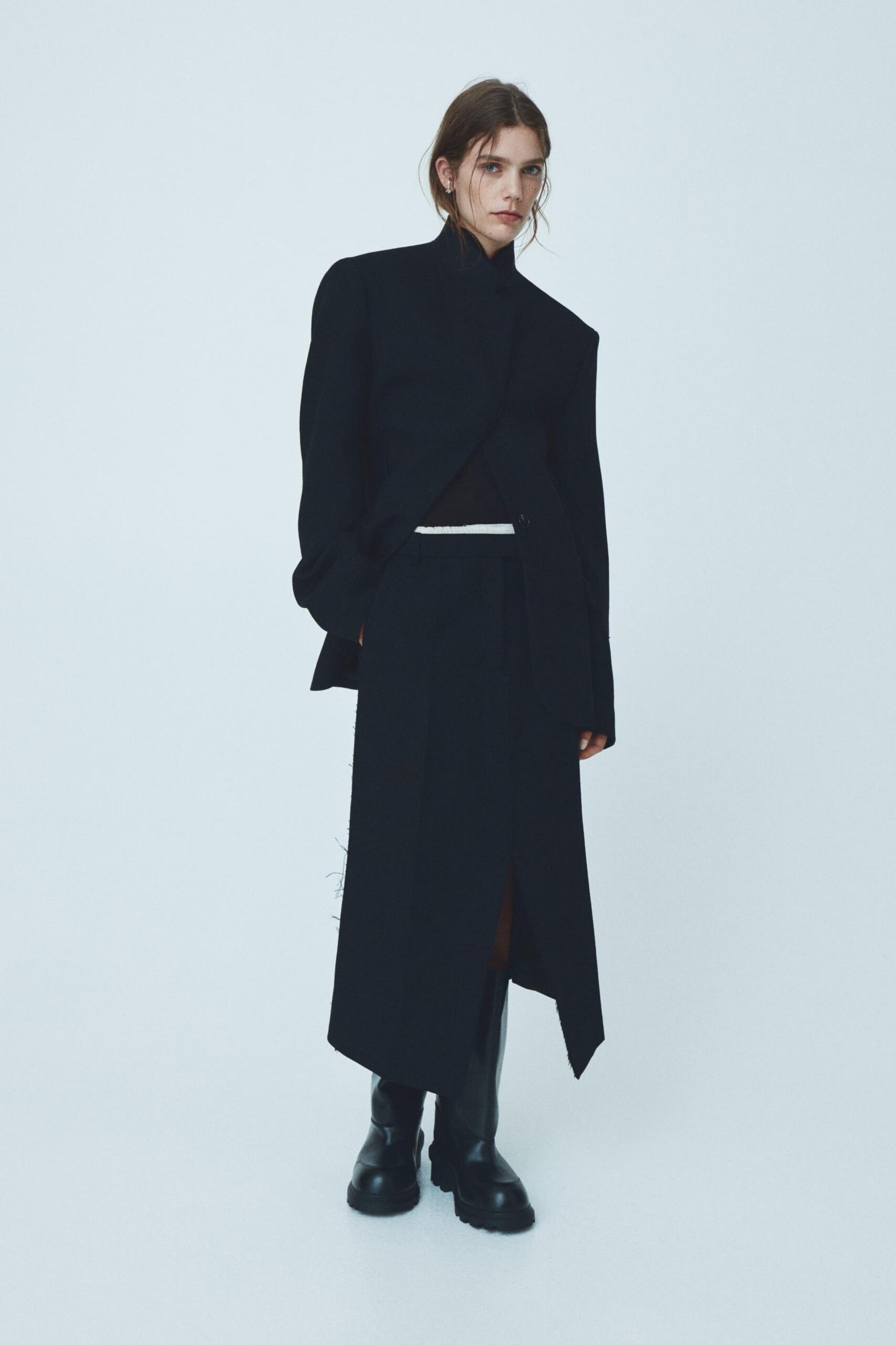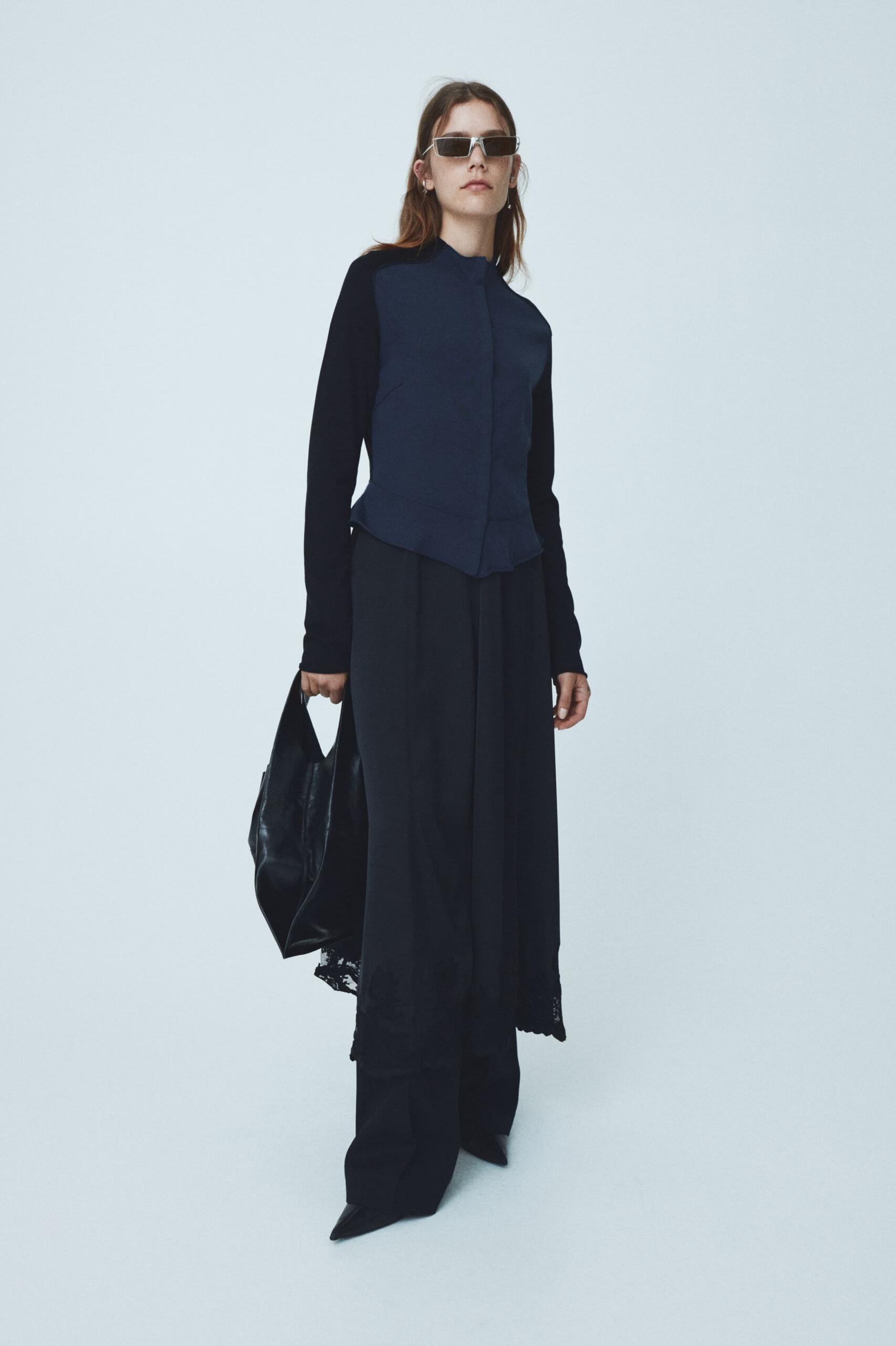Ključni komadi kreću se od elegantnih – poput muškog sakoa s crnom prednjom stranom i tamnosivim kontrastnim stražnjim dijelom u kombinaciji s pripadajućom suknjom, pencil suknje ukrašene šljokicama i mrežastim panelima te dugih, uskih crnih vunenih hlača – do opuštenih, kao što su komplet od smeđeg trapera, kombinacija pregače i slip haljine koje se mogu nositi odvojeno ili, pak, lagane jakne balon kroja.