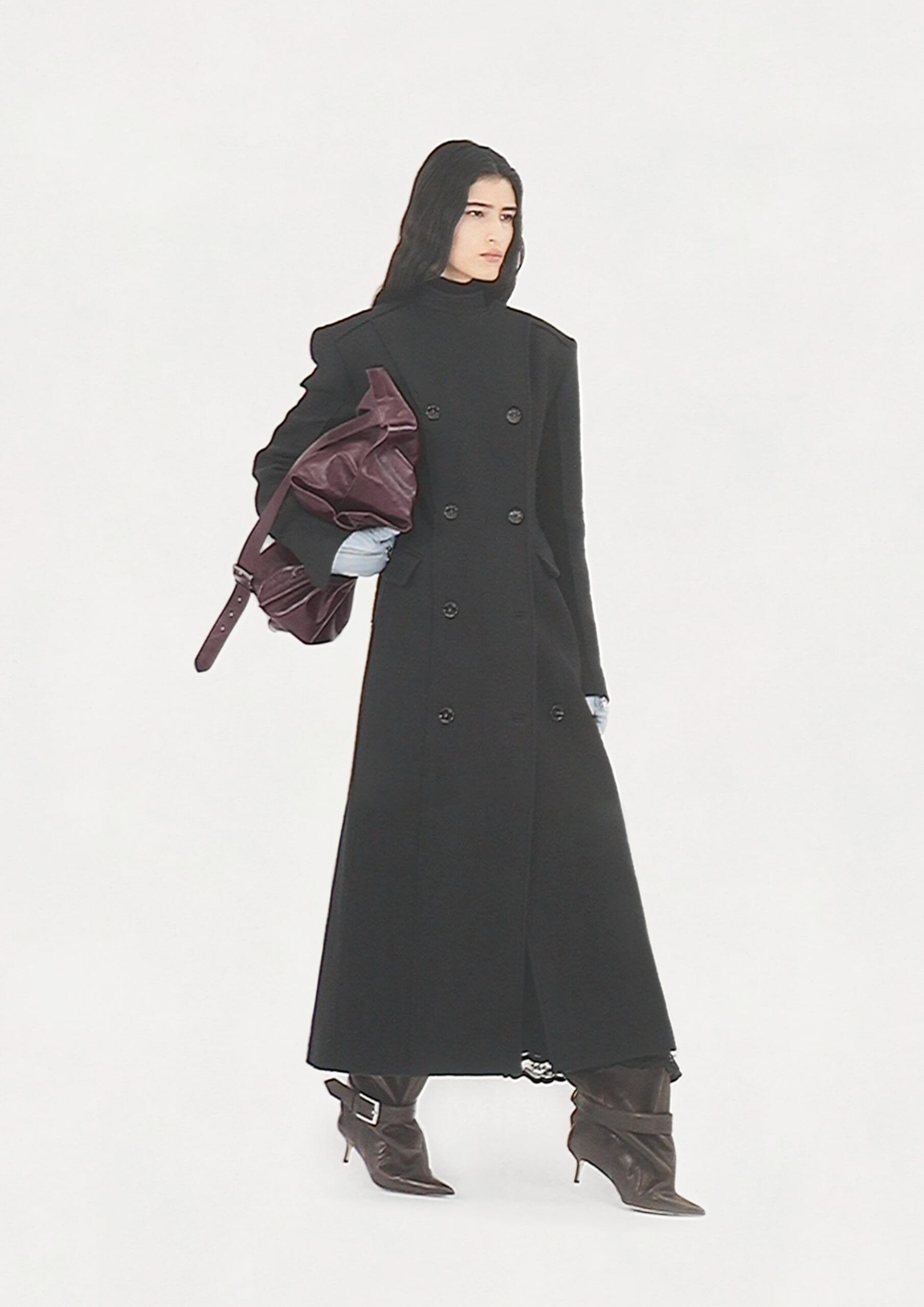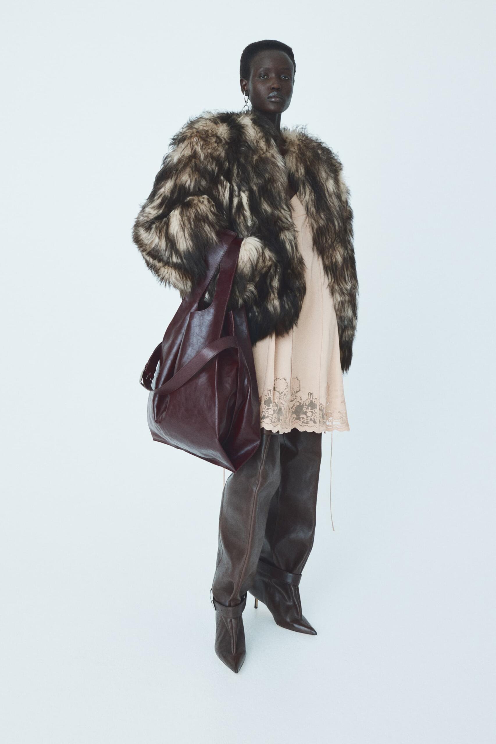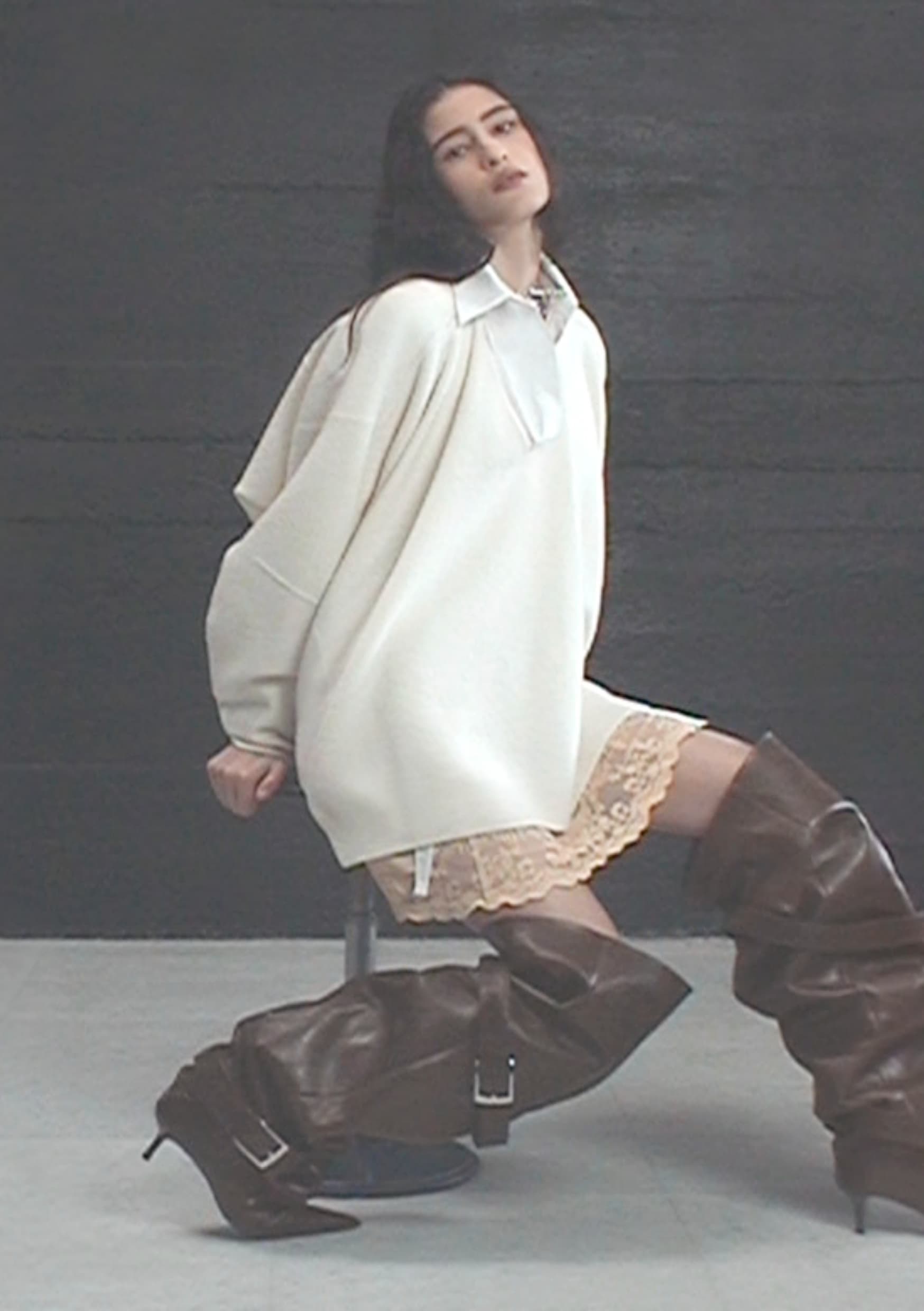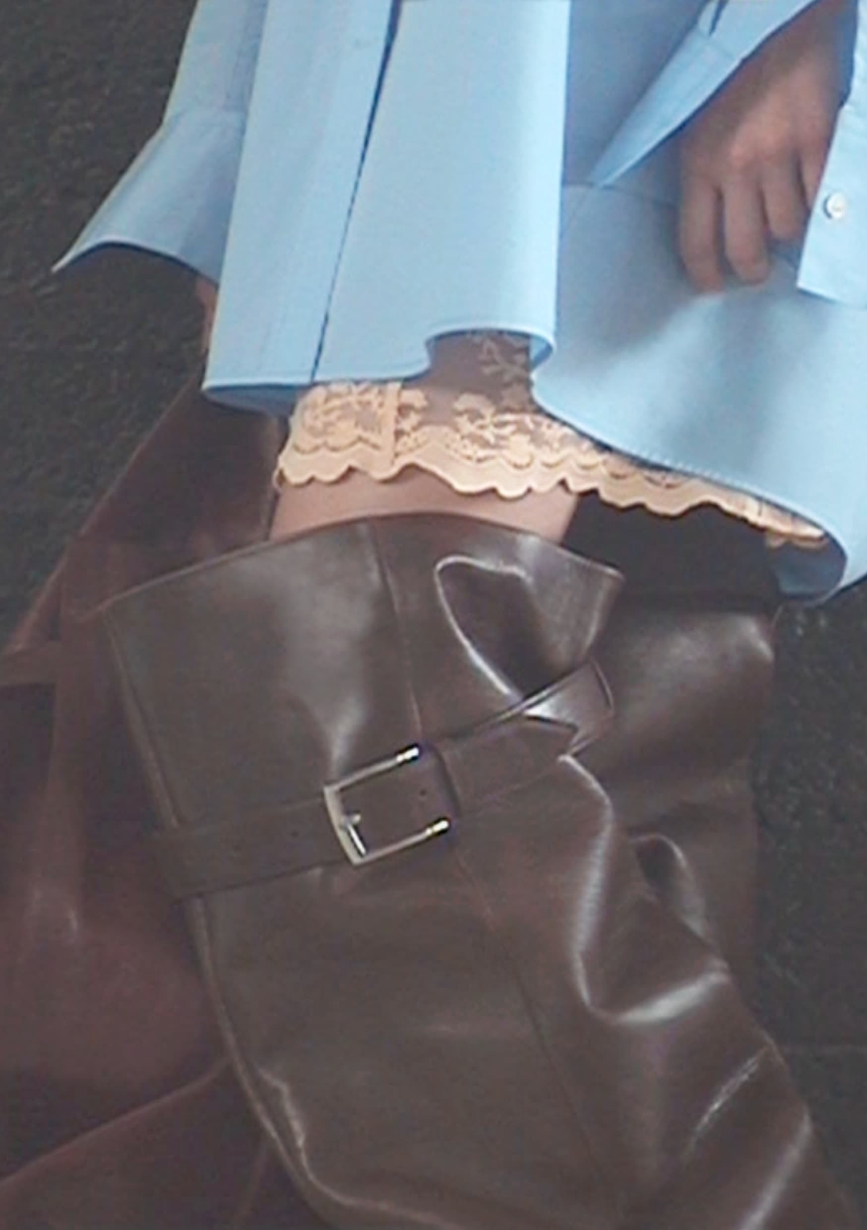 Materijali su prikazani u svom izvornom obliku, dok paleta boja – smeđa, tamnoplava, crna i betonsko siva – odaje počast brutalizmu. Akcenti u crvenoj, ružičastoj, plavoj te vintage cvjetni uzorak unose vibrantnu kreativnu energiju. Modni dodaci uključuju tamnosmeđe kožnate čizme na petu s odvojivim kopčama, veliku mekano nabranu torbu od bordo kože, kožne rukavice u plavoj nijansi te upečatljive naušnice i manžete za uši.