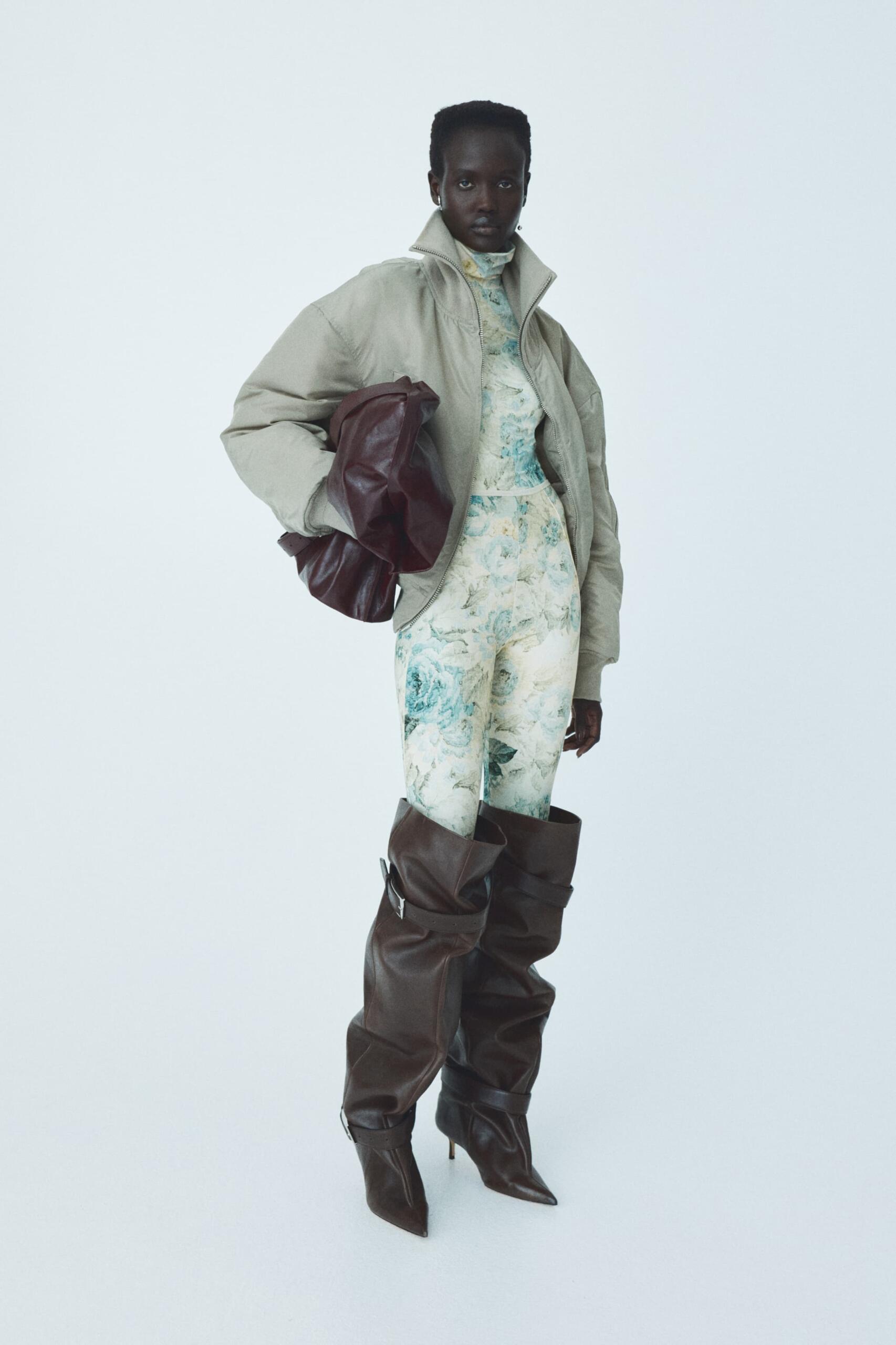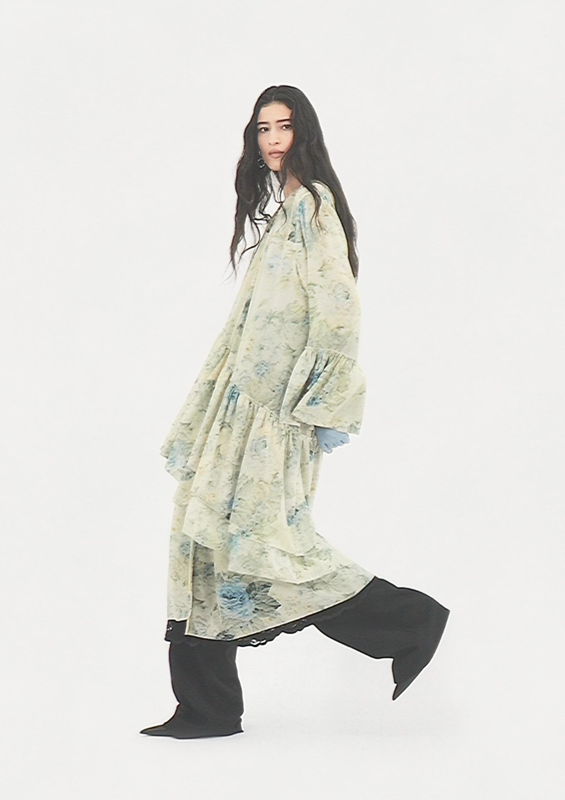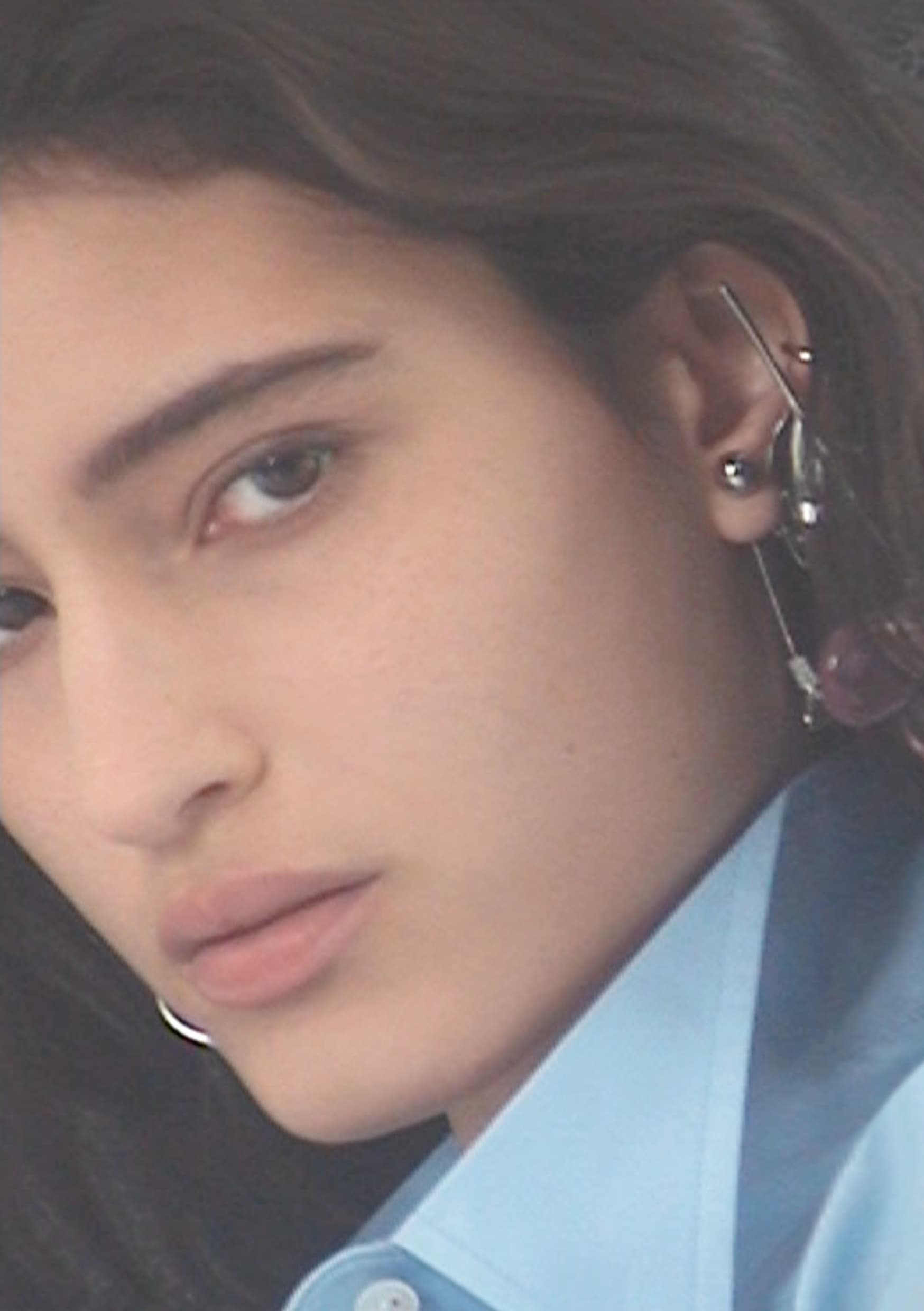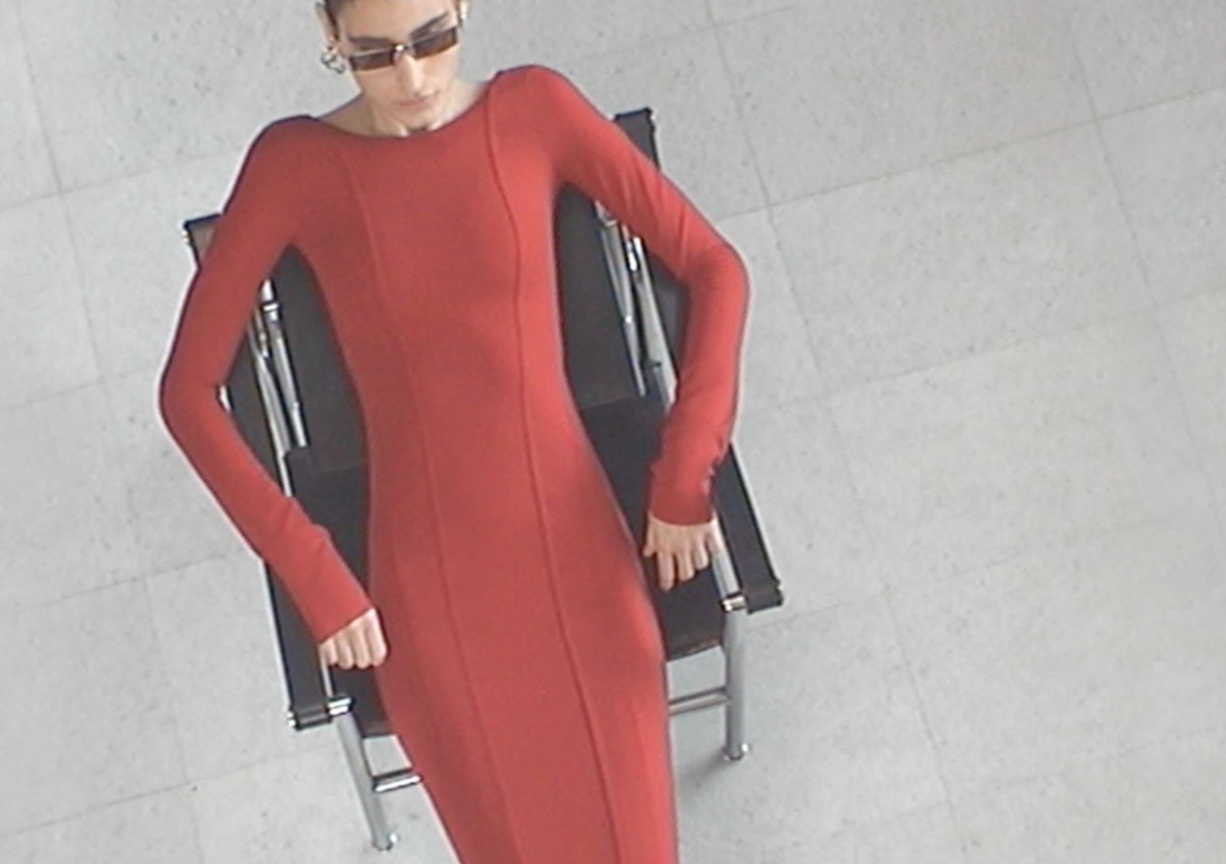 Materijali su prikazani u svom izvornom obliku, dok paleta boja – smeđa, tamnoplava, crna i betonsko siva – odaje počast brutalizmu. Akcenti u crvenoj, ružičastoj, plavoj te vintage cvjetni uzorak unose vibrantnu kreativnu energiju. Modni dodaci uključuju tamnosmeđe kožnate čizme na petu s odvojivim kopčama, veliku mekano nabranu torbu od bordo kože, kožne rukavice u plavoj nijansi te upečatljive naušnice i manžete za uši.