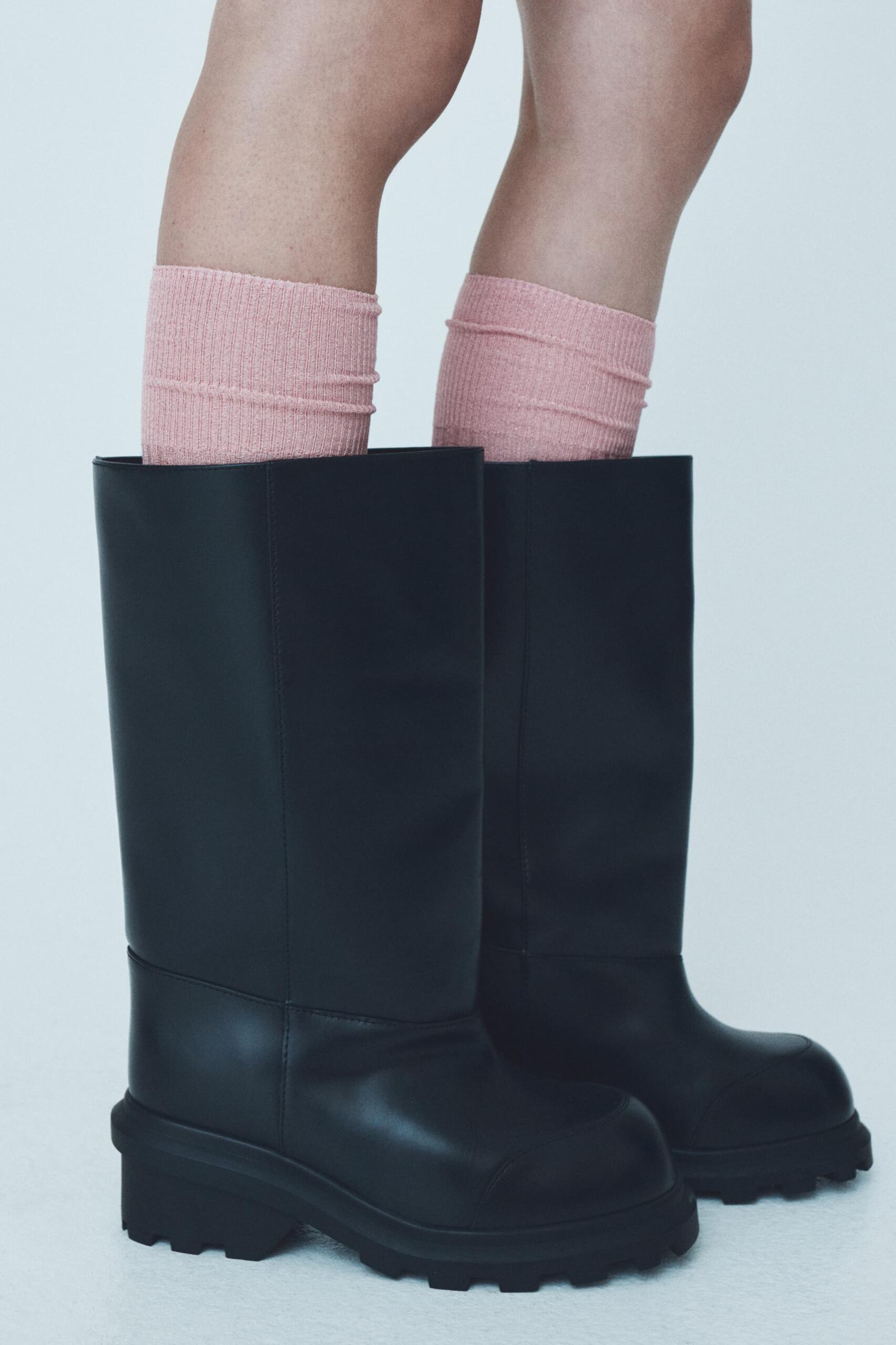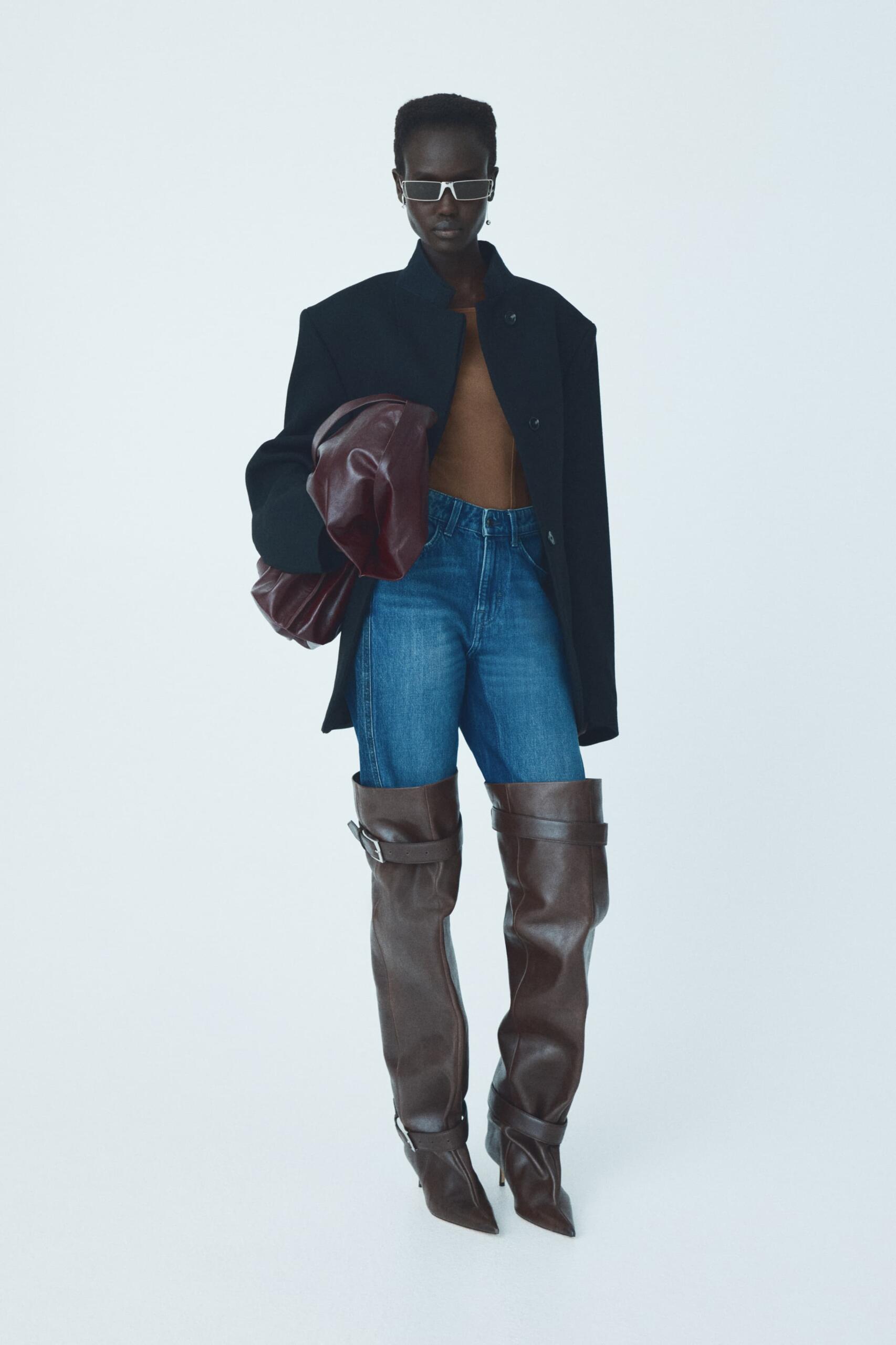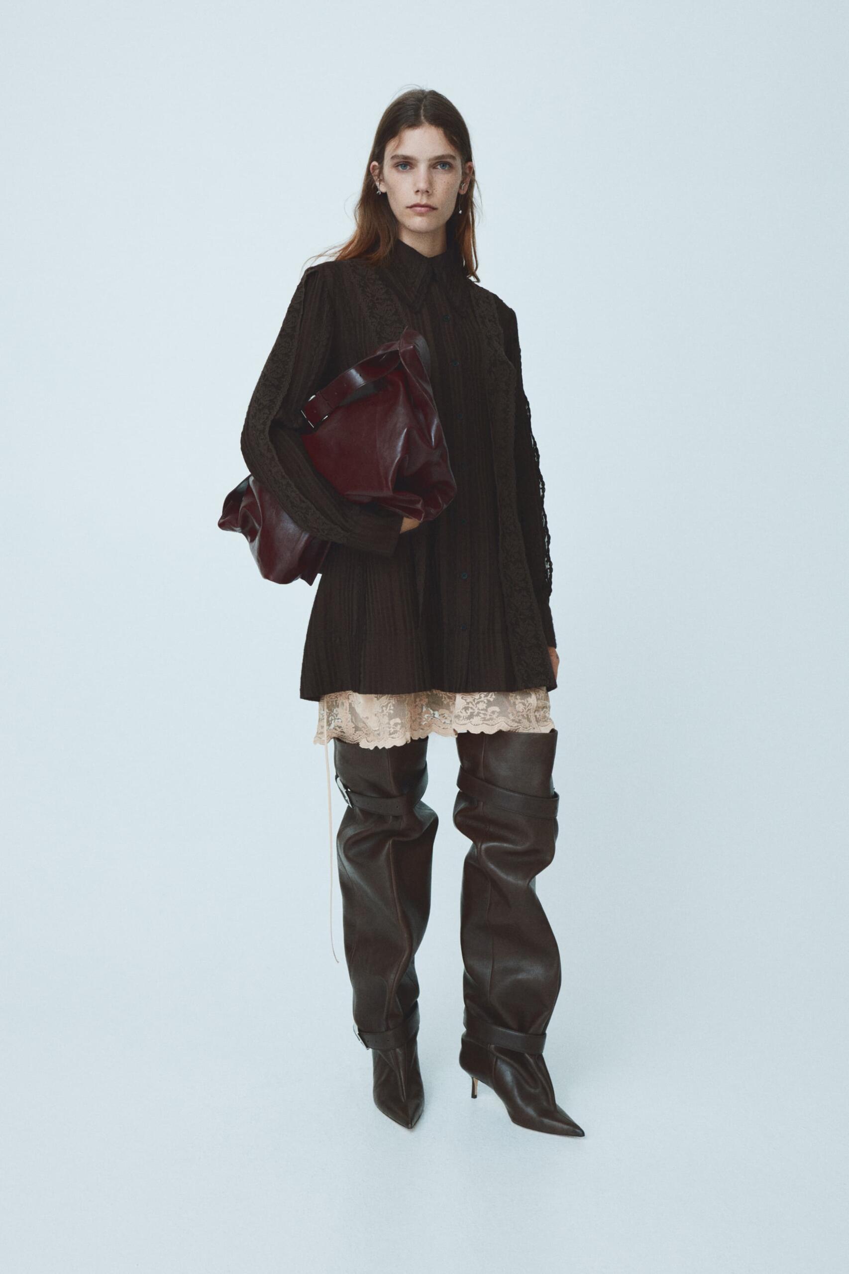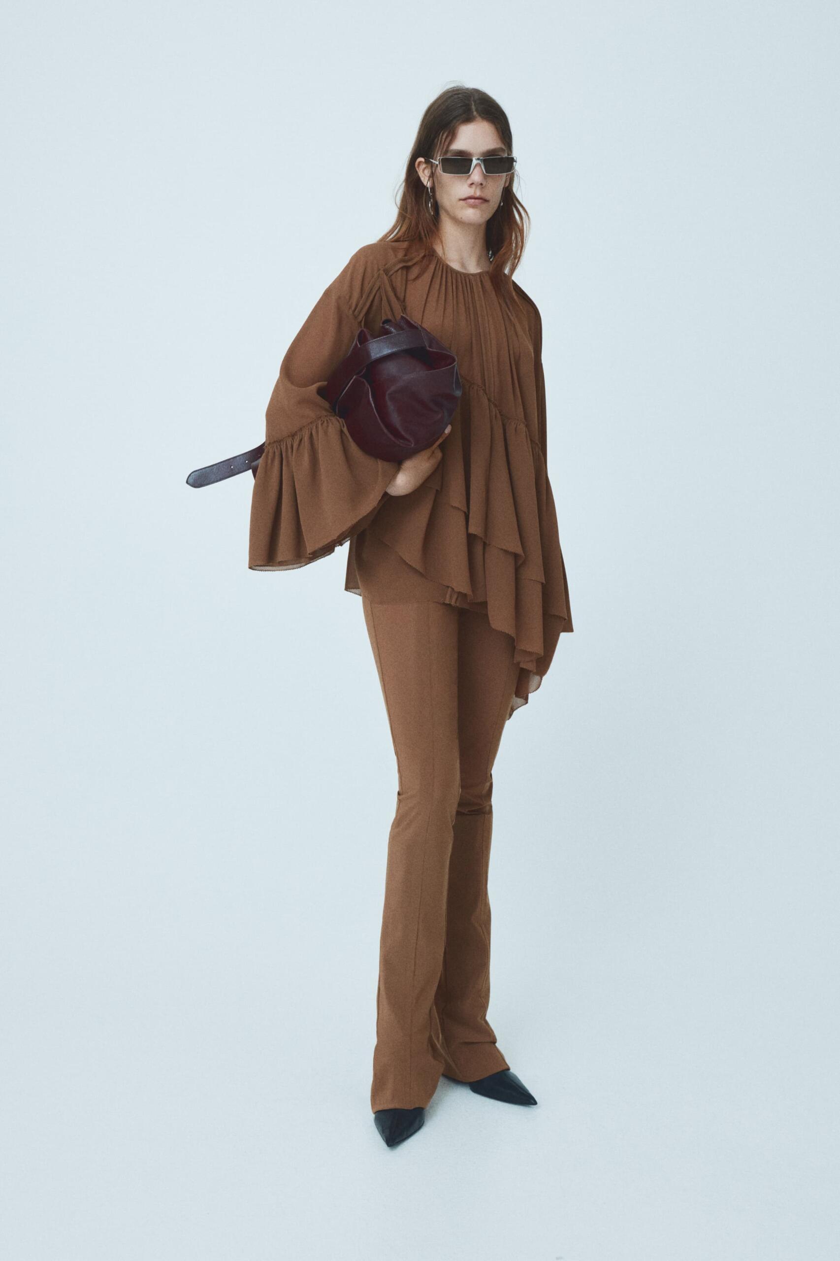 Materijali su prikazani u svom izvornom obliku, dok paleta boja – smeđa, tamnoplava, crna i betonsko siva – odaje počast brutalizmu. Akcenti u crvenoj, ružičastoj, plavoj te vintage cvjetni uzorak unose vibrantnu kreativnu energiju. Modni dodaci uključuju tamnosmeđe kožnate čizme na petu s odvojivim kopčama, veliku mekano nabranu torbu od bordo kože, kožne rukavice u plavoj nijansi te upečatljive naušnice i manžete za uši.