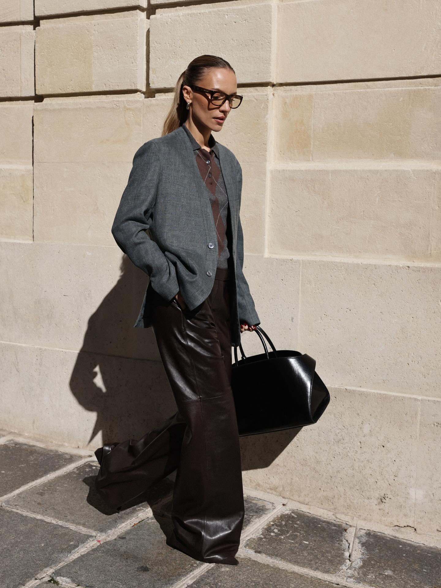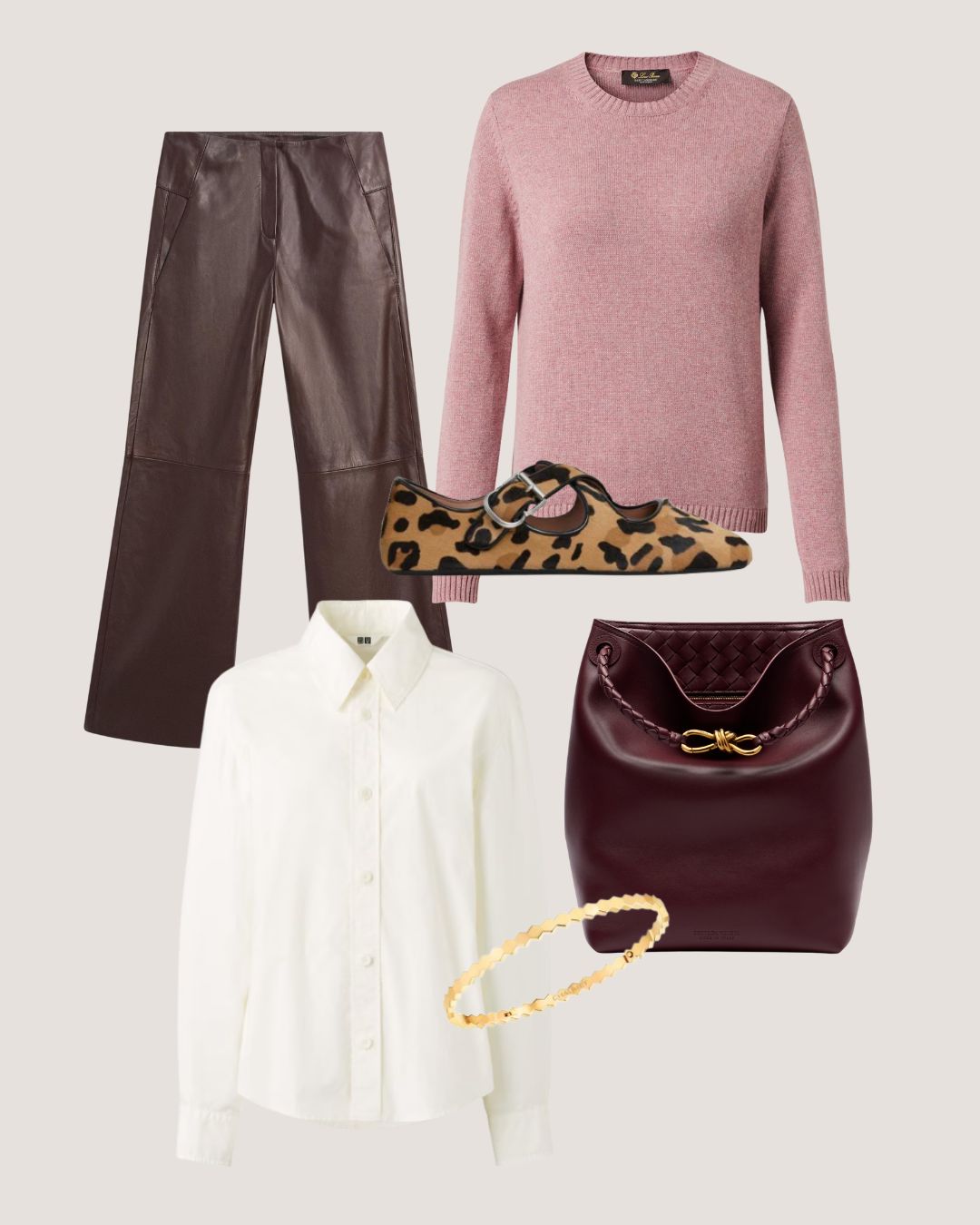 Kako bismo dokazali da se kožnate hlače mogu nositi i u poslovnim prigodama, iskombinirali smo ih s klasicima. Bijela košulja od popelina i pulover od kašmira staple su komadi koje svatko ima u svojoj garderobi, a koji uz kožnate hlače te atraktivne modne dodatke poput tote torbice brenda Bottega Veneta i leopard balerinke s potpisom marke Alaïa, mogu dobiti sasvim novi izgled.