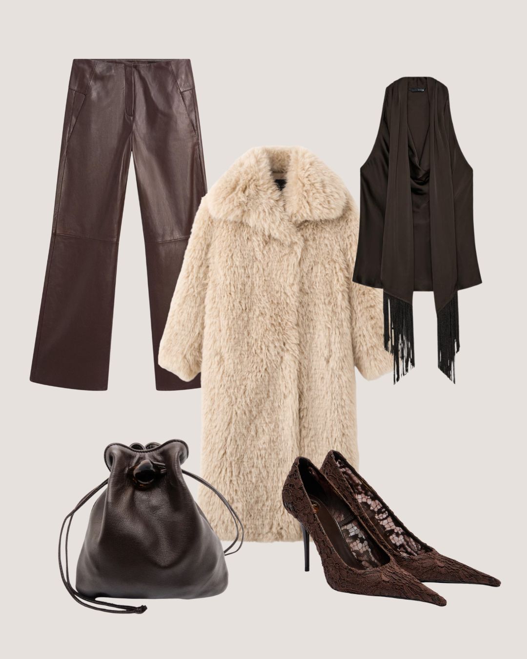 Smeđa je nova crna i postaje glavni odabir za večernje izlaske. Upravo smo zato high street hlače od kože iskombinirali s atraktivnim topom sa šalom, špic cipelama s visokom potpeticom, mini torbicom i bundom od umjetnog krzna. Ova je kombinacija istovremeno cool i sofisticirana, a može biti malo drugačiji odabir za party sezonu koja je pred nama.
