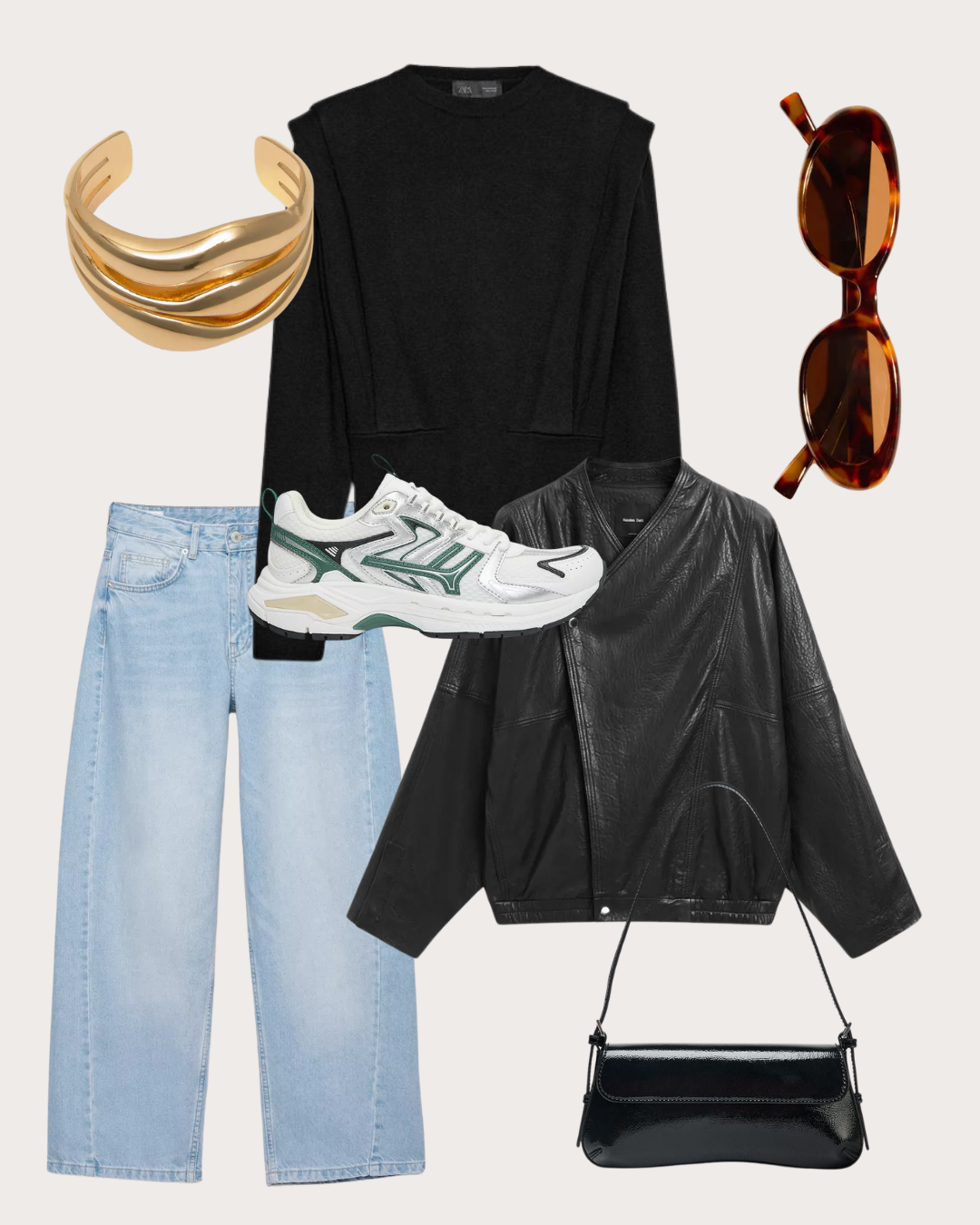 Ovaj outfit spaja casual udobnost i retro chic detalje. Široke traperice ostavljaju ležeran, ali trendi dojam, dok crna vesta sa naglašenim ramenima unosi strukturu i sofisticiran dodir u kombinaciju. Tenisice u retro stilu udoban su izbor koji će biti savršen za svaki dan, baš kao i klasična crna kožnata jakna iz koje se nećete skidati. Cat-eye sunčane naočale, manja kožnata torbica i cuff narukvica detalji su koji daju čitavom ležernom outfitu dozu suptilne sofisticiranosti.
