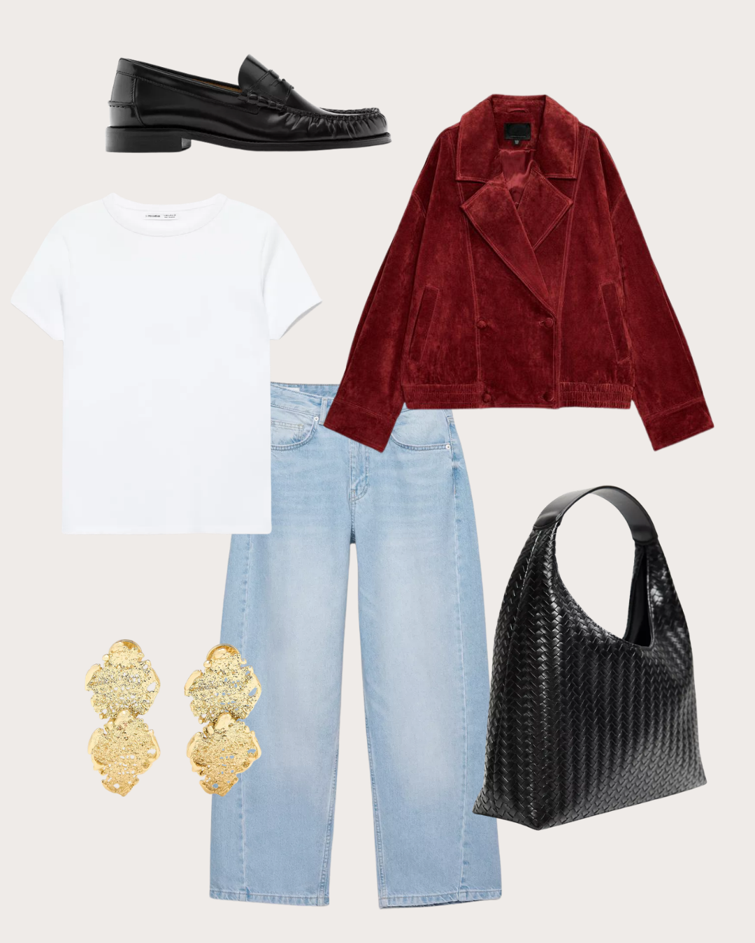 Ovaj look je istovremeno chic i savršen izbor za svaki dan, a može vam biti i savršena uniforma za prijelazno razdoblje i dane kad ne znate što odjenuti. T-shirt bijele boje i crne kožnate mokasinke klasici su koji funkcioniraju gotovo sa svime, a u kombinaciji s trapericama barrel kroja i jaknom od brušene kože u raskošnoj crvenoj boji, kreiraju modnu kombinaciju za kojom će se svi okretati. Upečatljive zlatne naušnice i praktična torba “točka su na i” ovog outfita koji ćete redovito ponavljati.