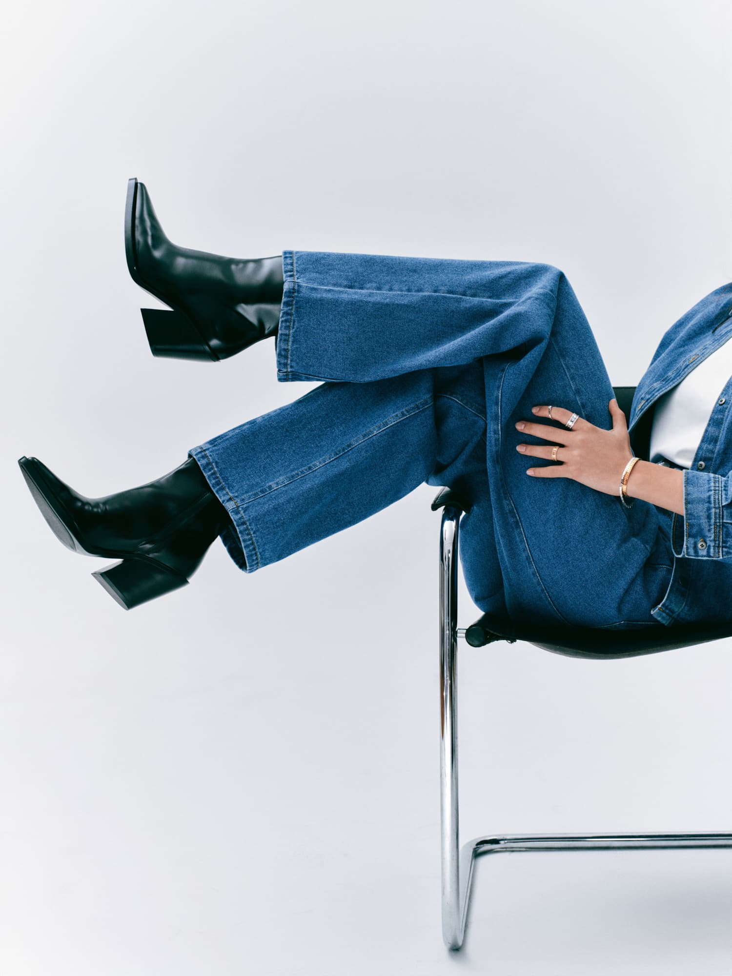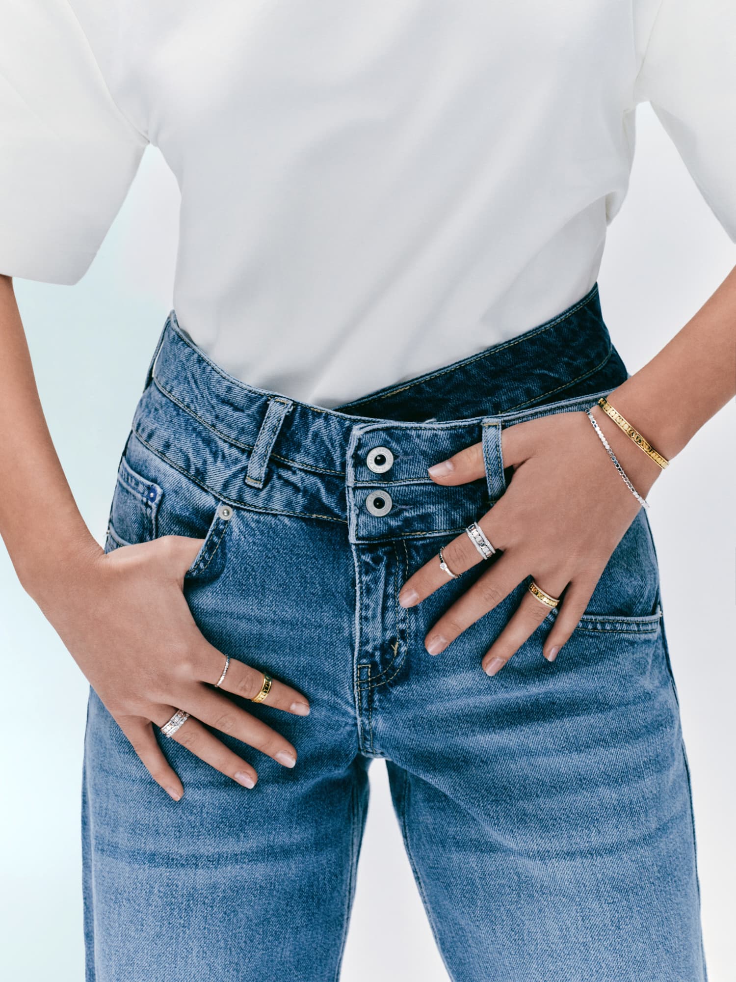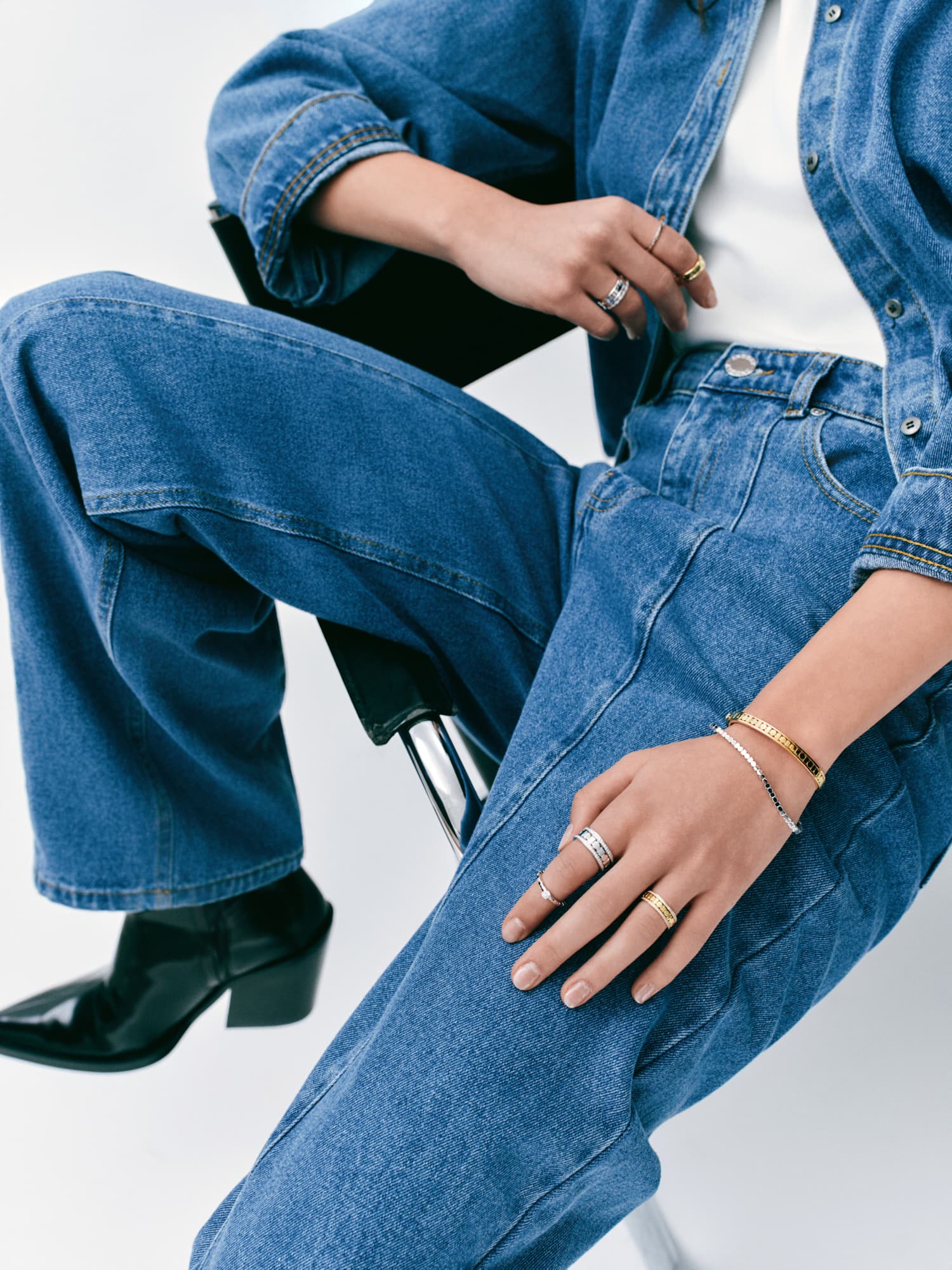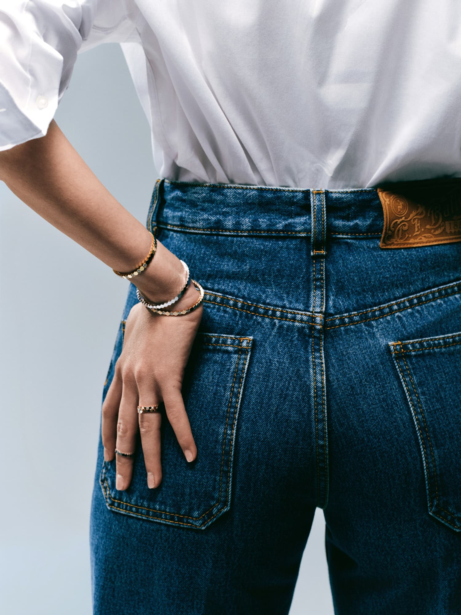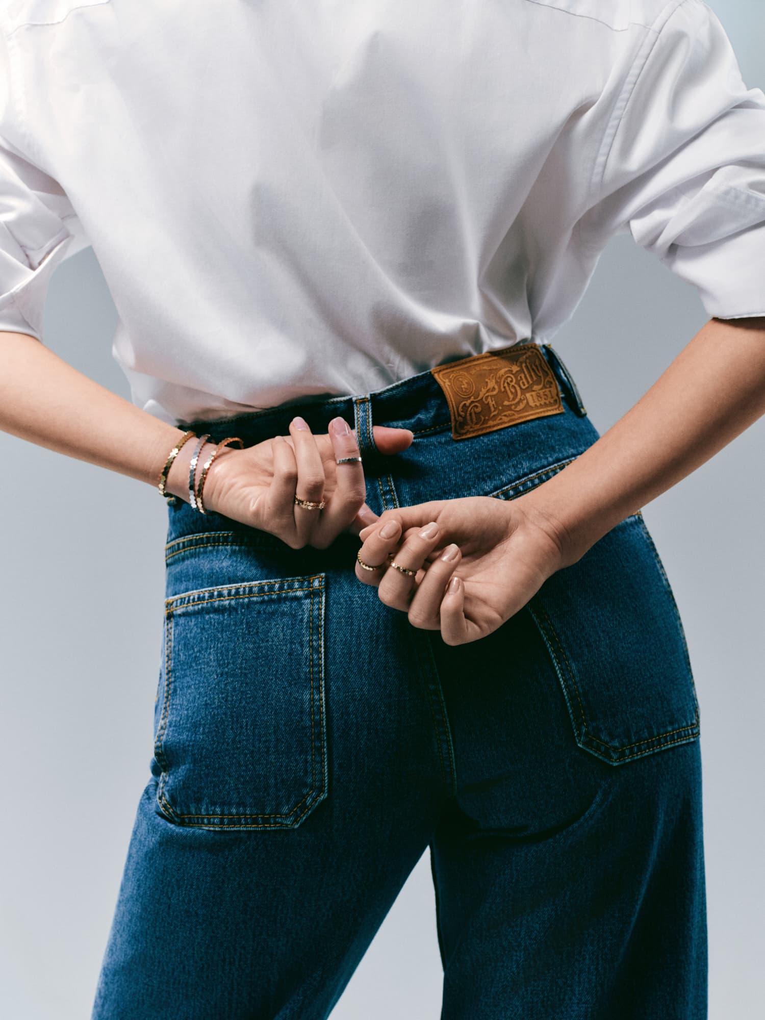 Ekstra dugačke nogavice traperica Bally, klasična bijela košulja i prstenje, ogrlice i bangle narukvice iz kolekcije Bee de Chaumet, izrađene od 18-karatnog bijelog i ružičastog zlata te dijamanata, savršen su spoj klasike i odvažnosti koji želimo nositi svaki dan.