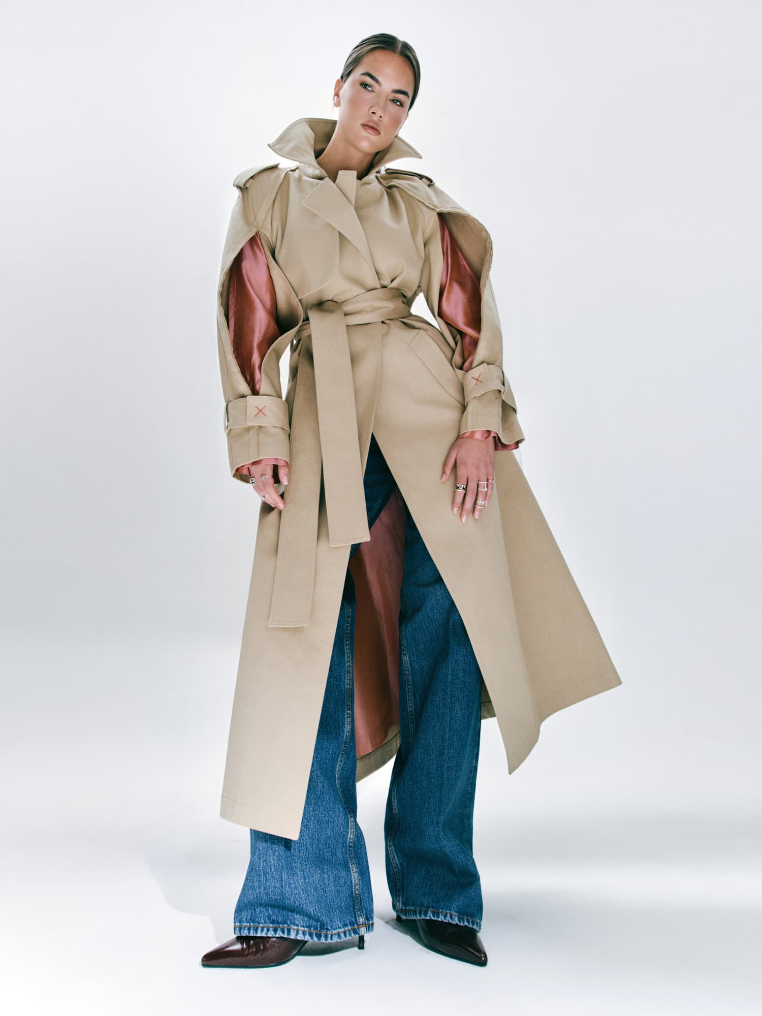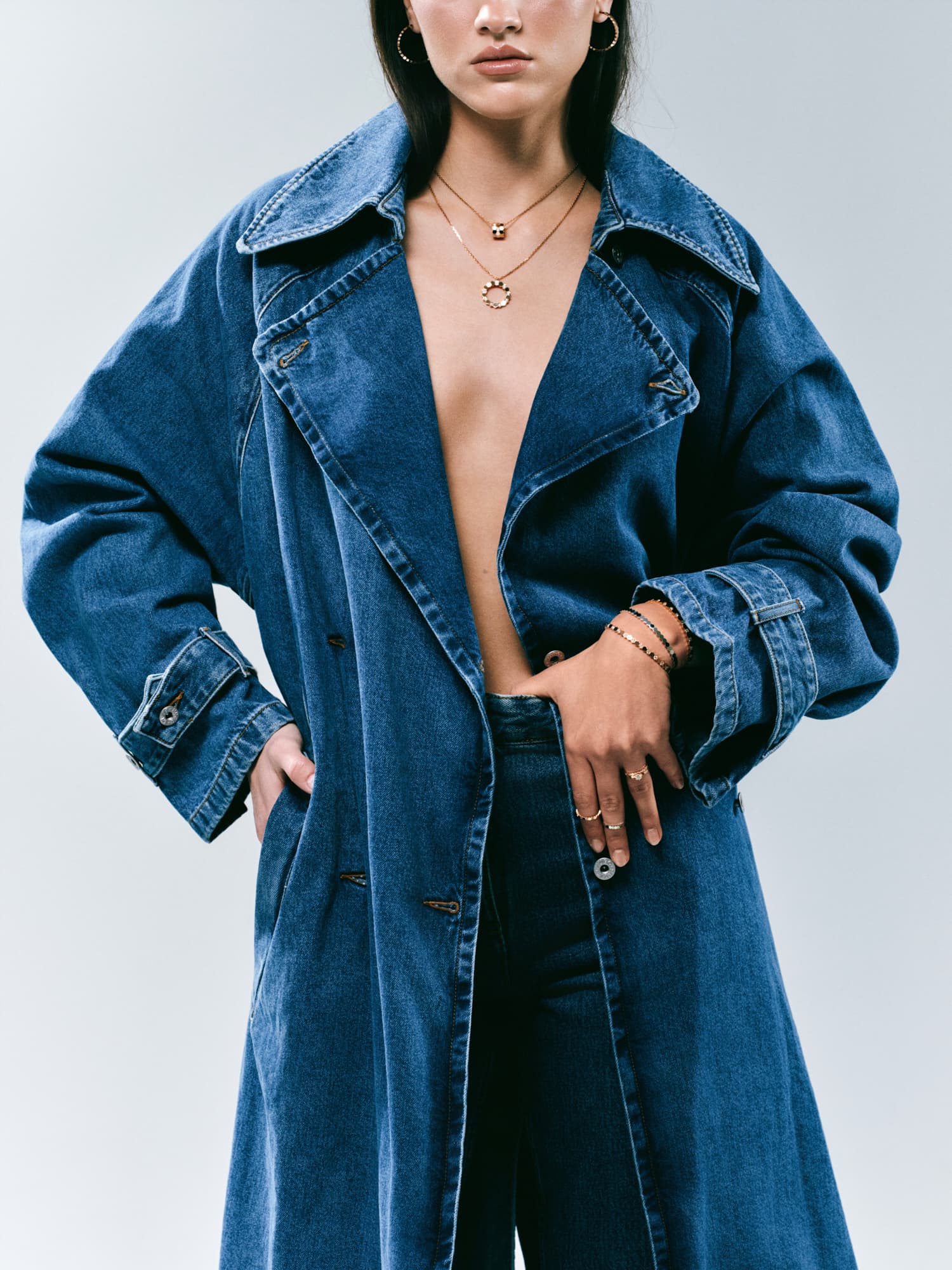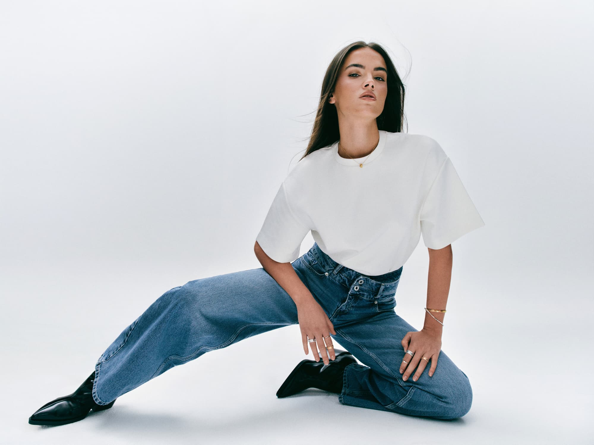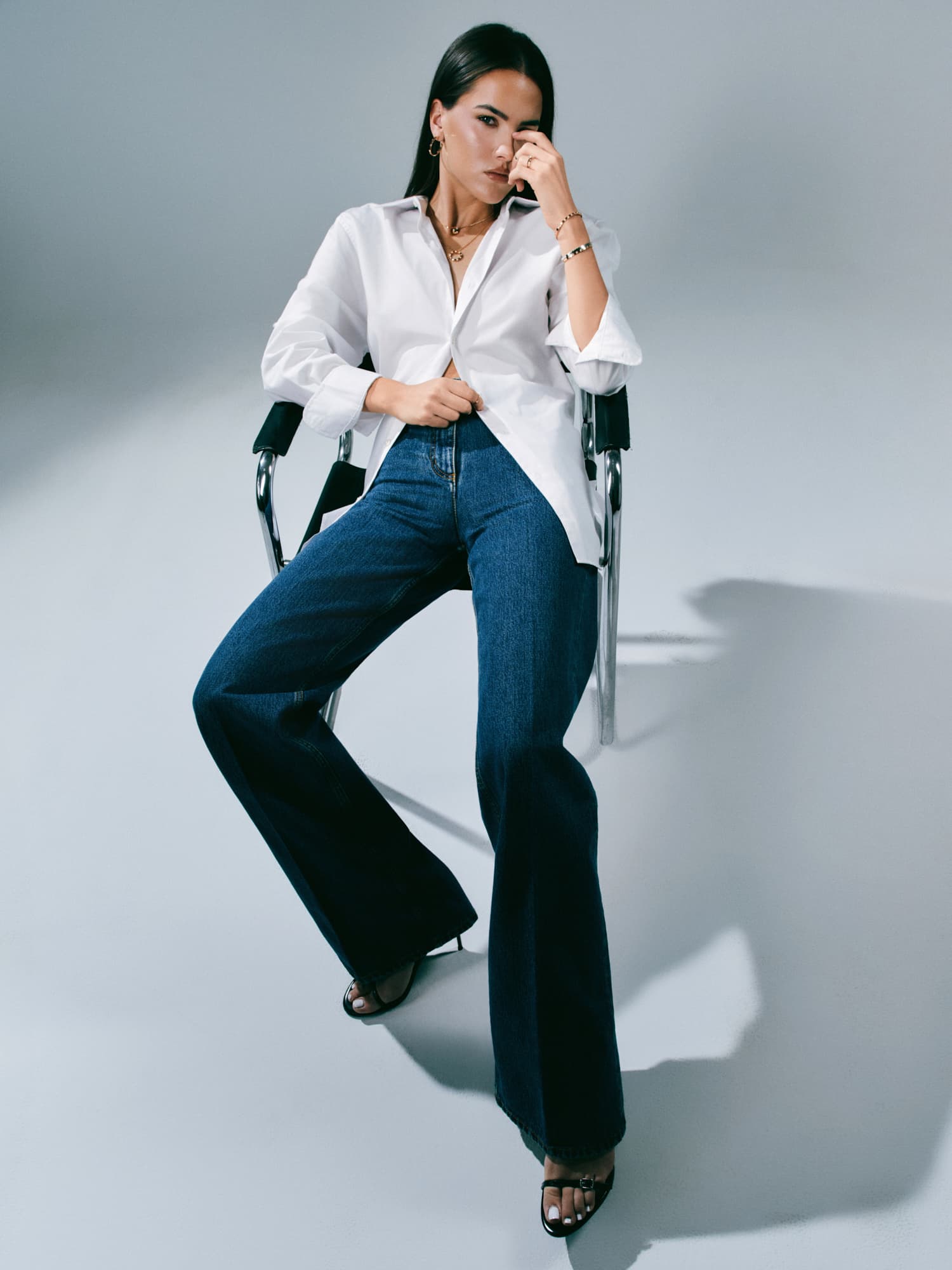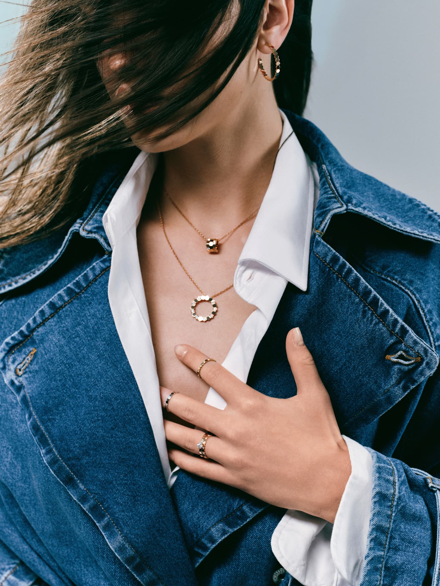 Ekstra dugačke nogavice traperica Bally, klasična bijela košulja i prstenje, ogrlice i bangle narukvice iz kolekcije Bee de Chaumet, izrađene od 18-karatnog bijelog i ružičastog zlata te dijamanata, savršen su spoj klasike i odvažnosti koji želimo nositi svaki dan.