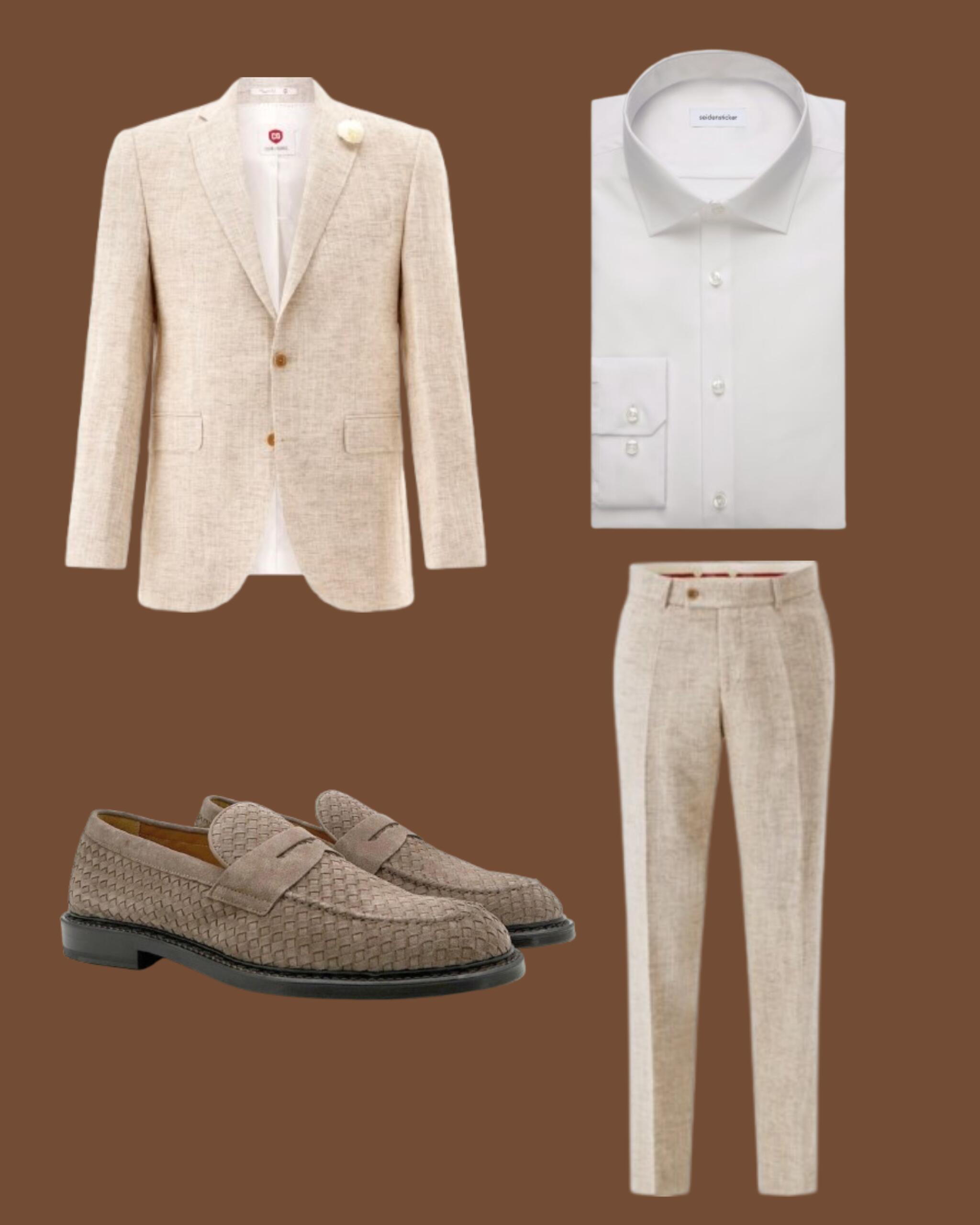Bež odijelo od laganog, teksturiranog materijala djeluje sofisticirano, ali istovremeno opušteno. Upravo ta “neispeglana savršenost” daje mu karakter i čini ga idealnim za toplije dane. Kombinacija s klasičnom bijelom košuljom vraća dozu formalnosti i klasike, dok mokasinke u toploj smeđoj nijansi zaokružuju cijeli look bez potrebe za klasičnim cipelama.