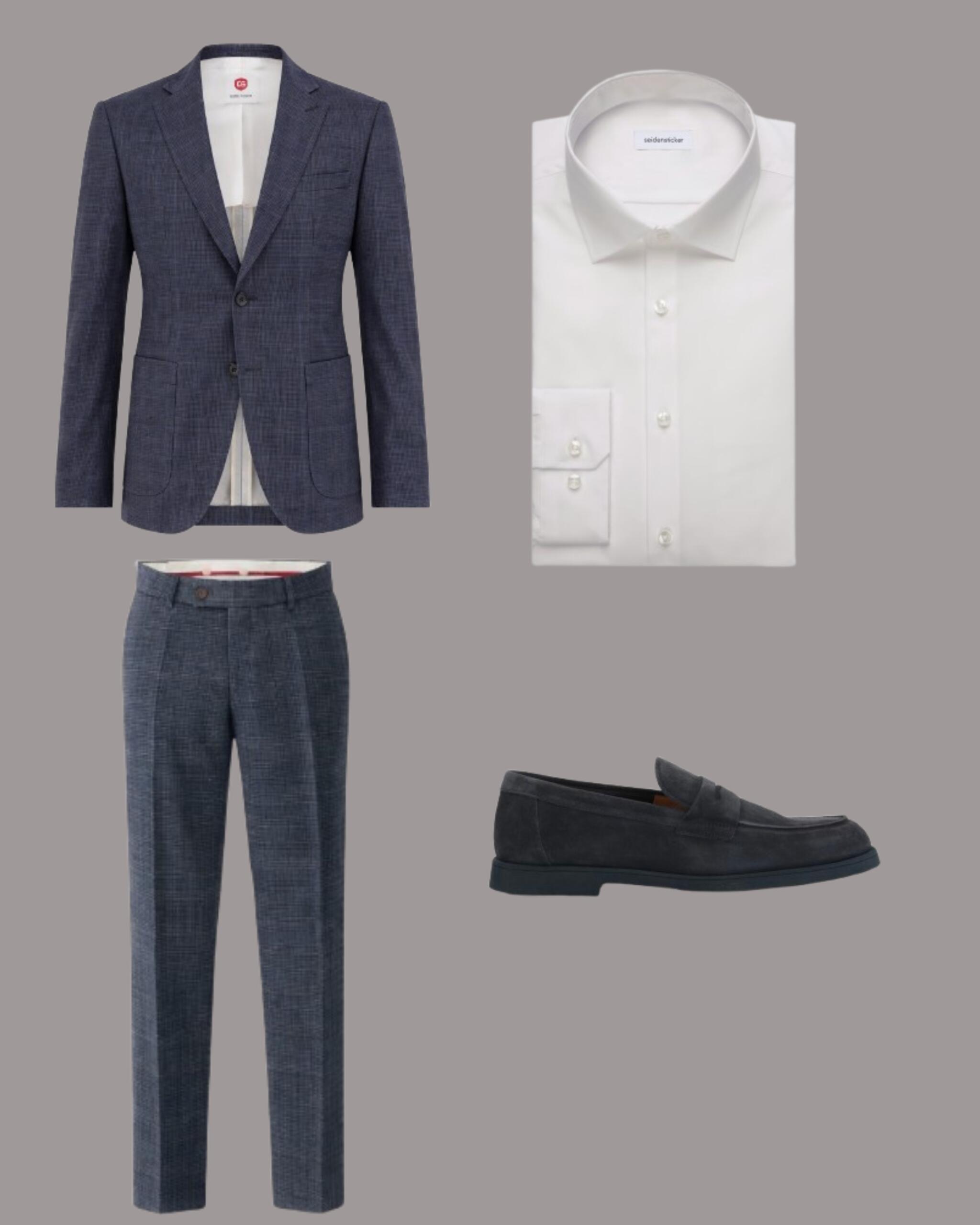 Ako postoji “sigurna zona” kad je riječ o muškom odijevanju za vjenčanje, onda je to je plavo odijelo. No, ključ je u nijansi i kroju. Ovaj model u srednje plavoj nijansi djeluje suvremeno i svježe, bez klasične “poslovne” ozbiljnosti. Jednostavna bijela košulja zadržava eleganciju, dok mokasinke od brušene kože u tamnoplavoj nijansi dodaju dozu ležernosti i razbijaju formalnost cijelog outfita. Ovaj outfit može biti upotpunjen i kravatu, za one koji se vole držati klasičnijeg stila.