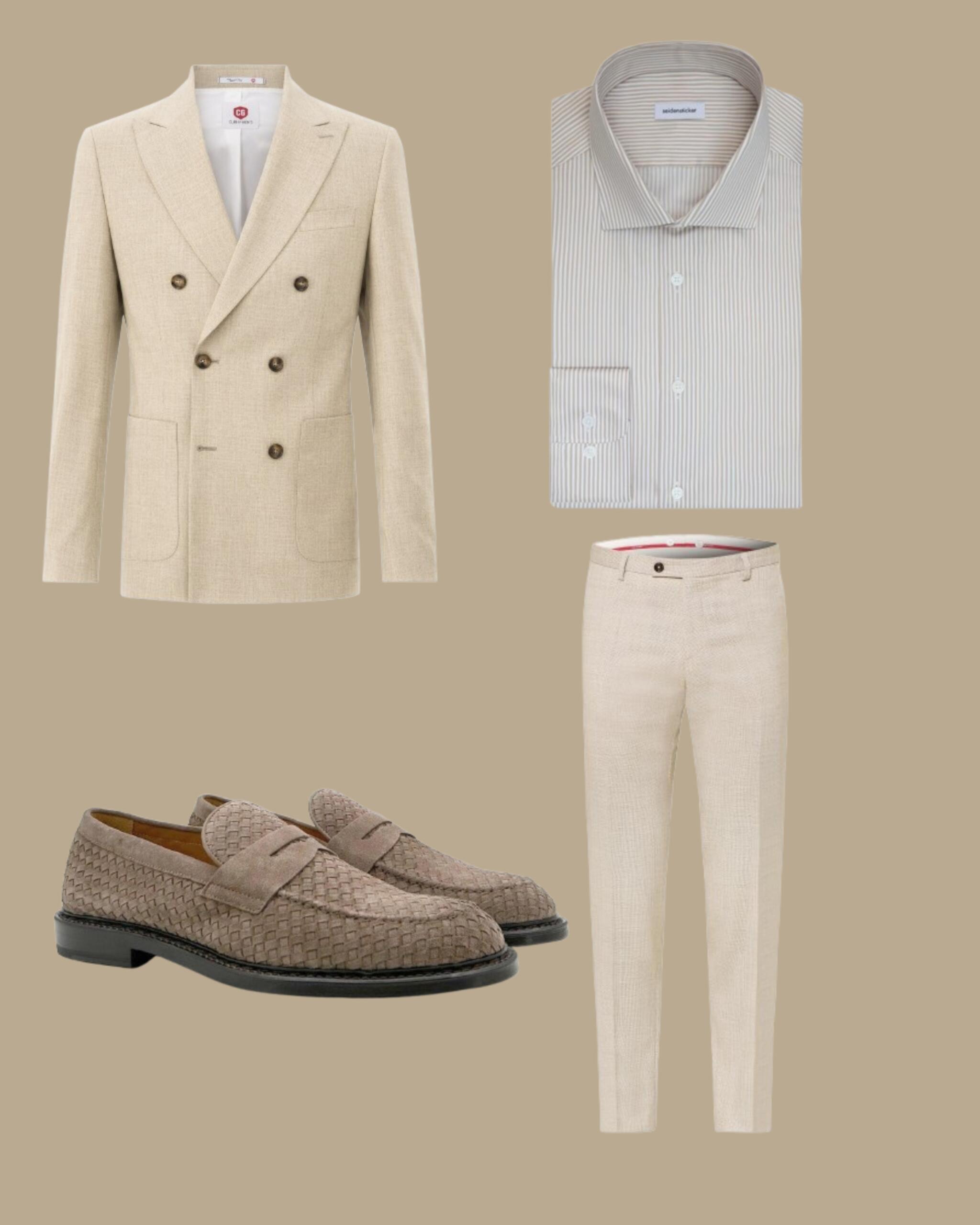 Ako mislite da su svijetlije nijanse rezervirane samo za vječanja na obali ili za ona na destinacijama poput jezera Como ili Toskane, tu smo da vas razuvjerimo. Naime, ako iskombinirate bež boju s dvorednim kopčanjem i zanimljivom košuljom s prugicama, kreirat ćete urbani outfit za vjenčanje. U svijetloj varijanti s decentno prugastom košuljom, ovaj outfit djeluje iznimno sofisticirano i odiše talijanskim stilom. Struktura sakoa daje širinu ramenima i definira siluetu, dok mokasine zadržavaju opuštenost koja sprječava da look djeluje previše formalan.