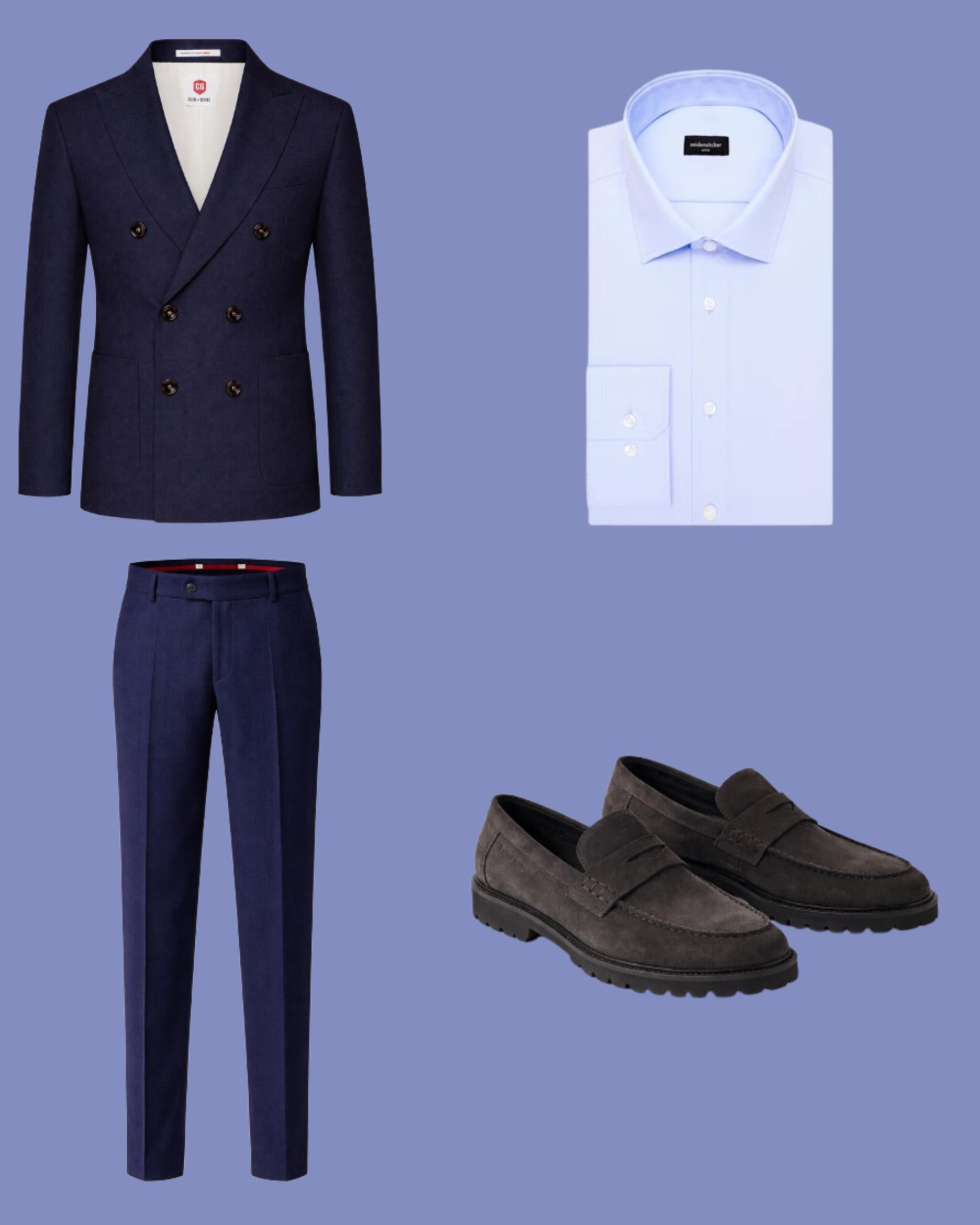 Tamnoplava verzija dvorednog odijela s klasičnom košuljom i robusnijim mokasinama donosi snažniji, večernji karakter. Ovo je izbor za muškarce koji žele izgledati dotjerano, ali i samouvjereno – bez potrebe za dodatnim modnim eksperimentima. Ovakav outfit dovoljno je formalan i elegantan za ulogu kuma, ali opet ističe stil osobe koja bira ovakvo odijelo.