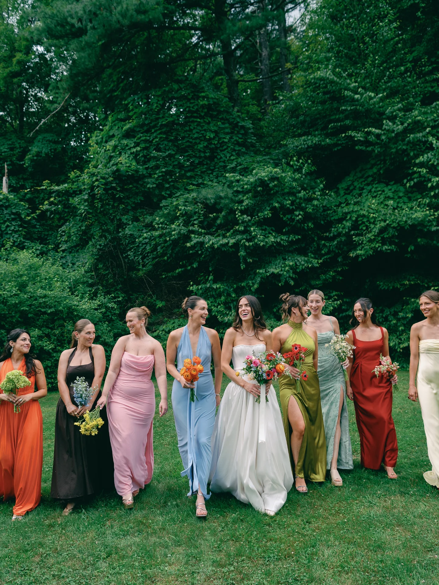 Bijela više nije jedini izbor. Pastelne nijanse poput lavande i maslac žute unose nježnost, dok se hrabrije mladenke okreću fuksiji, Kobaltno plavoj, kadulja zelenoj i maslinastim tonovima. Istovremeno, quiet luxury ostaje prisutan – kroz mat tkanine, čiste linije i sofisticiranu jednostavnost, posebno kod haljina za djeveruše.