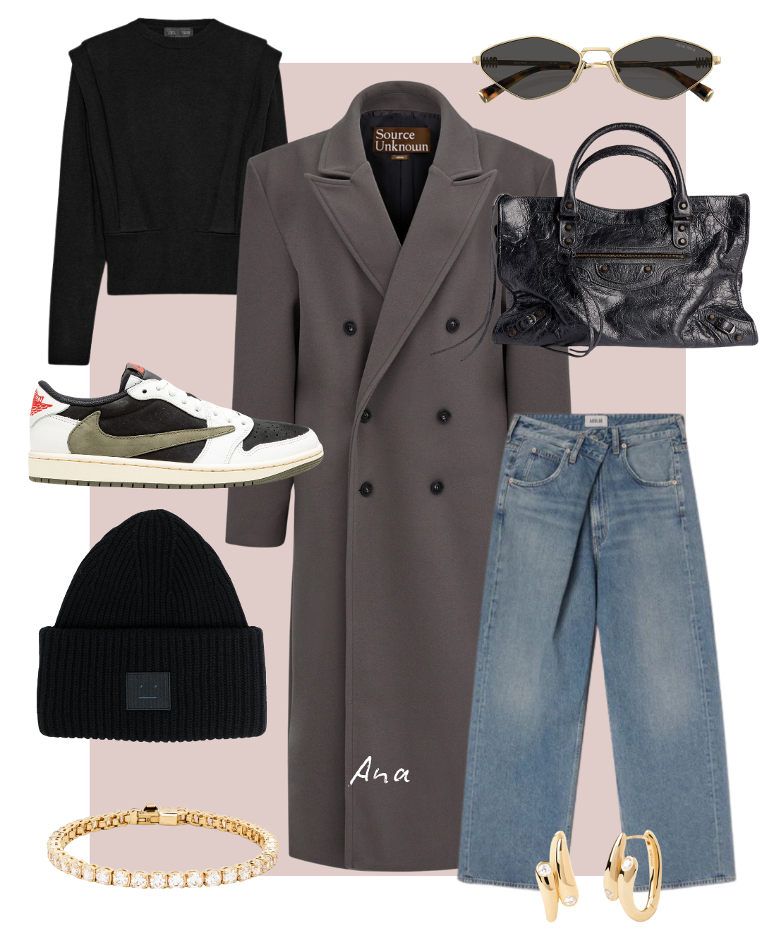 Beauty novinarka kreirala je odjevnu kombinaciju koja savršeno spaja luksuz i opušten stil. Oversized sivi kaput Source Unknown spaja klasiku i trendove, a u kombinaciji s širokim trapericama visokog struka Agolde i minimalističkim crnim puloverom Zara i kultnim tenisicama Air Jordan 1 Low kreiranim u u suradnji s rapperom Travisom Scottom. Pletena kapa Acne Studiostorba Balenciaga Le City, koja je ponovno jako popularna, transformiraju ovaj svakodnevni izgled u idealnu verziju urbanog poslovnog outfita uz dodatak upečatljivih sunčanih naočala Miu Miu i minimalistički nakit – naušnica PD Paola i tennis narukvice Swarovski.