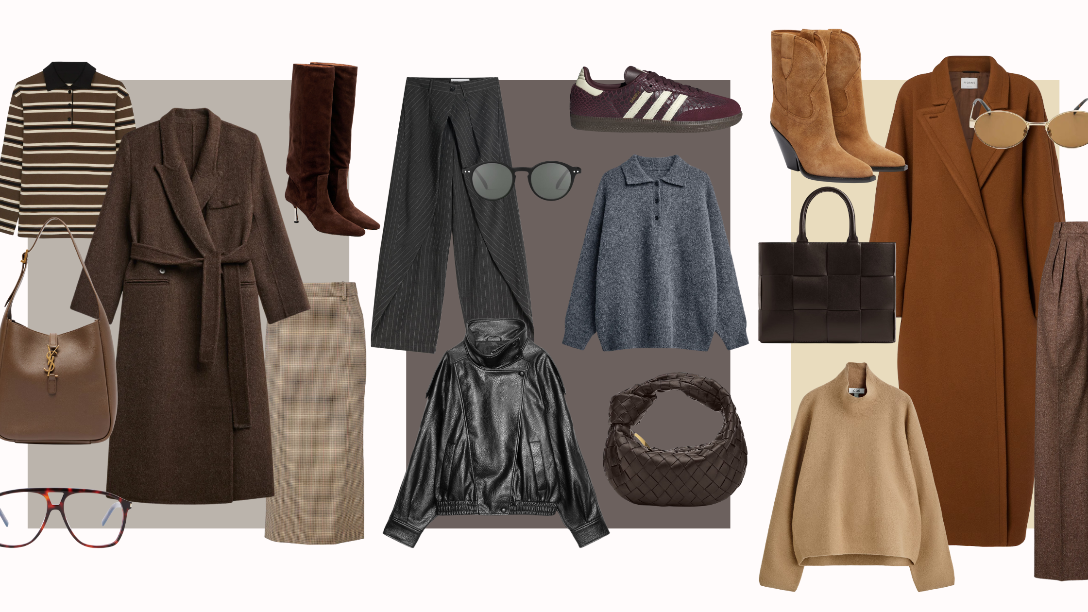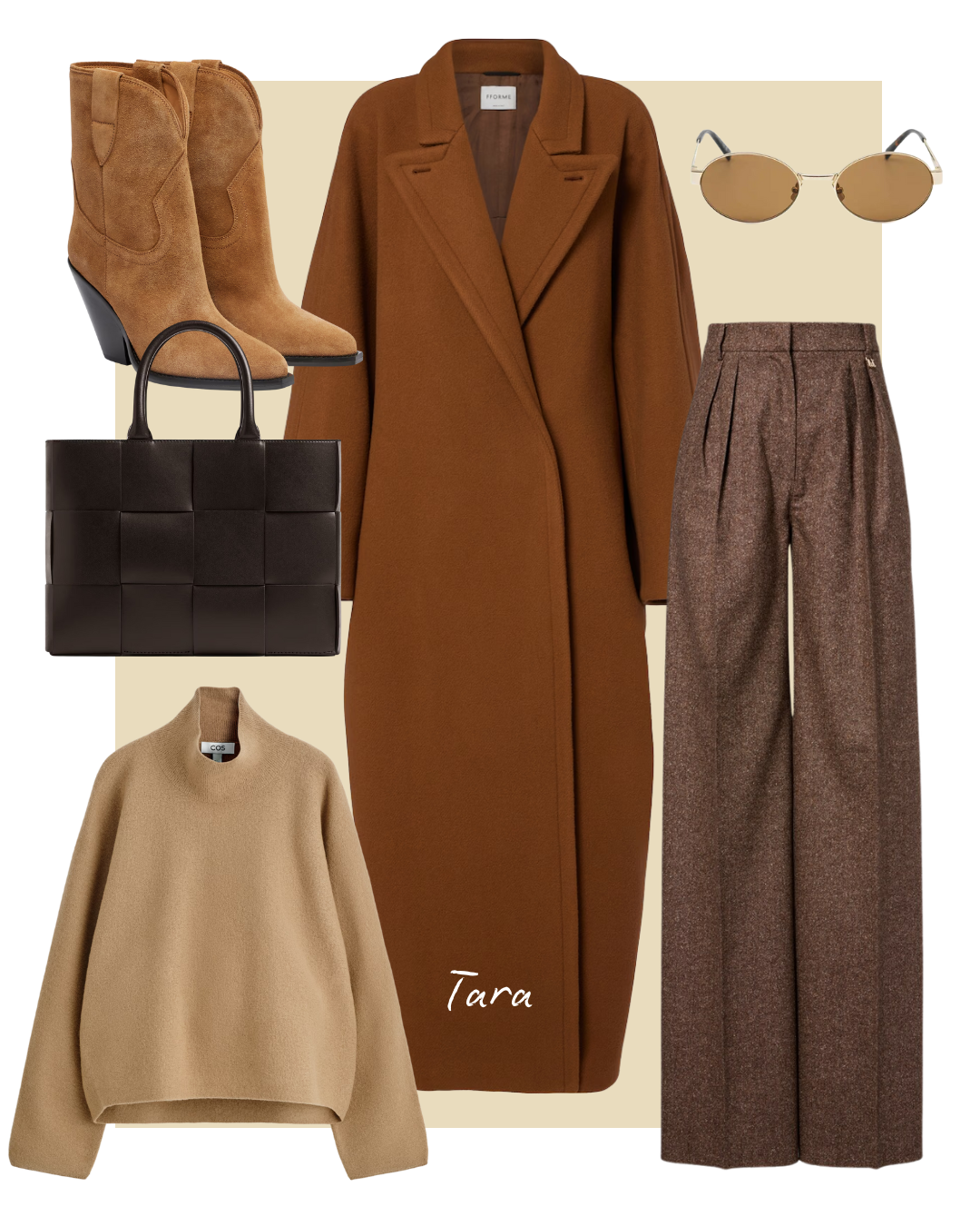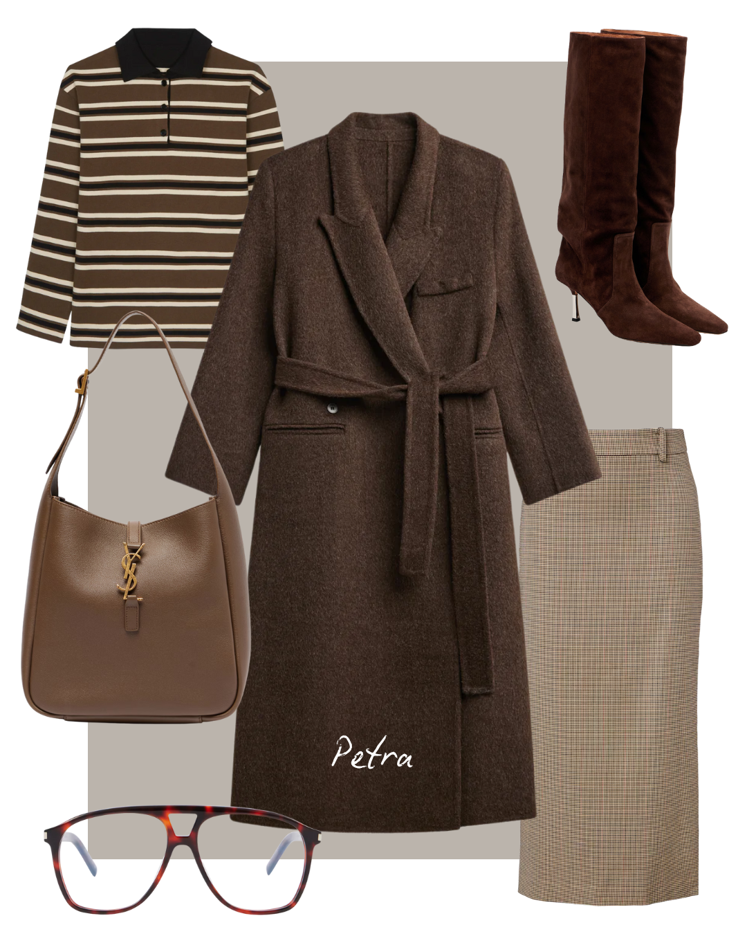Strateška direktorica i suosnivačica MagMe portala iskombinirala je uzorke i paletu toplijih tonova stvarajući elegantan i svevremenski look. U središtu pozornosti je smeđi vuneni kaput Frankie Shop, koji zbog remena stavlja naglasak na struk, dok karirana suknja i prugasta polo majica istog brenda pomoću uzoraka dodaju klasičnim krojevima zanimljiv izgled. Cijelu kombinaciju dodatno su podignuli luksuzni dodaci poput čizama od brušene kože u čokoladnoj nijansi Paris Texas, smeđe torbice Saint Laurent te upečatljivih dioptrijskih naočala s potpisom istog francuskog brenda.