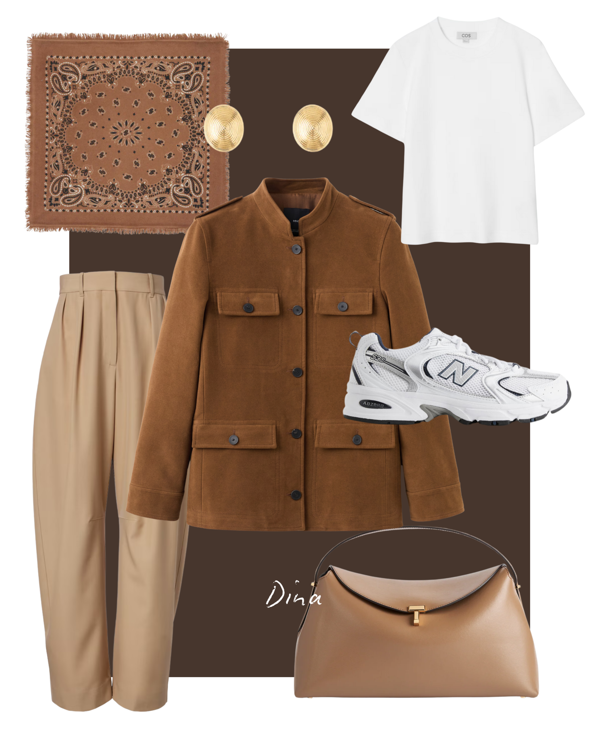 Naša glavna urednica kreirala je opušteniji poslovni outfit idealan za toplije dane tijekom zime, a koji se sastoji od safari sakoa s upečatljivim džepovima high street brenda Mango, casual verzije hlača na crtu s Loewe potpisom i bijelog t-shirta COS. S obzirom na to da zimi posebno cijeni udobnost odabrala je tenisice tenisice New Balance 530, koje pristaju uz sve, minimalističku torbu s ručkom Toteme T-Lock, bandanu od kašmira Kujten kao upečatljiv detalj jednostavnog outfita te jednostavne naušnice brenda Lié Studio. Cijeli outfit savršen je za ležeran dan na poslu koji spaja sofisticiranost i udobnost.