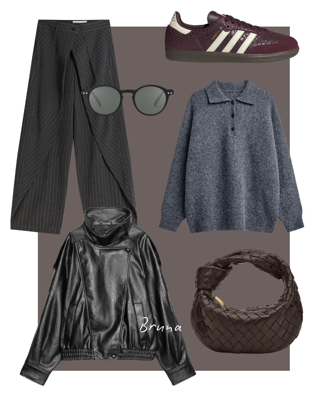 Naša novinarka iskombinirala je elemente poslovnog stylinga sa streetwear komadima. Bazu čine široke prugaste hlače zanimljivog kroja brenda Bershka, koje je spojila s polo puloverom The Frankie Shop i oversized jaknom od umjetne kože Zara. Kako bi pretežito sivom outfitu dodala malo boje odabrala je tenisice adidas Originals Samba u bordo nijansi koje savršeno pristaju uz torbicu Bottega Veneta Mini Jodie u istoj nijansi. Završni detalj ovog outfita čine minimalistički okviri sunčanih naočala s potpisom francuskog brenda Izipizi.