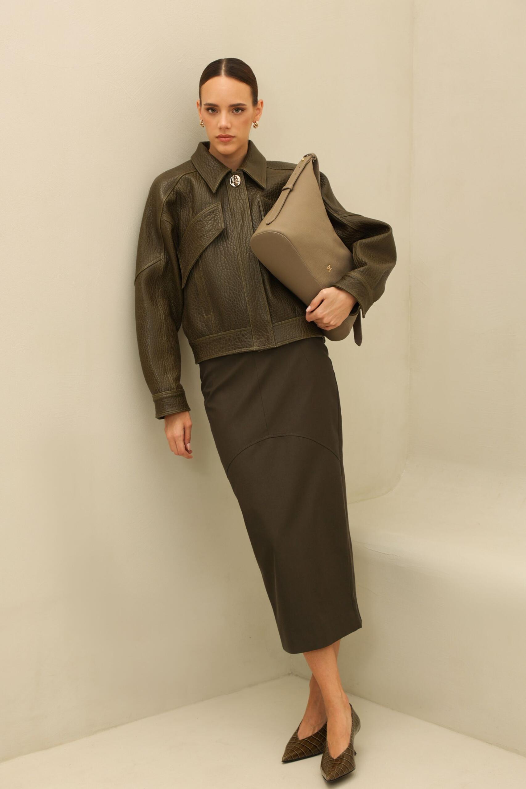 Za oko nam je posebno zapela bordo suknja do gležnjeva koja je visokog struka te ima detalj remena s atraktivnom kopčom. Ovaj komad nosili bismo u kombinaciji s košuljom ili minimalističkim topom te slingback cipelama. Na našoj shopping listi odmah je završila i maslinastozelena jakna s visokim ovratnikom kraćeg kroja s pomalo oversized siluetom koja može biti dio elegantnih, ali i casual outfita. A kad nosimo u potpunosti jednostavnu kombinaciju, onda biramo modne dodatke u boji – clutch od glatke nabrane kože s kopčom čini se idealan izbor za podignuti svak outfit.