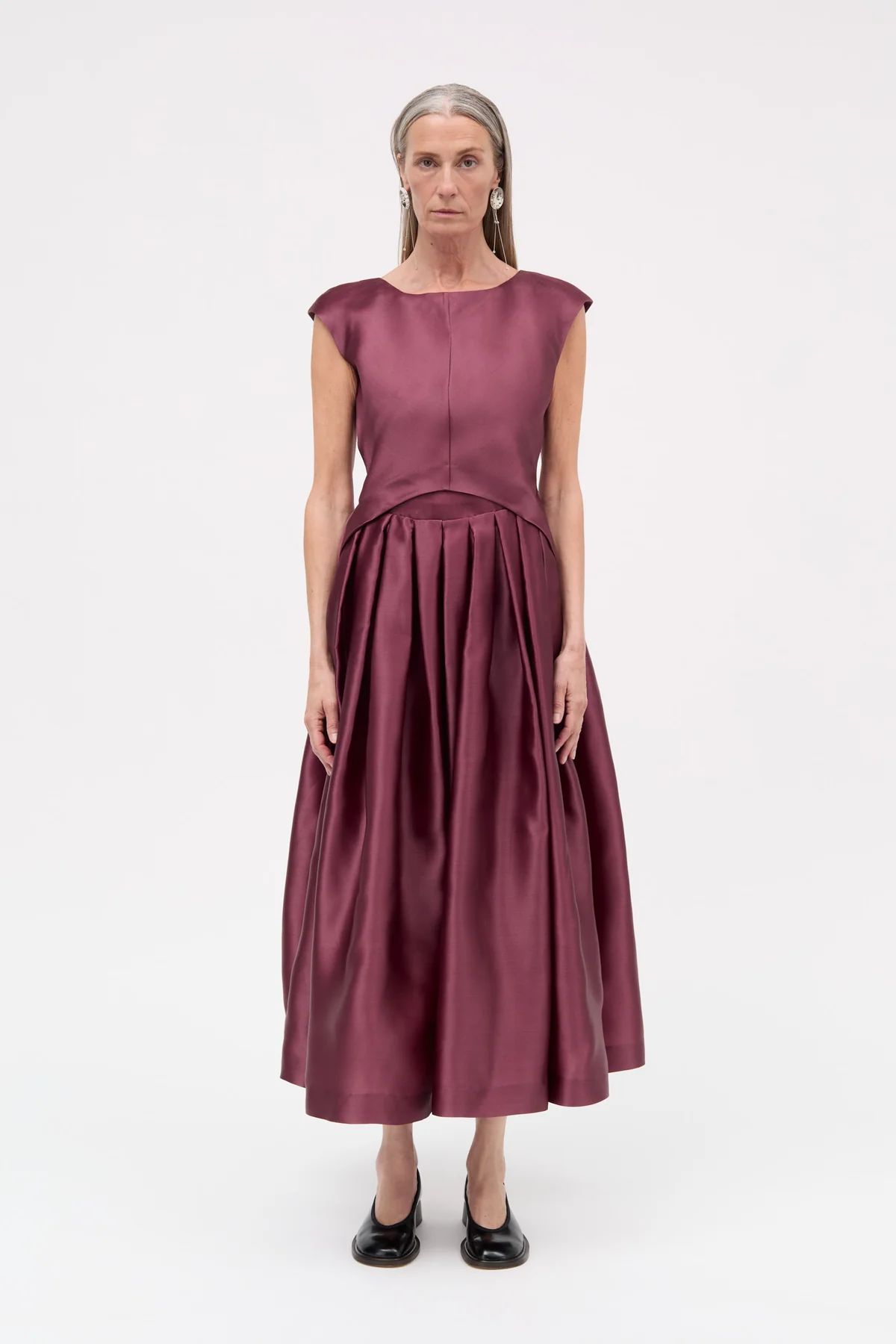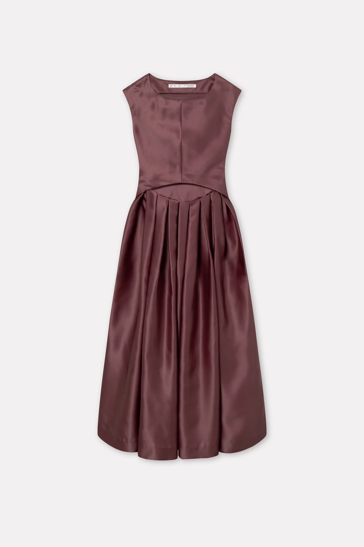 Tako je minimalistički gornji dio bez rukava u kontrastu s raskošnom suknjom s detaljima faldi, a s obzirom na materijal do kojeg je izrađena, ova haljina postaje još efektnija kad se krećete – svila kao da lepršava oko vas u donjem dijelu.