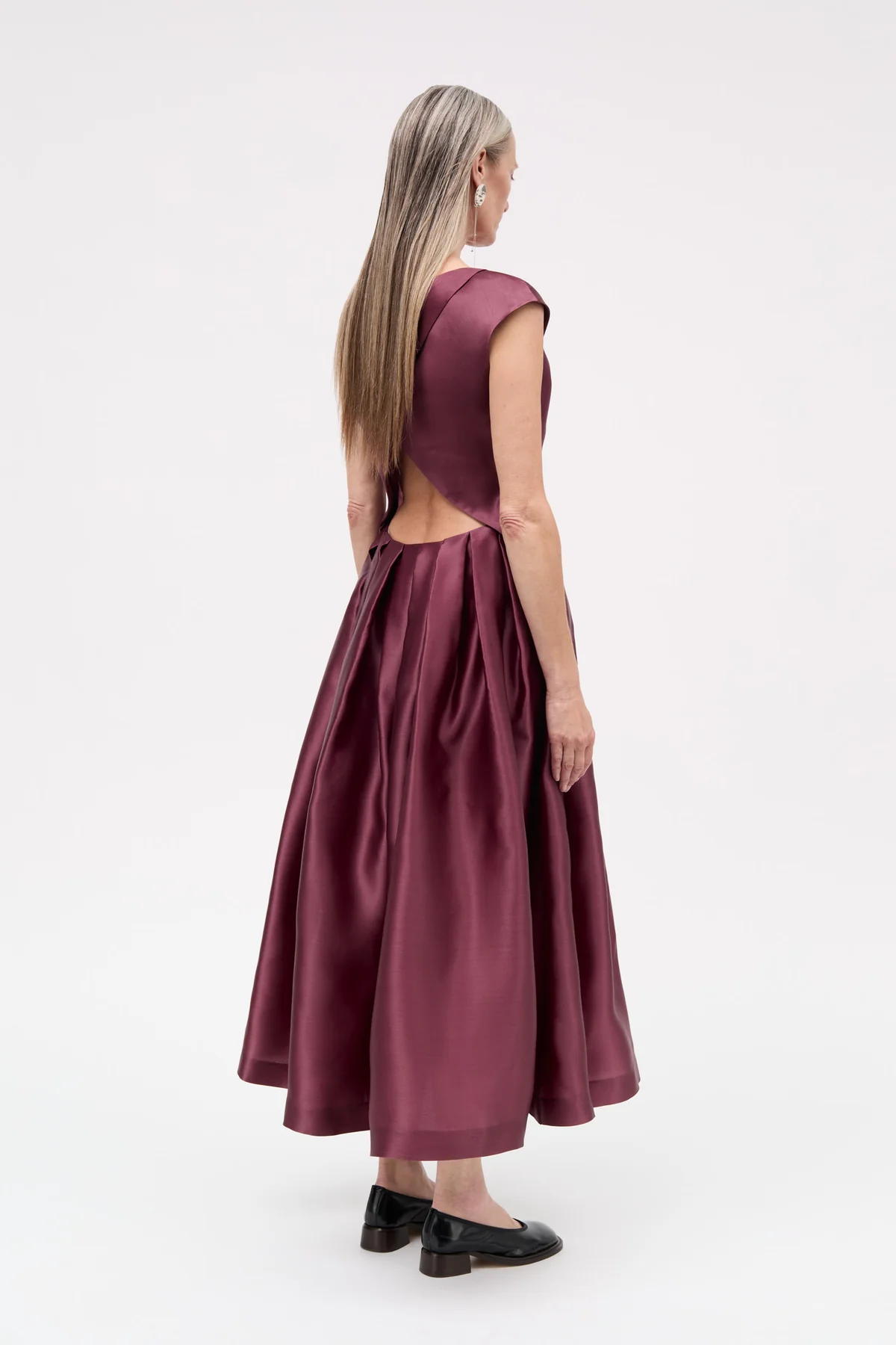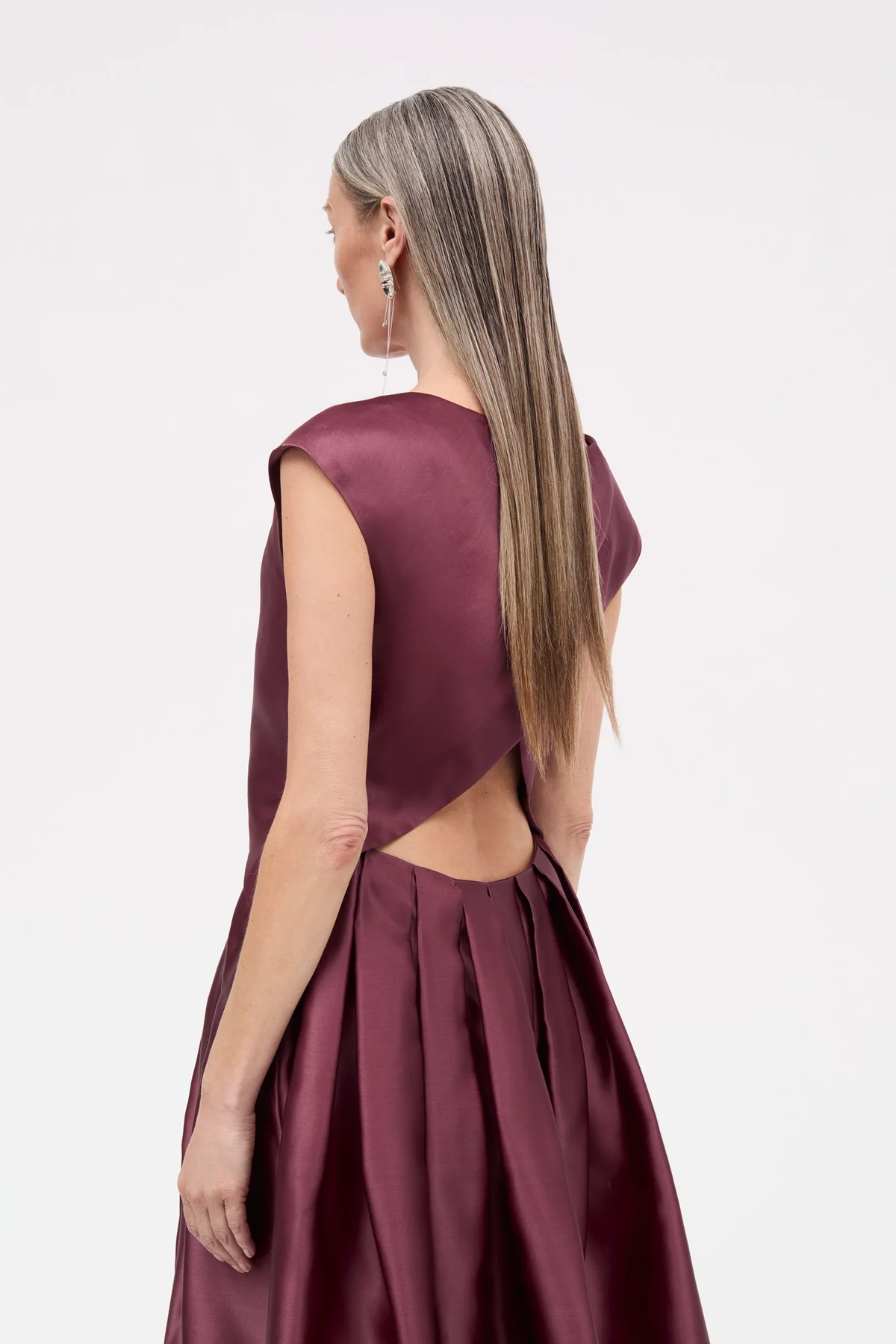 Kao da to već nije dovoljno da privuče pažnju, ova haljina ima prorez na donjem dijelu leđa koji modelu daje poželjnu dozu senzualnosti. Svečani model izrađen je od svile u boji crvenog vina što daje dodatnu eleganciju ovom modelu koji seže do gležnjeva.