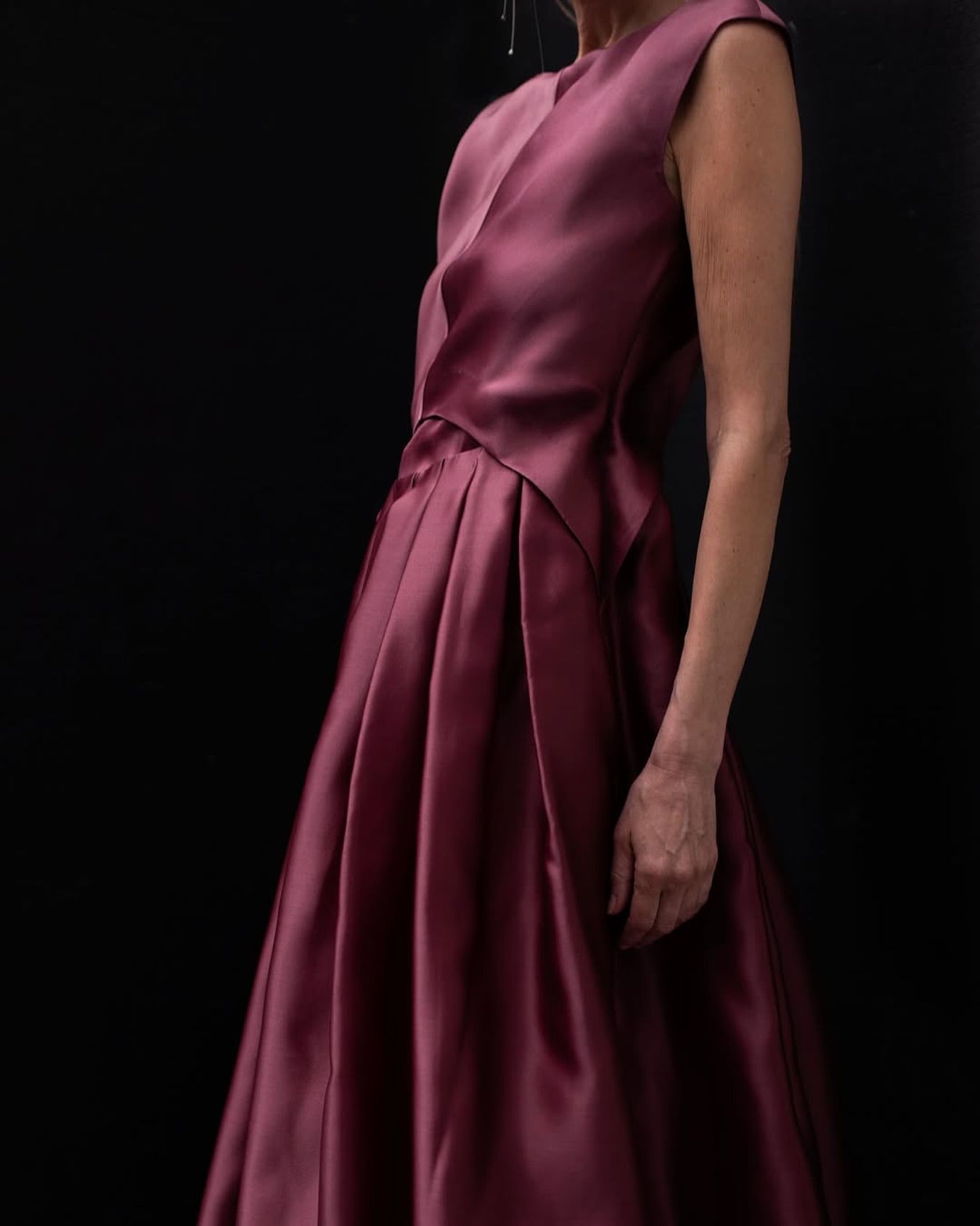 Tako je minimalistički gornji dio bez rukava u kontrastu s raskošnom suknjom s detaljima faldi, a s obzirom na materijal do kojeg je izrađena, ova haljina postaje još efektnija kad se krećete – svila kao da lepršava oko vas u donjem dijelu.
