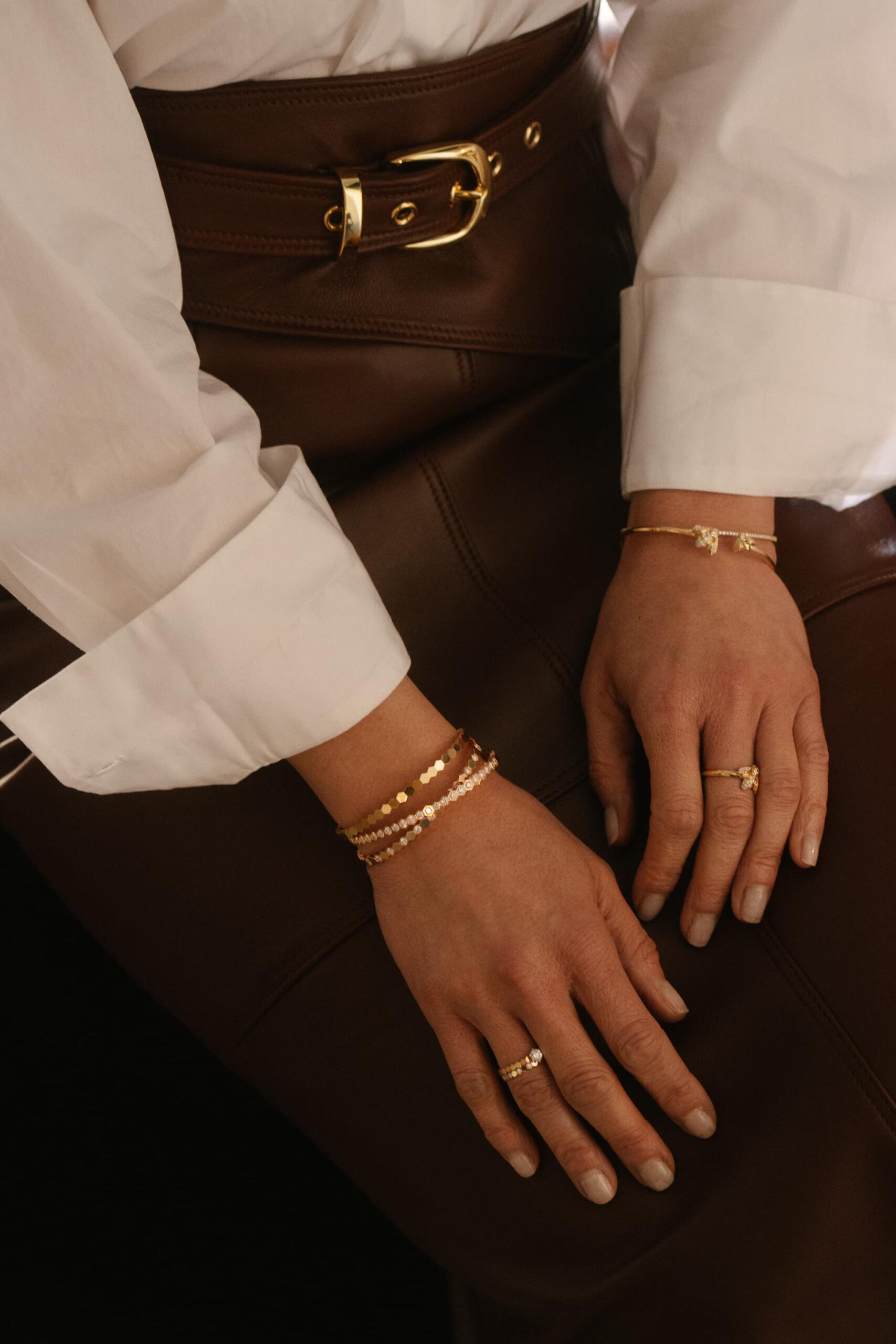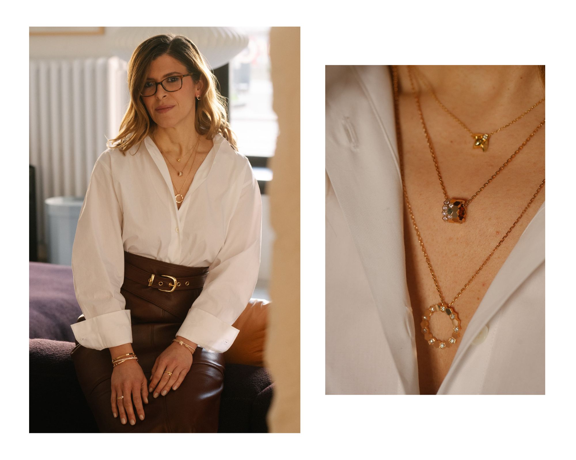 Lijevo: Messika ogrlice Move Classique Ciselé, Ref.14667-YG i Baby Move Pavé, Ref. 04322-WG; desno: Messika prstenje; My Twin, Ref. 06705-YG i 06636-YG, Move Noa, Ref. 06262-YG, i Move Classique Pavée, Ref. 04000-YG, narukvice Move Ciselé, Ref. 14481-YG i Skinny, Ref. 06097-YG