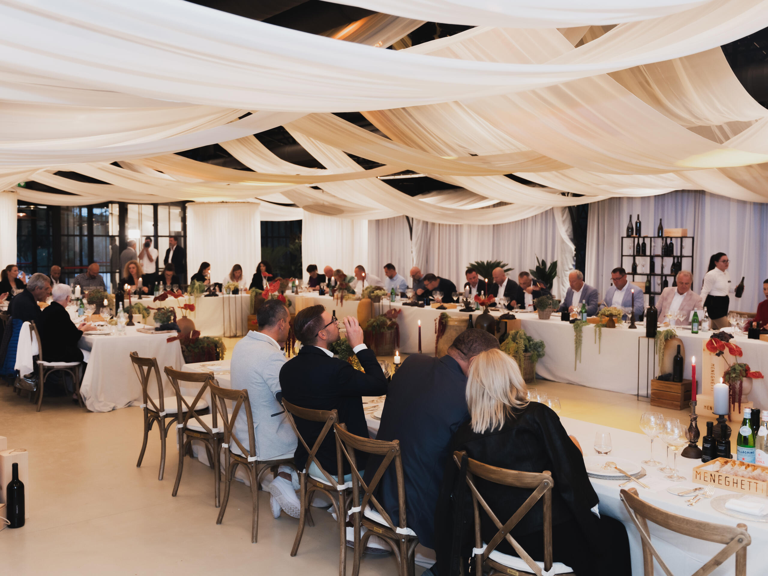 Atmosferu večeri zaokružila je elegancija Meneghettija: od pomno odabranog jelovnika do sofisticiranog ambijenta koji je dodatno naglasio važnost trenutka – trenutka u kojem se vino ne doživljava samo kao piće, nego kao iskustvo. Uz nove berbe dvaju vina uzvanici su imali priliku kušati starije berbe u magnumu i jeroboamu koje su pokazale raskoš i potencijal tih vina.