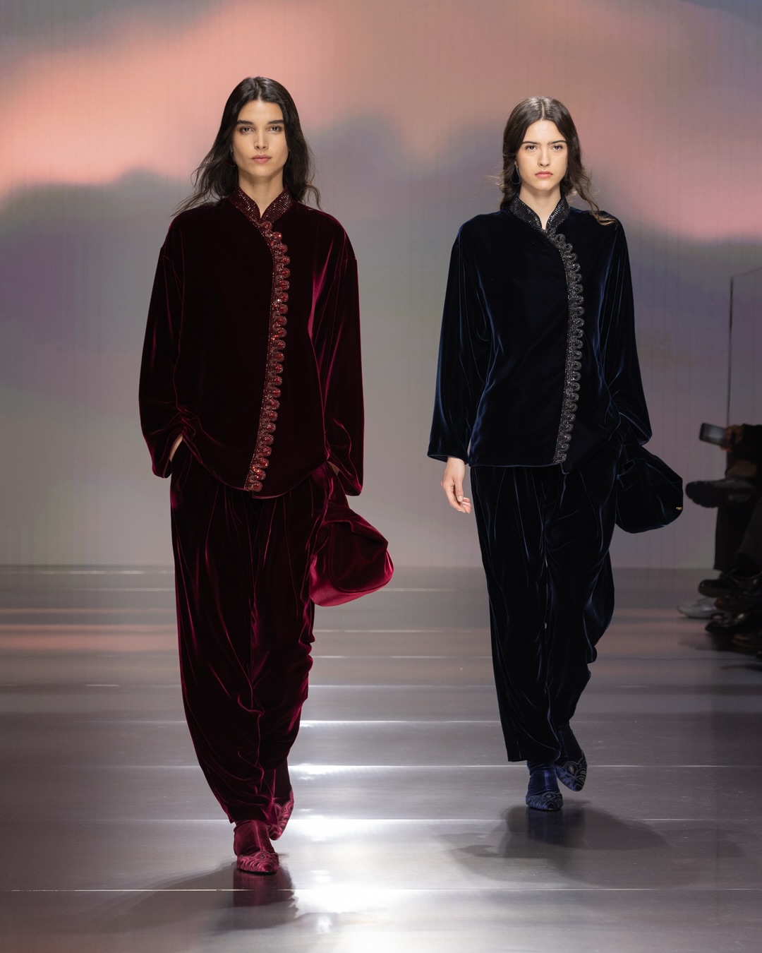 Kuća Giorgio Armani predstavila je kolekciju u tri dijela. Prvi dio revije, sastojao se o svevremenskih komada poput širokih hlača, jakni visokih ovratnika i odijela u sivoj nijansi s bordo detaljima – remenima, cipelama i torbicama. Drugi dio revije povezao se sa bordo nijansom i pistom su “prošetali” elegantniji komadi napravljeni od svile. Majice koje je kopčaju samo oko vrata, svilene bomber jakne i široke hlače u plavoj nijansi uz cvjetne motive bordo boje. Treći dio revije u fokus je stavio komade kreirane samo od baršunaste tkanine, a za oko su nam zapele haljine ravnog kroja sa džepovima koje su se vezale samo oko vrata, s otvorenim leđima.