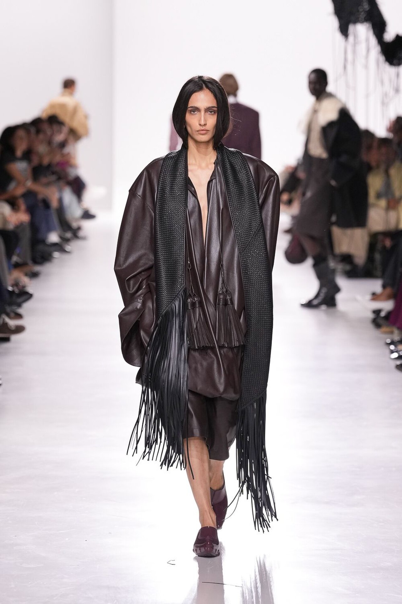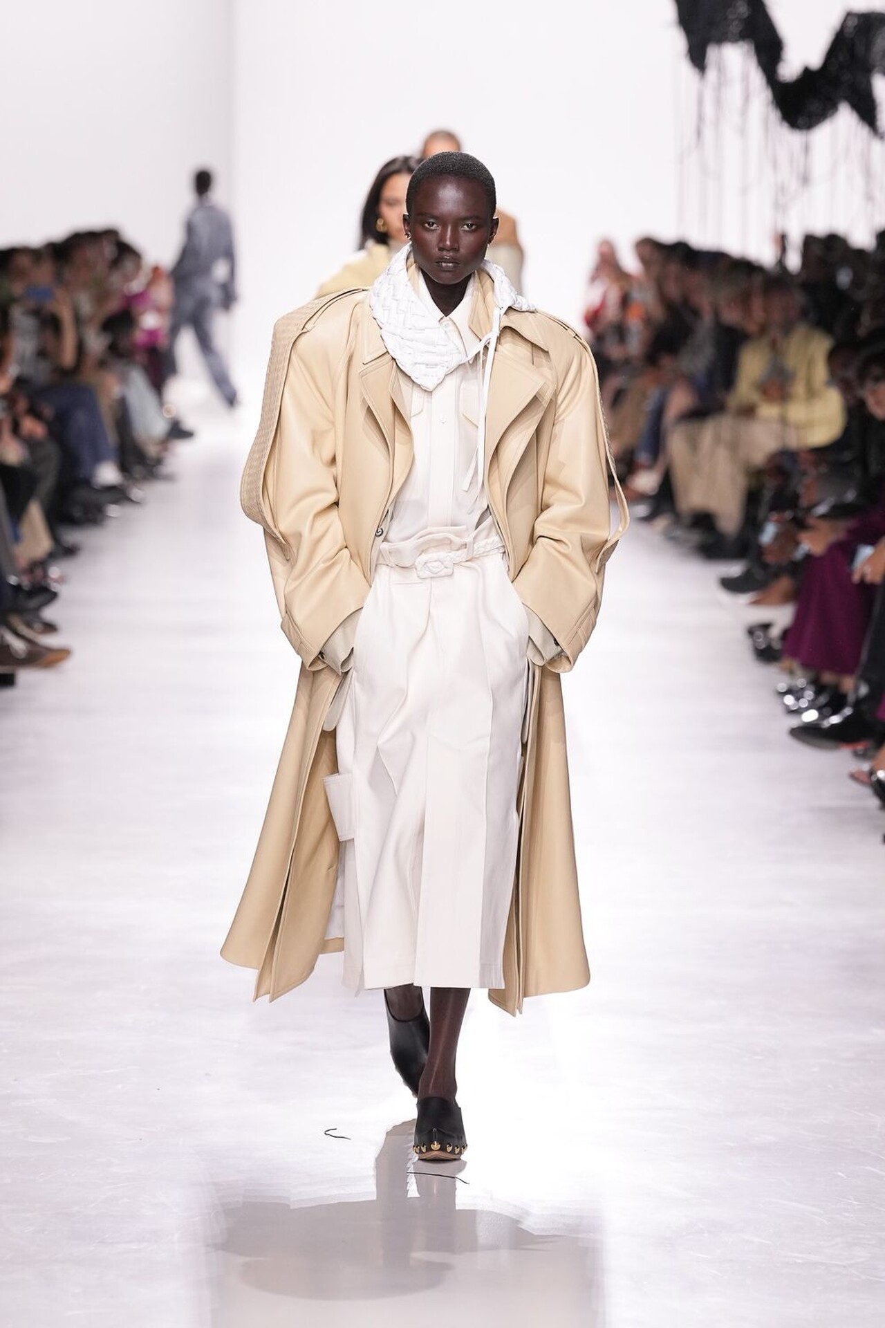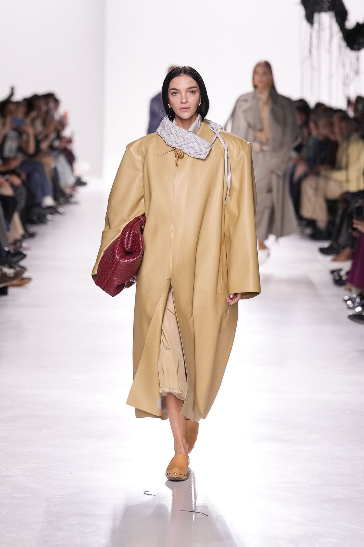Revija se tako snažno oslanjala na odanost brenda prema zanatskog izradi, ali Trotter je pritom unijela i svježinu u prepoznatljivu estetiku kuće. Naslanjala se naravno na intrecciato tehniku izrade koja je vidljiva na gotovom svakom odjevnom komadu, pa tako i dodatku. Pletenu kožu gledali smo na kaputima, hlačama, maramama i naravno – torbama – koje su u njezinoj viziji nešto slobodnije strukture.