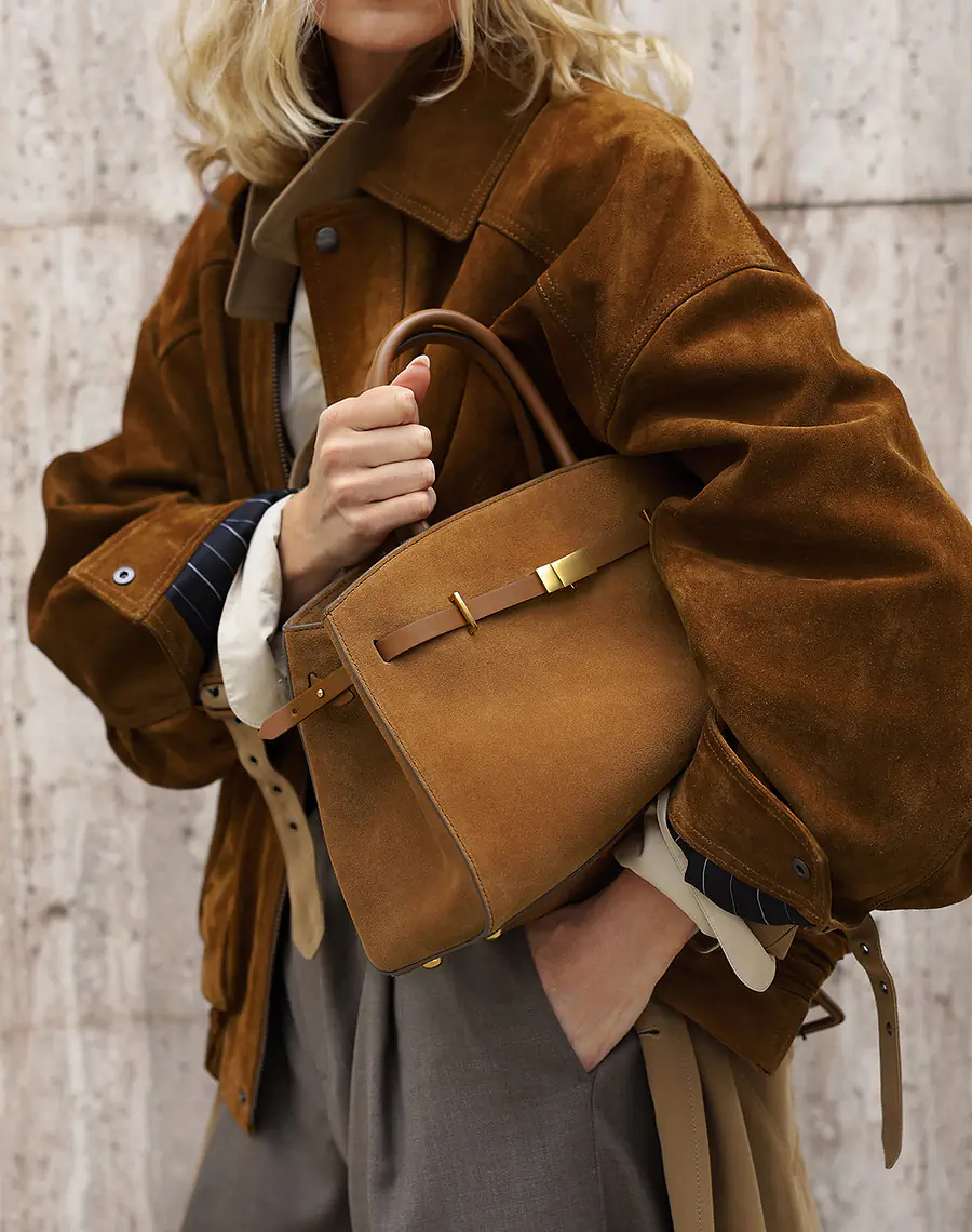 Švedska influencerica i zagovornica održivosti Emelie Lindmark, pristupila je dizajnu iz perspektive praktičnosti. Kao novopočena mama, željela je torbu koja je funkcionalna, ali i elegantna. Izabrala je mocha nijansu brušene kože s detaljima u lizard efektu – tekstura koja je topla, a sofisticirana. Radi se o torbi koja savršeno spaja stil i svakodnevnu funkcionalnost. Svevremenska silueta i suptilna luksuzna završna obrada čine ga idealnom torbom za nošenje svih bitnih stvari.