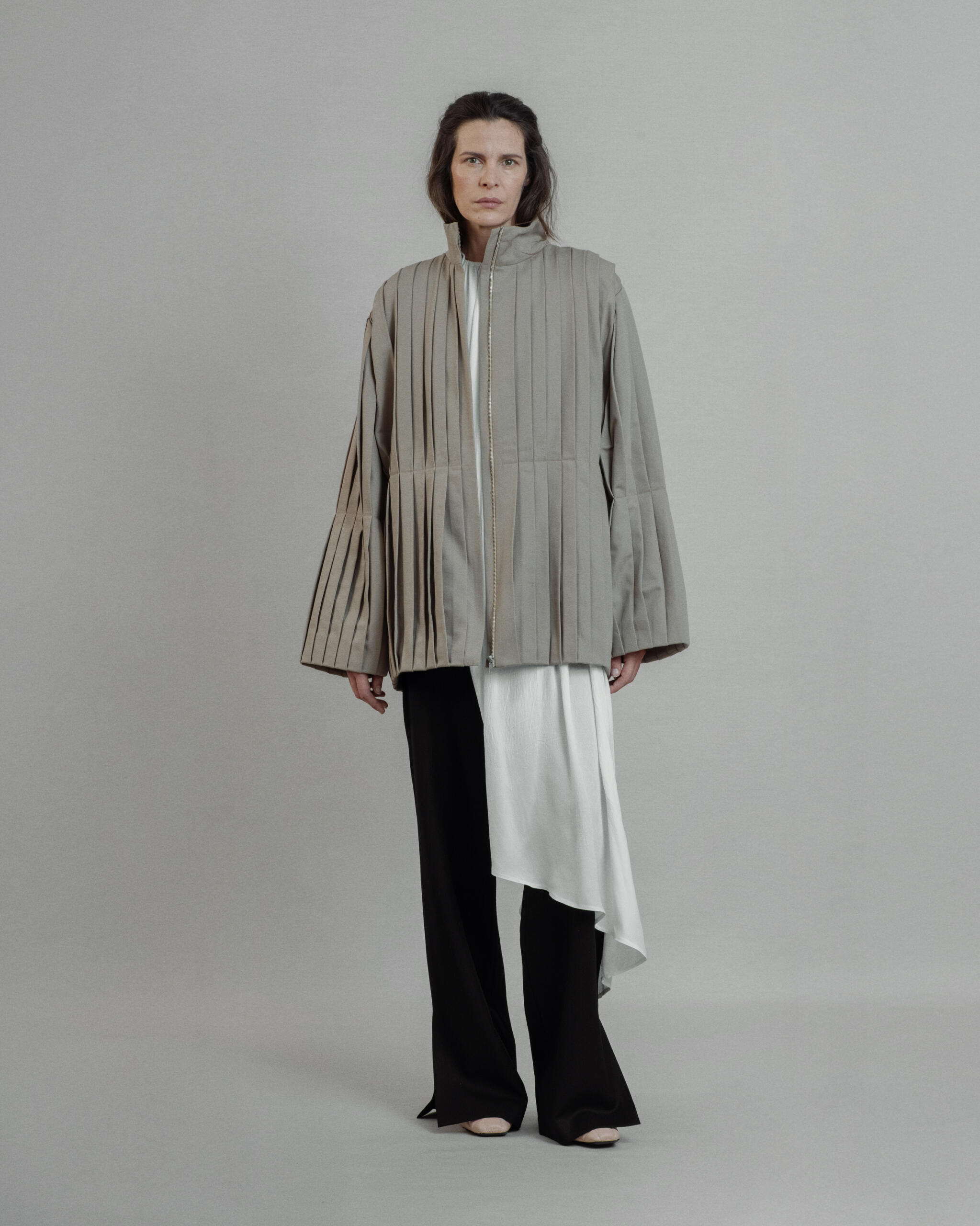 Kulušić posebno naglašava dualnost kao nit vodilju, kontrast nabrane i punjene strukture naspram ravnih, glatkih površina, ali i tradicionalno krojenih formi obogaćenih modernim, neočekivanim elementima. Riječ je o odjeći koja je praktična, no istovremeno drugačija, ona koja ostavlja dojam bez potrebe za glasnom gestom.