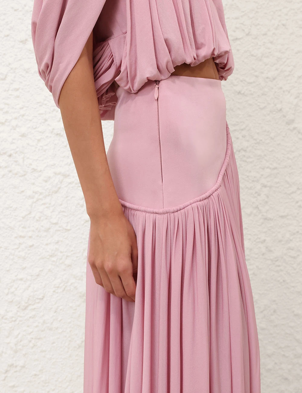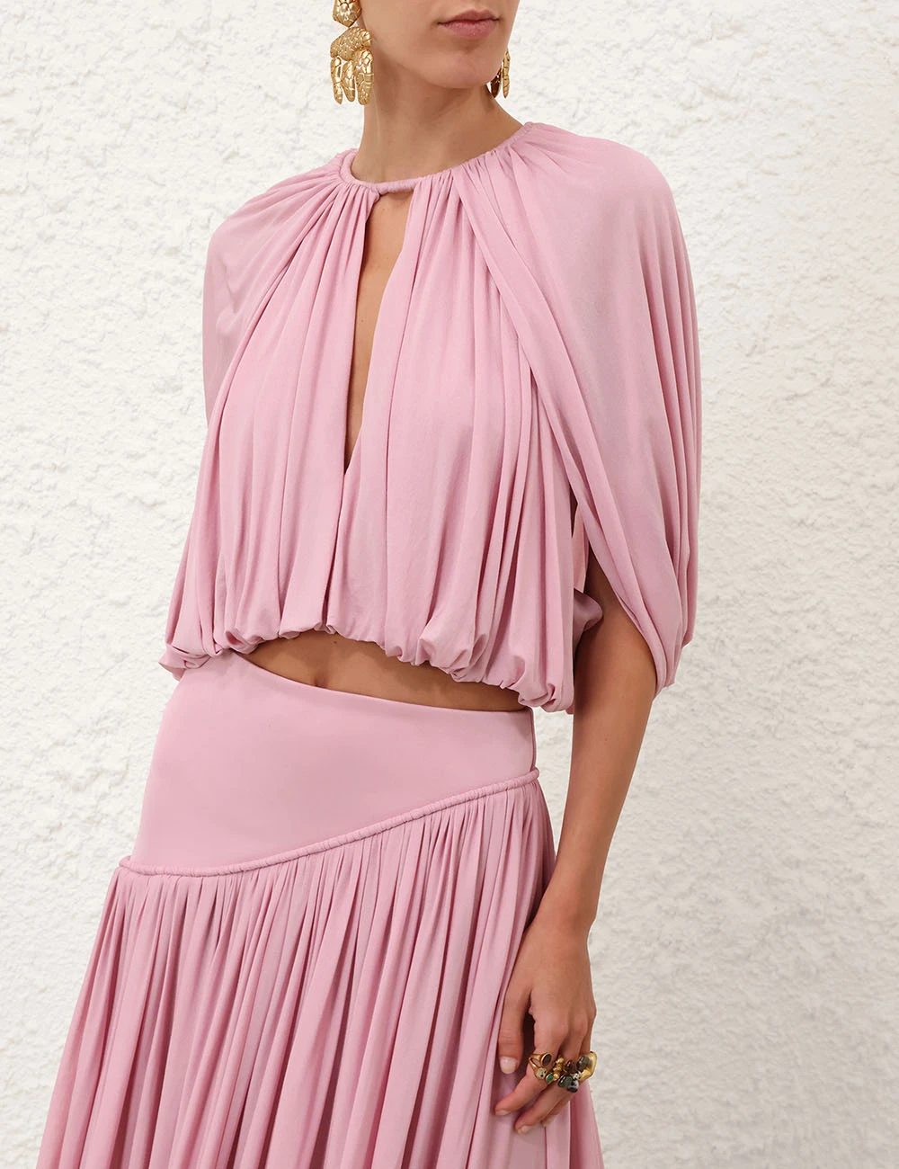 Riječ je o setu koji spaja bluzu nalik na plašt i asimetričnu maksi suknju, stvarajući siluetu koja izgleda gotovo nestvarno. Gornji dio u crop kroja dodatno je naglašen dubokim V-izrezom koji suptilno naglašava dekolte, dok raskošno drapirani rukavi s naborima unose dozu dramatike i pokreta u svaki korak. Elastični završeci ublažavaju strogoću kroja i daju mu ležernu mekoću, zbog čega komplet djeluje luksuzno, ali nenametljivo.