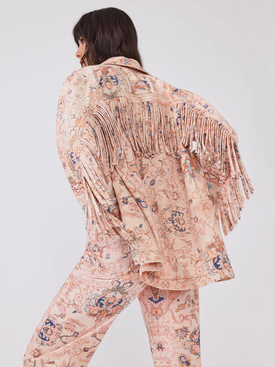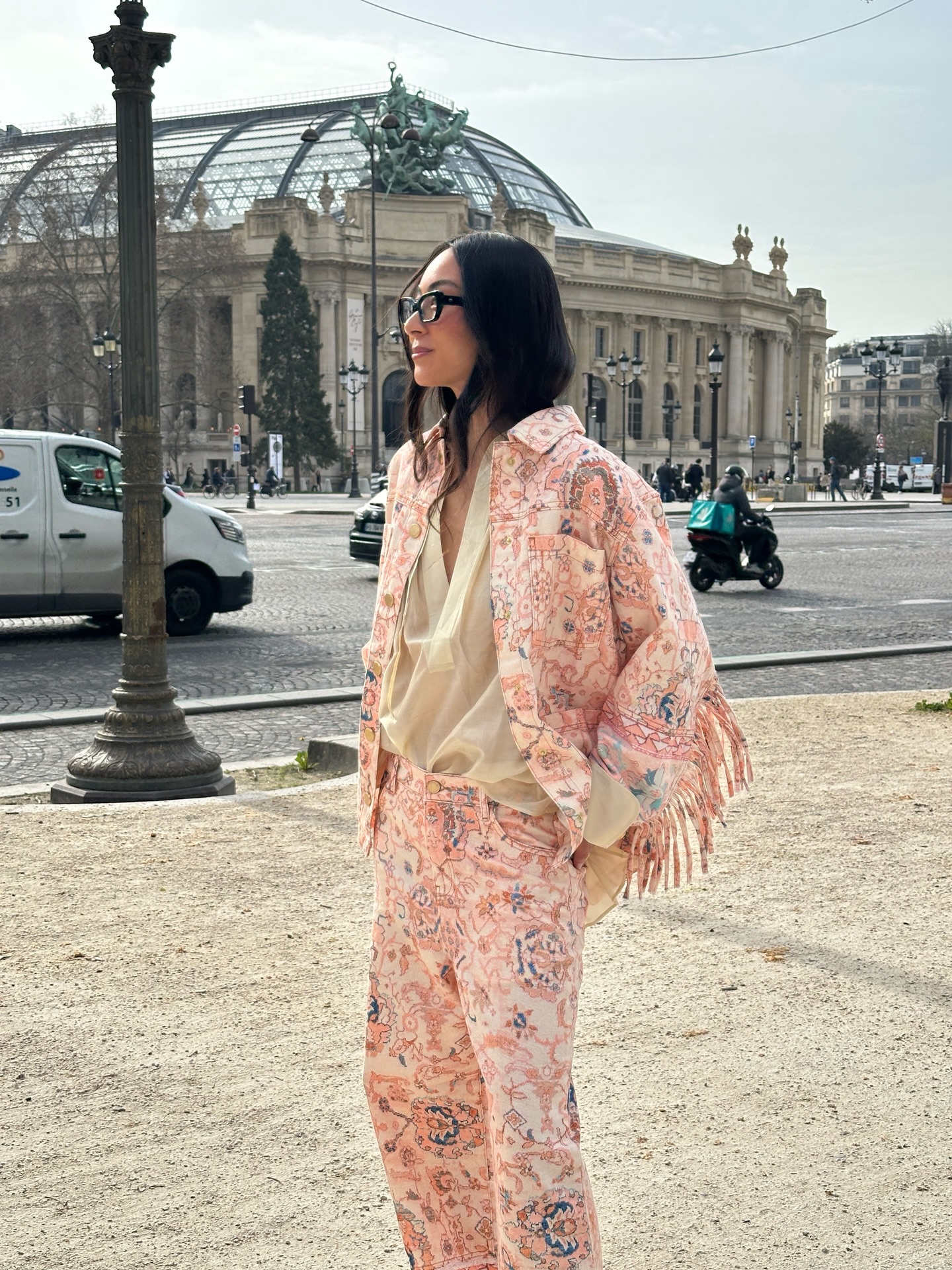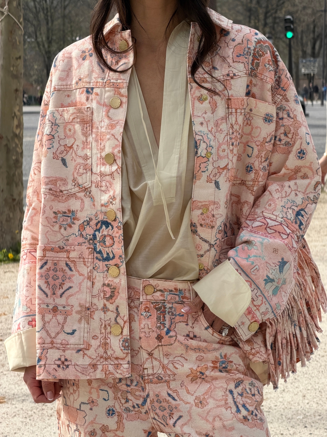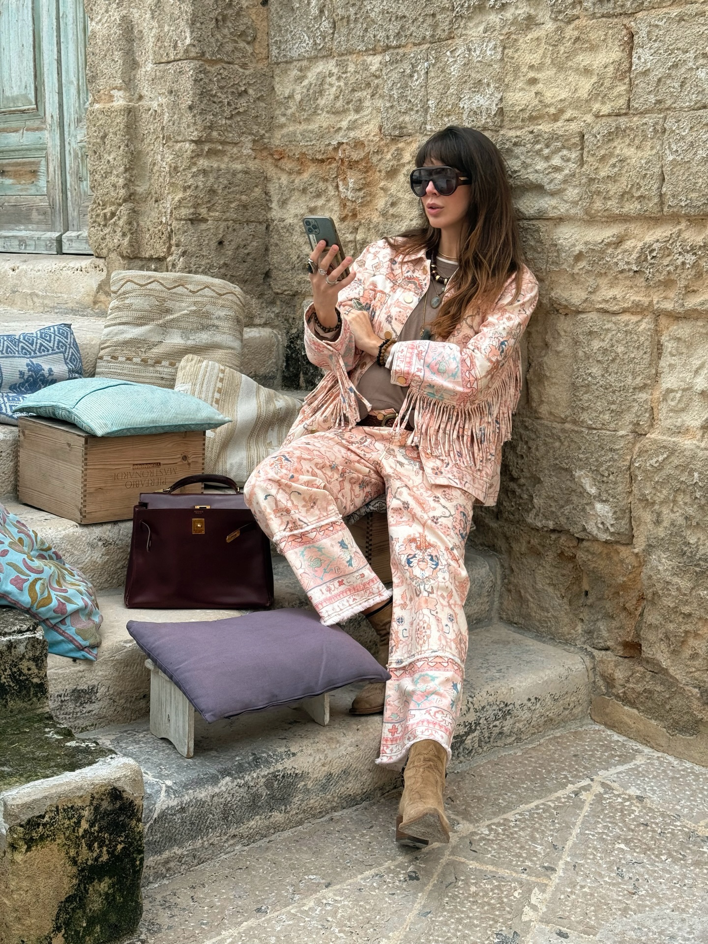 Riječ je o ružičastom kompletu koji se sastoji od jakne i hlača, boho je stila i i detaljno je ukrašen printom inspiriranim tradicionalnim country motivima. Oba komada napravljena su od 100-postotnog pamuka, a na manžetama jakne se nalaze i široke resice koje se prostiru i po stražnjoj strani jakne.