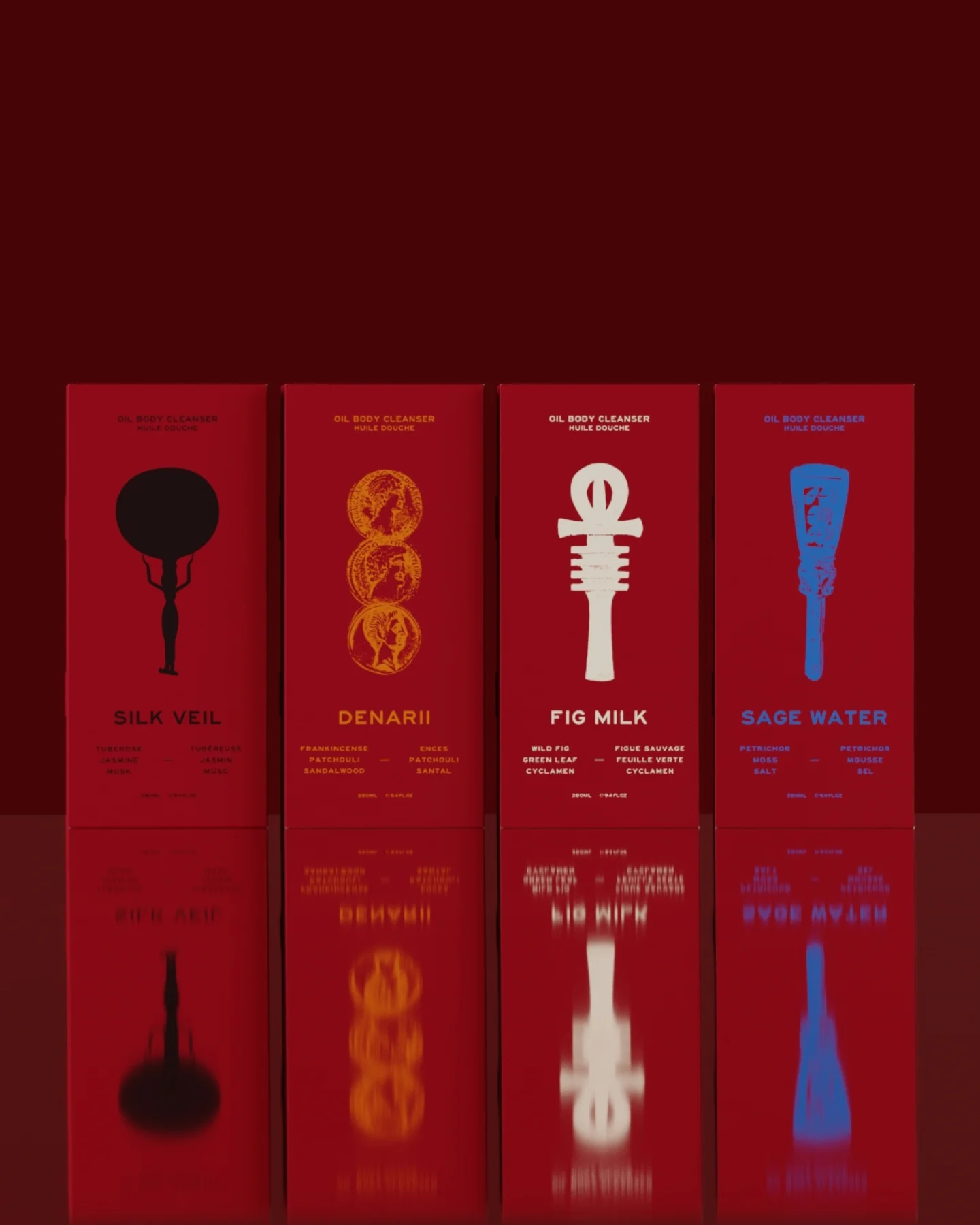 Sage Water i Denarii napravljeni su kao jači mirisi – Sage Water napravljen je od mirisa pačulija, drvo cedra, soli i mahovine; a Denarii napravljen je od mirisa tamjana, pačulija i sandalovine, dok su Fig Milk i Silk Veil napravljeni na bazi cvjetnih mirisa, poput ciklame i jasmina.