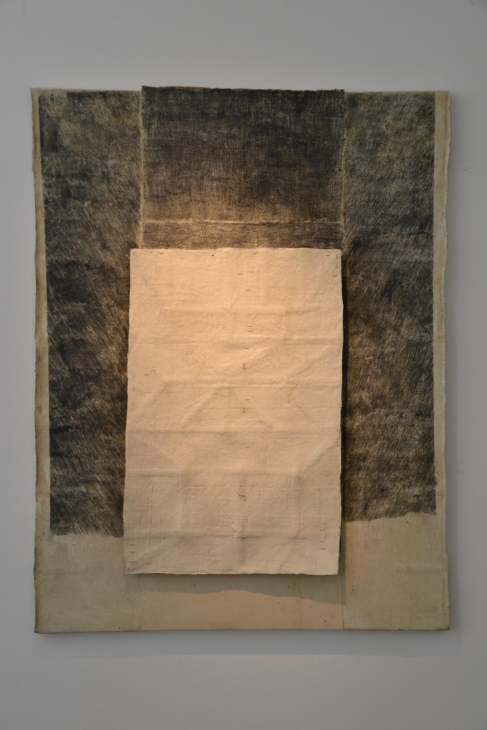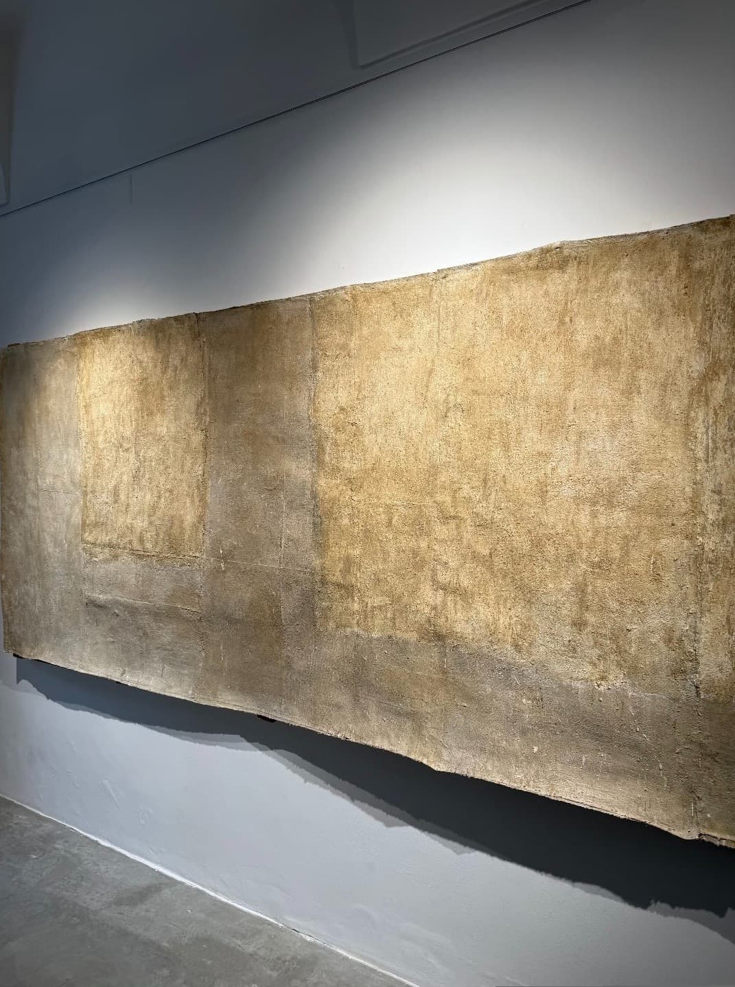 U monumentalnim slikama-objektima otvara sasvim drugi svijet: drveni distanceri, mineralni slojevi, hrapave površine — sve to stvara dubinu koju ne vidimo odmah, nego je naslućujemo tek kad joj priđemo bliže. Kao da se u unutrašnjosti svakog rada odvija nešto tiho, nepoznato, ali prisutno.