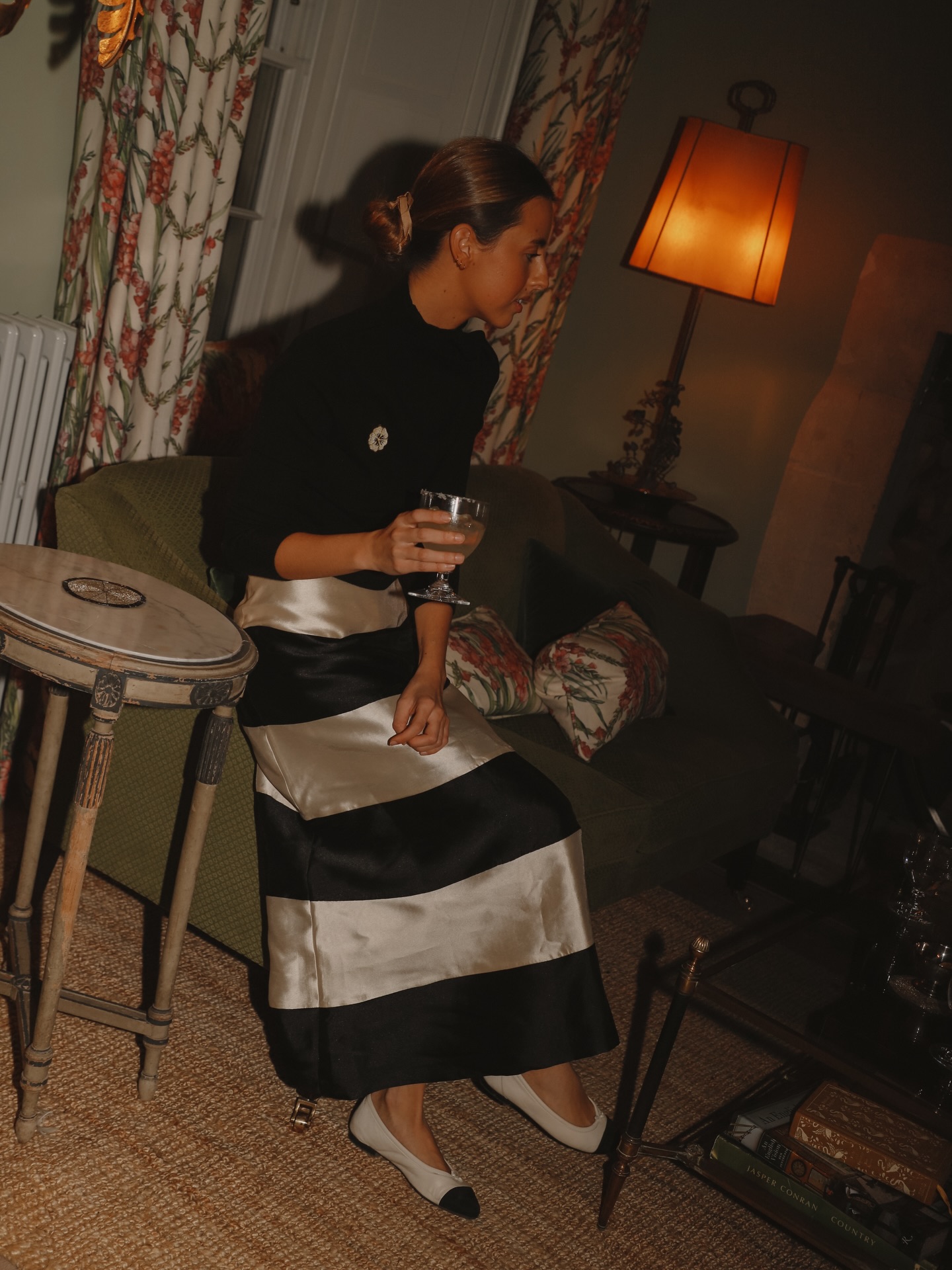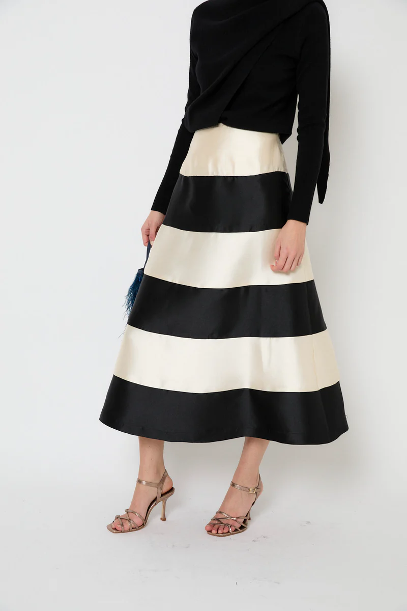 Midi suknja A-kroja izrađena od satenske tkanine, a pažnju privlači na prvu zbog širokih vodoravnih prugica u prljavobijeloj i crnoj boji. Izgleda veoma otmjeno, a baš se zbog toga može kombinirati uz basic komade kojima će dati dozu sofisticiranosti ili one svečane.