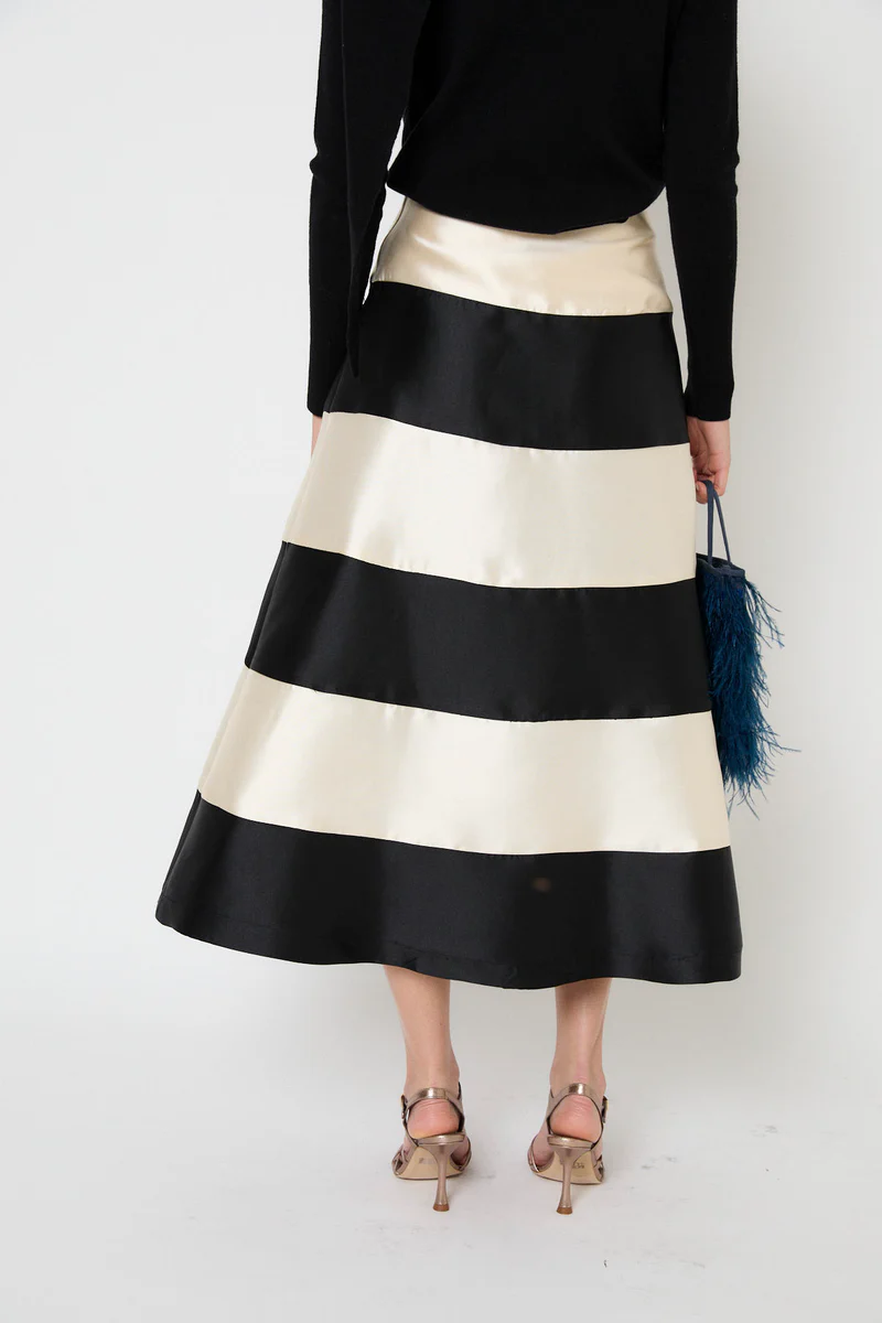 Midi suknja A-kroja izrađena od satenske tkanine, a pažnju privlači na prvu zbog širokih vodoravnih prugica u prljavobijeloj i crnoj boji. Izgleda veoma otmjeno, a baš se zbog toga može kombinirati uz basic komade kojima će dati dozu sofisticiranosti ili one svečane.