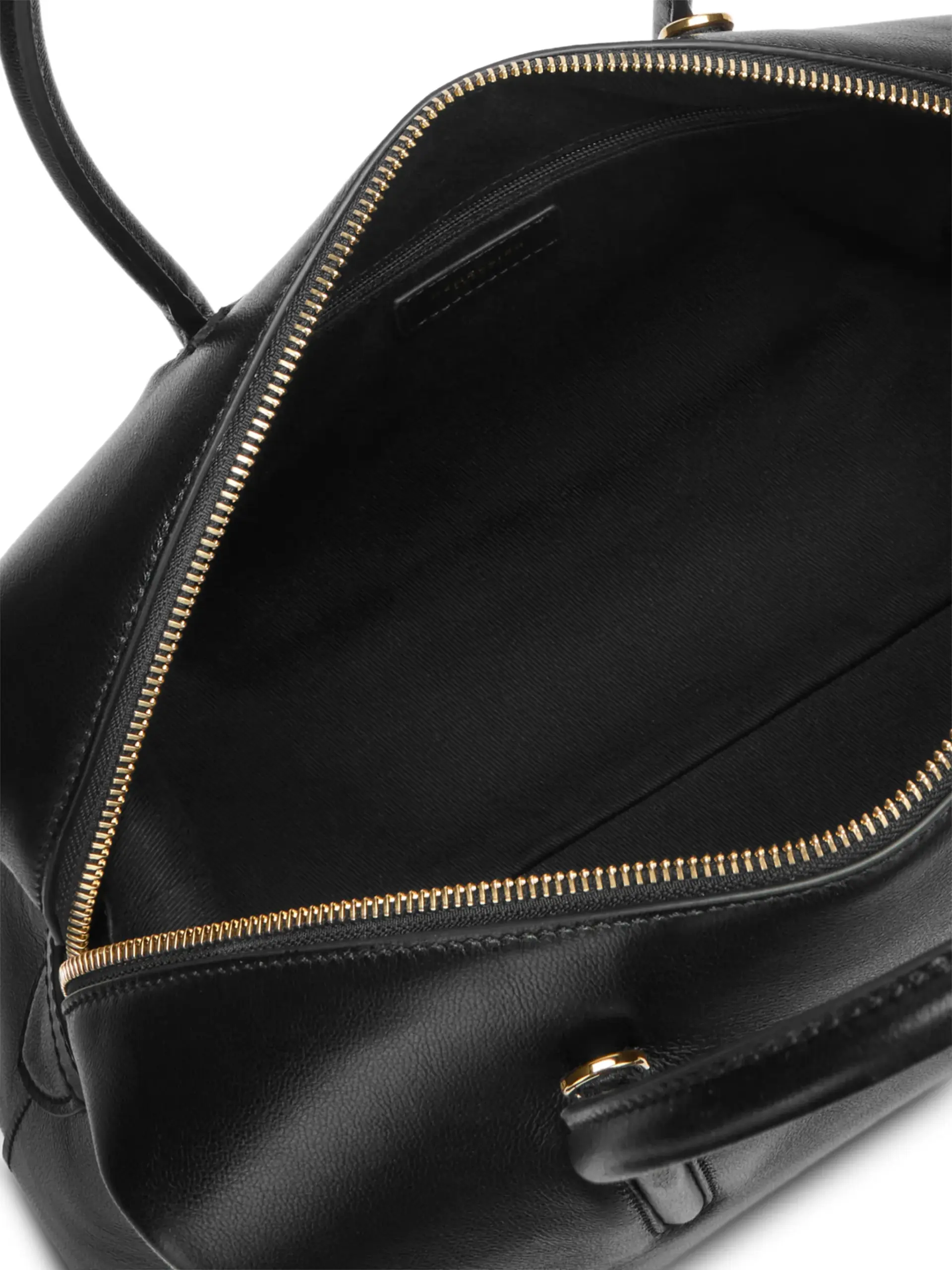 Njezina blago zakrivljena silueta donosi lakoću nošenja dok ručke osiguravaju izdržljivost. Prostrana unutrašnjost čuva bitne stvari na sigurnom zahvaljujući središnjem patentnom zatvaraču, a unutar torbice nalazi se više džepova za svakodnevnu organizaciju. Dizajnirana je sa svestranošću na umu, može se nositi na više načina s odvojivim remenom – u ruci, na ramenu ili kao crossbody model. Ručno je izrađena od talijanske kože mekane brušene kože, a na torbici se nalazi i logotip DeMellier koji je utisnut u torbicu i diskretnog je zlatnog sjaja.