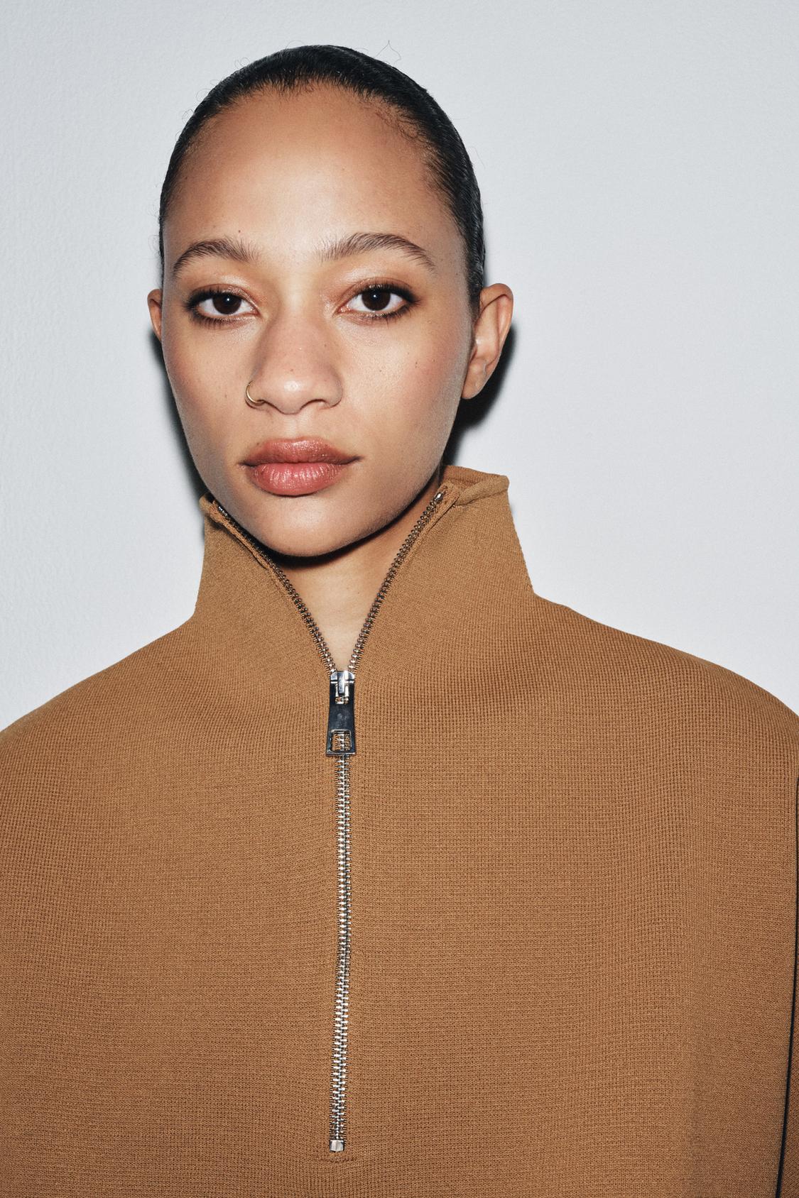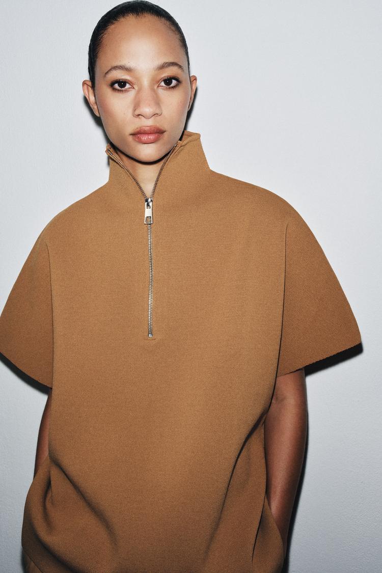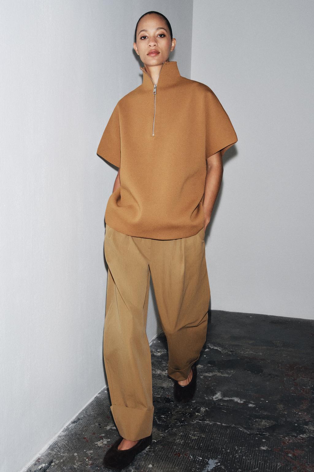 Ako bismo morali izdvojiti jedan komad koji savršeno spaja luksuznu estetiku i pristupačnost high streeta, onda je to ovaj pleteni top u stilu pelerine iz Zare. S podignutim ovratnikom, kratkim rukavima i naglašenim minimalističkim stilom, izgleda poput dizajnerskog komada kakav bismo očekivali pronaći u kolekcijama kuća kao što je Loro Piana – brenda poznatog po svevremenskoj eleganciji i vrhunskim materijalima.