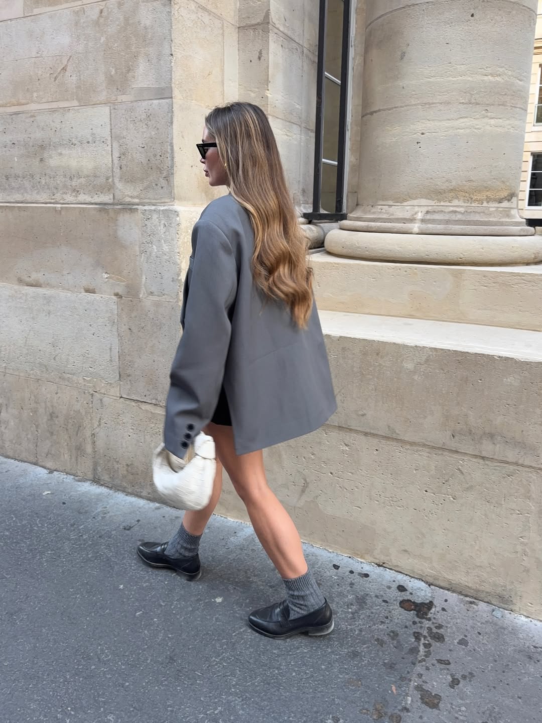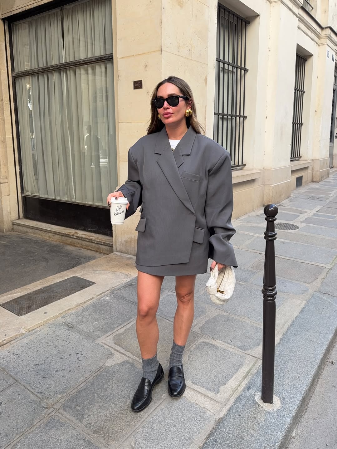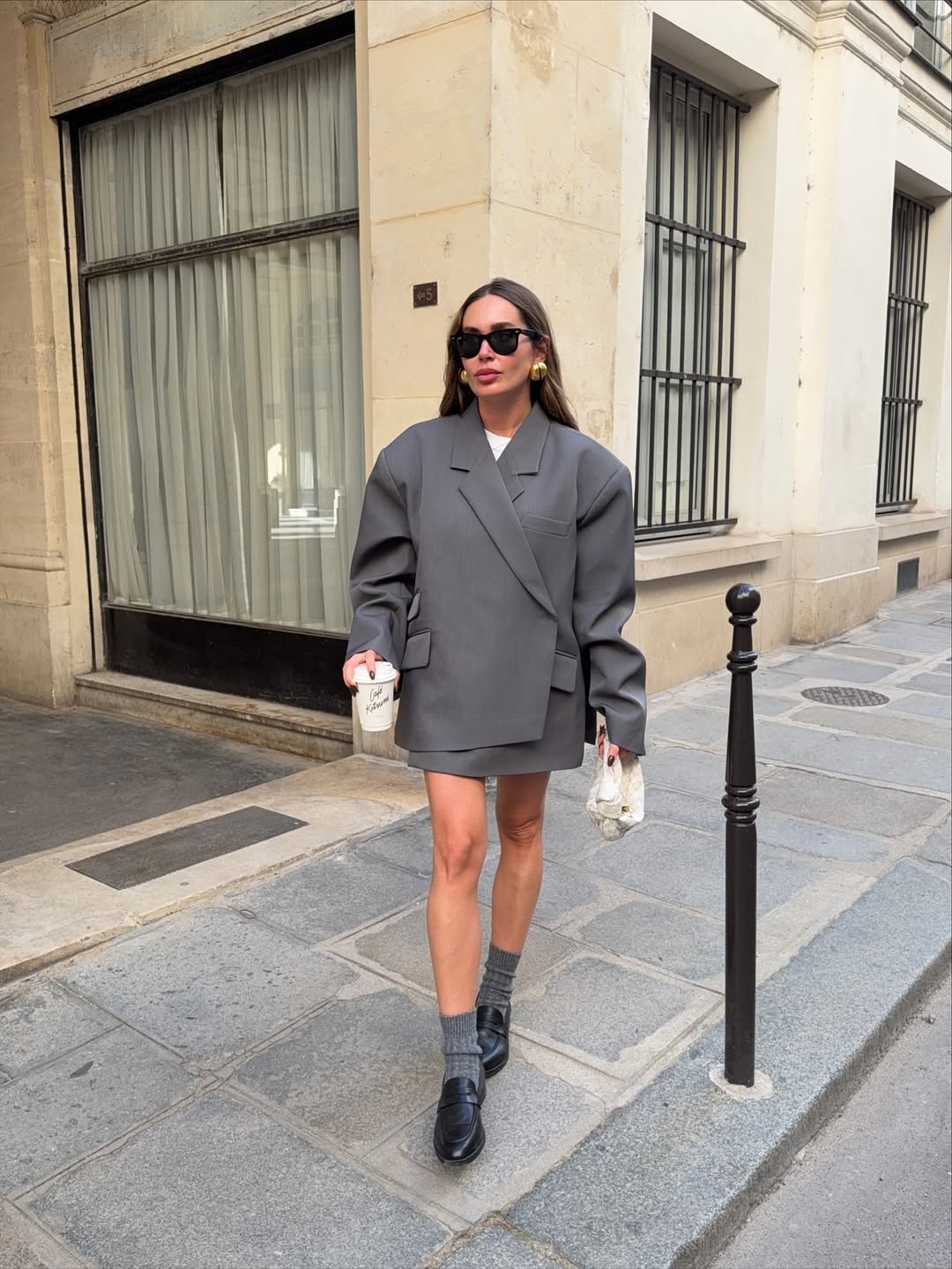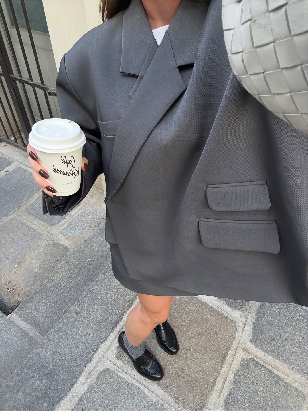 Radi se o kombinaciji predimenzioniranog sakoa s naglašenim ramenima i kratkih hlačica, izrađenih u elegantnoj sivoj nijansi, koji istovremeno odišu profinjenošću i nonšalantnim stilom. Sako naglašava voluminoznu, gotovo arhitektonsku siluetu, dok hlačice daju dašak ležernosti – savršena ravnoteža između stroge poslovne estetike i opuštenog street style looka.