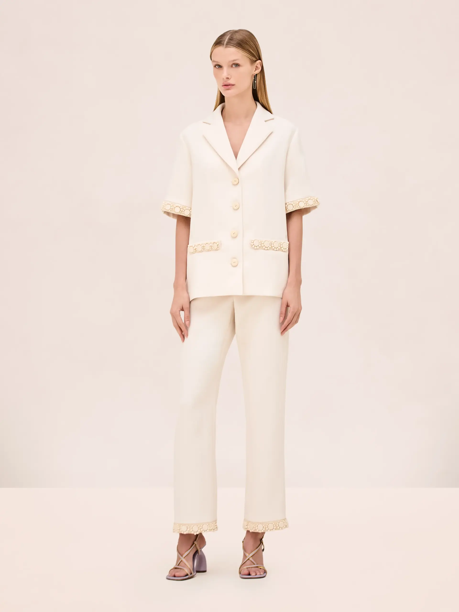 Ono što nas je najviše privuklo za ovaj komplet su detalji perlica u obliku cvijeta koji se nalaze na rukavima, na rubu košulje te na rubu hlača. Koliko god komplet izgledao jednostavno, odiše sofistiranošću i izgleda luksuzno te je baš iz tog razloga odlična kombinacija za nadolazeće tople dane.