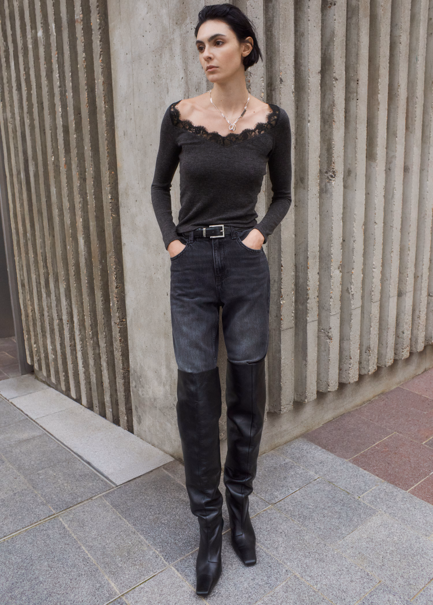 Riječ je o prekrasnoj i elegantnoj majici u tamnosivoj nijansi s dugačkim rukavima i izraženim V-izrezom koji ima crni čipkasti detalj. Materijal djeluje mekano, a izrađen je od kombinacije poliestera, viskoze i elastana. Ovaj komad lagano je pripijen uz tijelo, pa naglašava siluetu, a da ne izgleda previše usko.