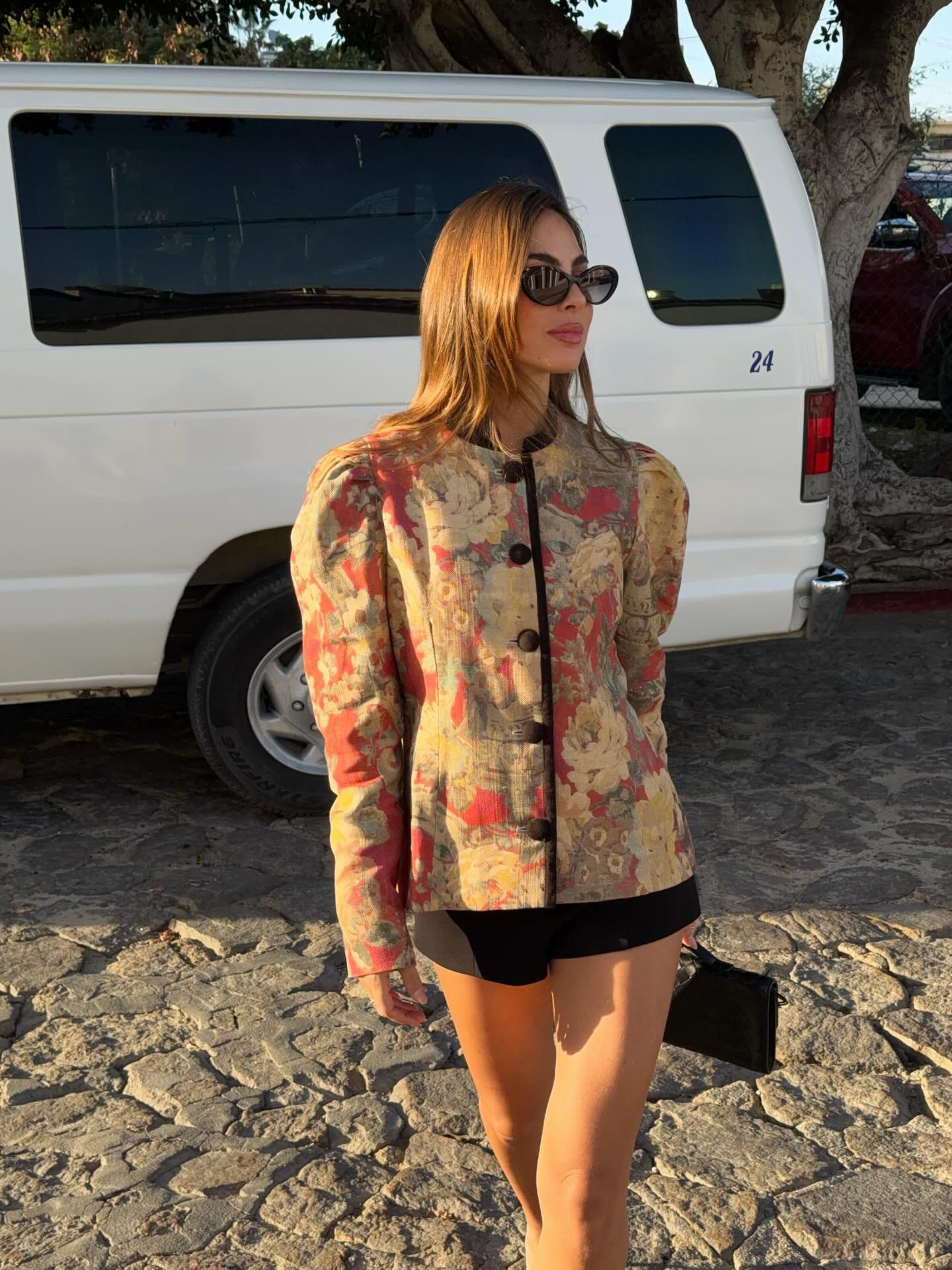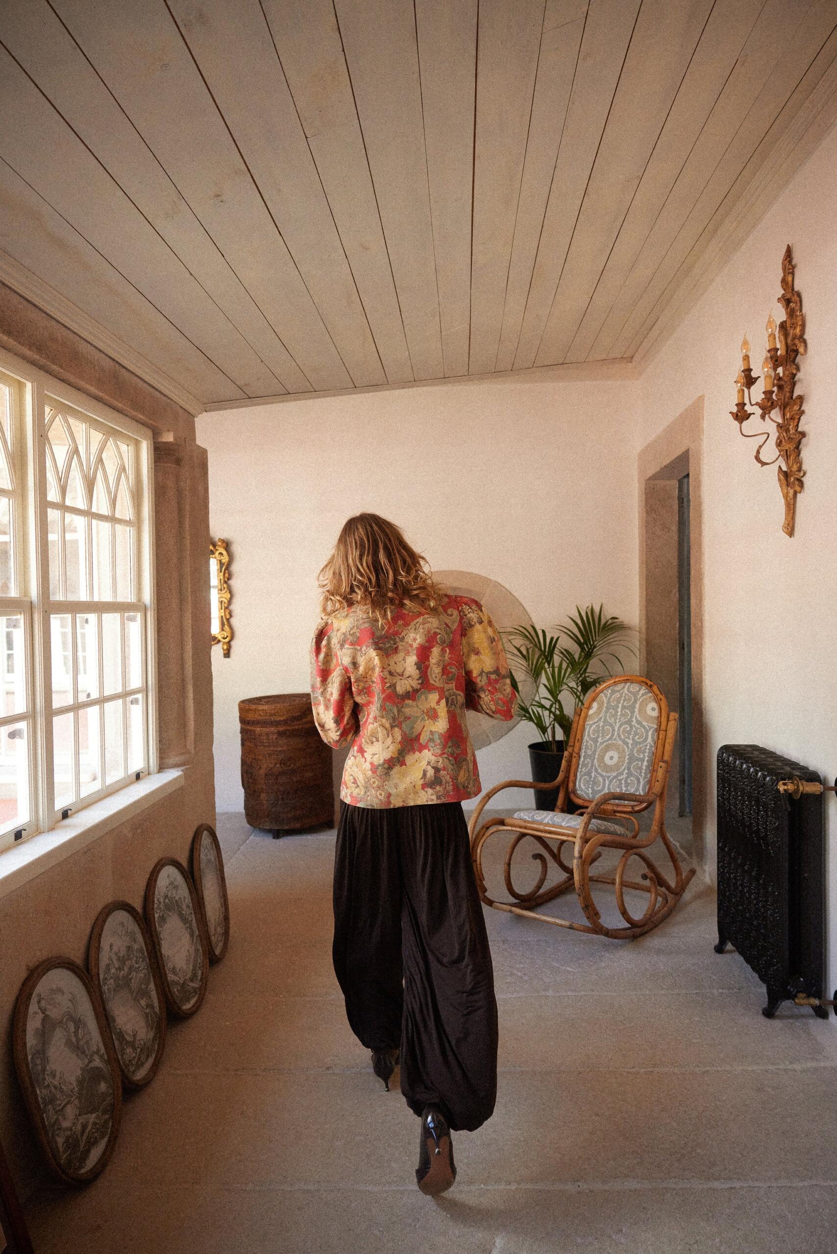 Sako pod nazivom Filipa privukao nam je pažnju zbog raskošnog uzorka i kontrastnih poruba i gumbiju. Sako je ručno izrađen u Španjolskoj i napravljen je od 100-postotnog pamuka. Inspiriran je vintage kreacijama, pa ga zato krasi raskošan cvjetni uzorak u toplim nijansama crvene, žute i zelene, što dodatno doprinosi retro izgledu.
