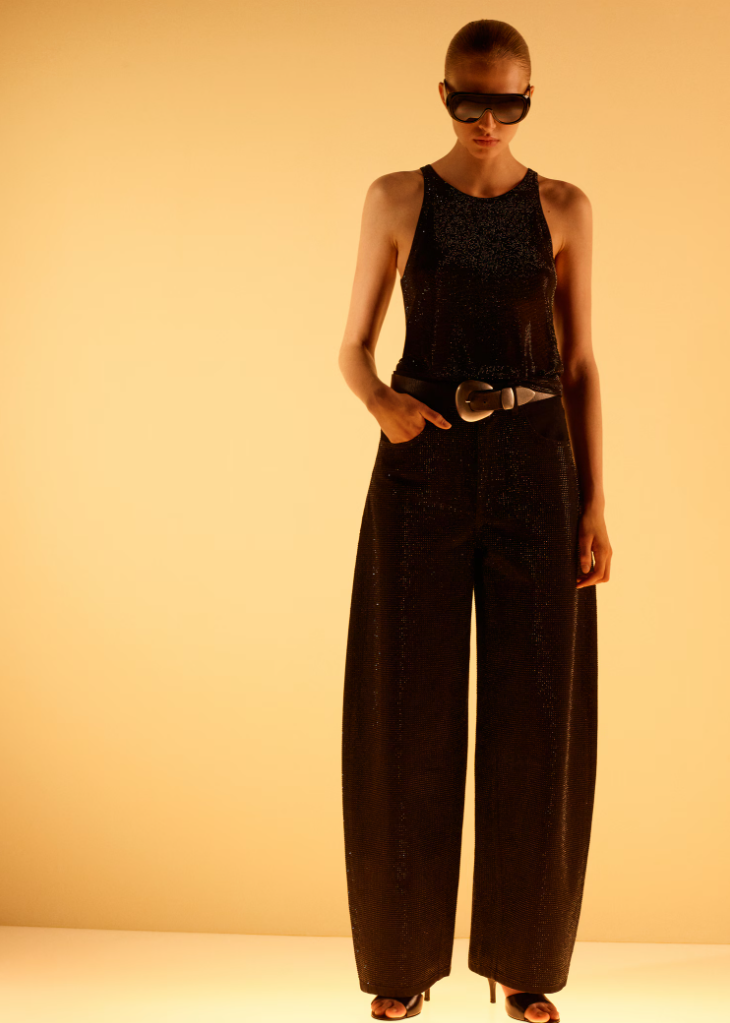 Ove traperice napravljene su od crnog trapera, što im daje profinjen dojam i čini ih idealnima za sve party outfite, od nešto opuštenijeg izlaska uz koktele do svečanih blagdanskih večeri. Balon kroj stvara moderan, pomalo dramatičan volumen koji izgleda izrazito chic, dok sitni ukrasni kristalići daju upravo onoliko sjaja koliko treba da naglase da se radi o posebnom komadu. U praksi to znači da ćete zahvaljujući samo jednim trapericama izgledati sređeno i stylish bez pretjeranog truda.